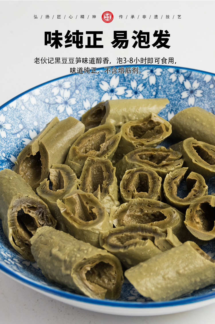 【食用方法】老伙记开江豆笋是干货,使用前用冷水浸泡3-5个小时(不能用开水浸泡),要劲道就泡发时间和烹制间短点,本品适合凉拌、炒、炖、烧、卤等。
