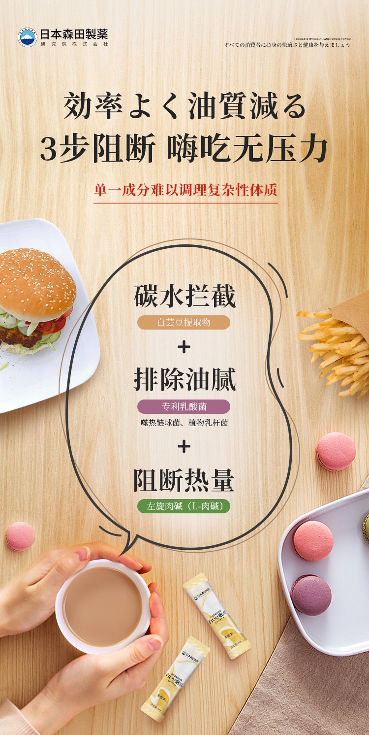 森田制药研发,它是能够快速提高基础代谢的同时,减少身体对脂肪转化,然后将体内的油脂排出,不同于其他增强饱腹感的产品~而且很好喝!