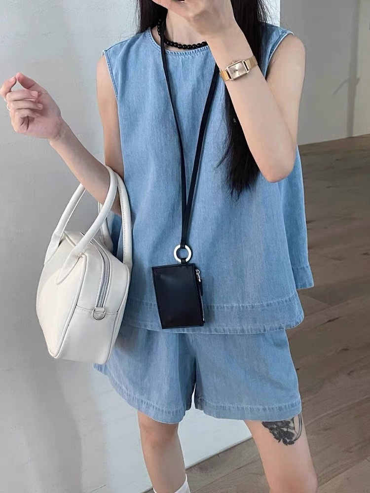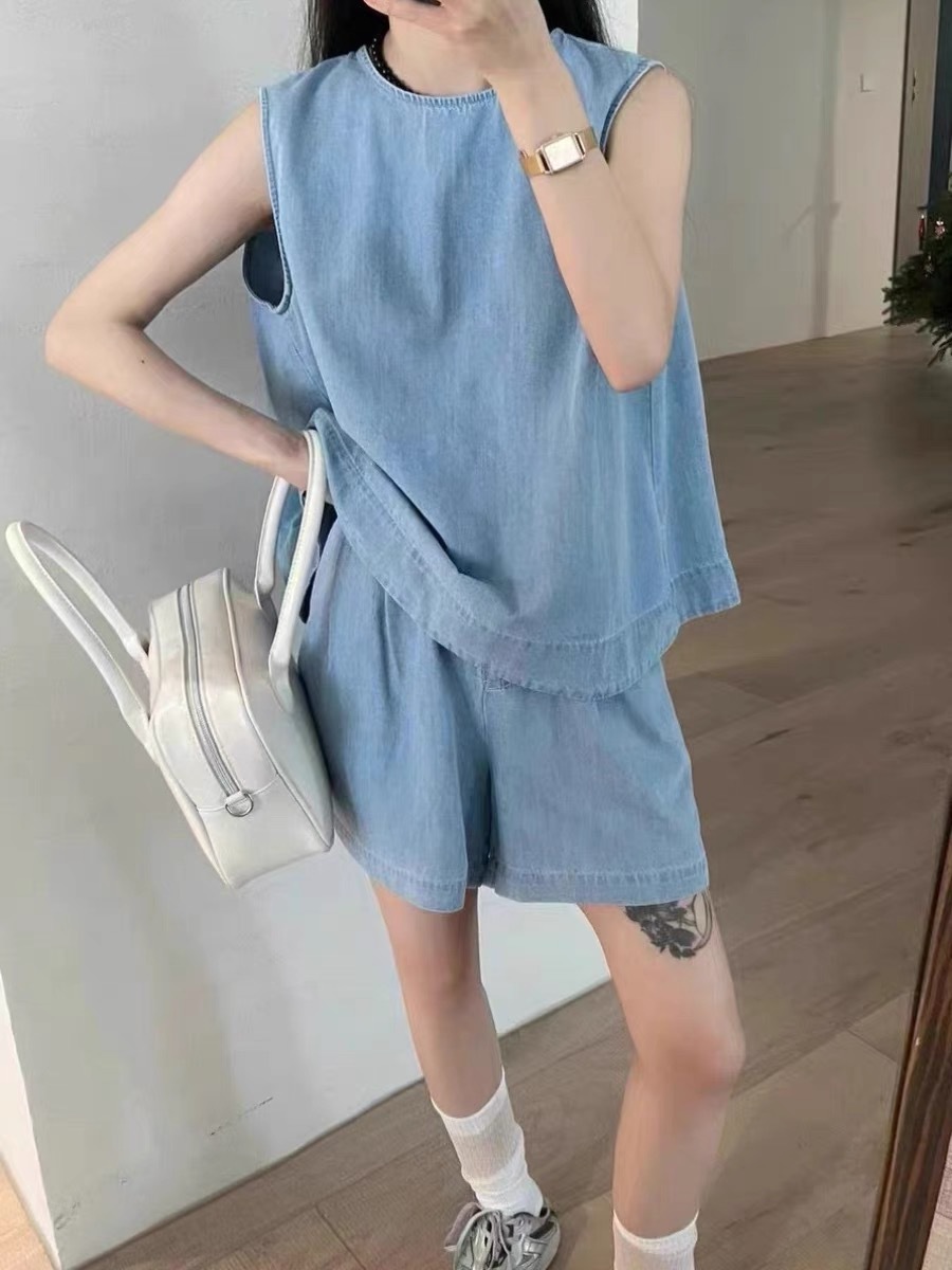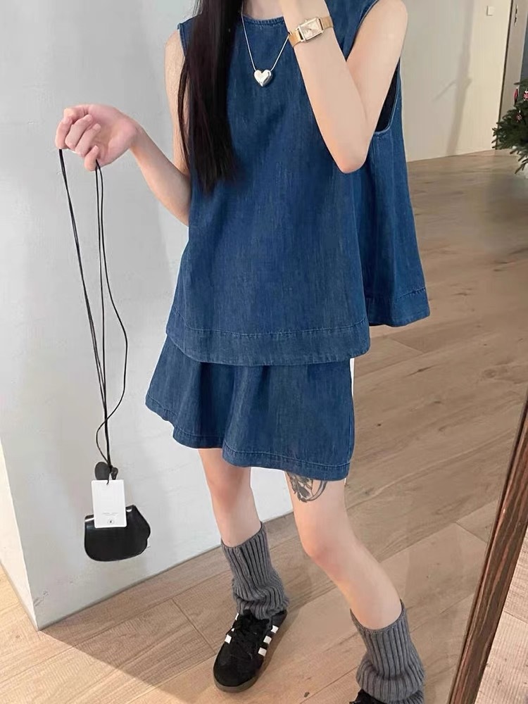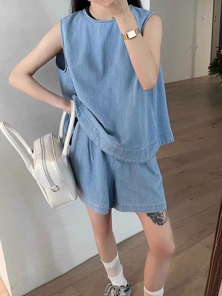 【新款仿牛仔背心套装】夏季 韩系显瘦无袖上衣 松紧腰短裤两件套