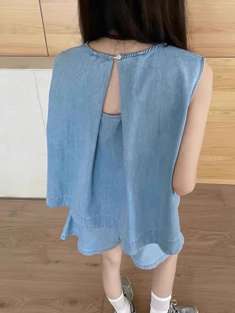 【新款仿牛仔背心套装】夏季 韩系显瘦无袖上衣 松紧腰短裤两件套 商品图4