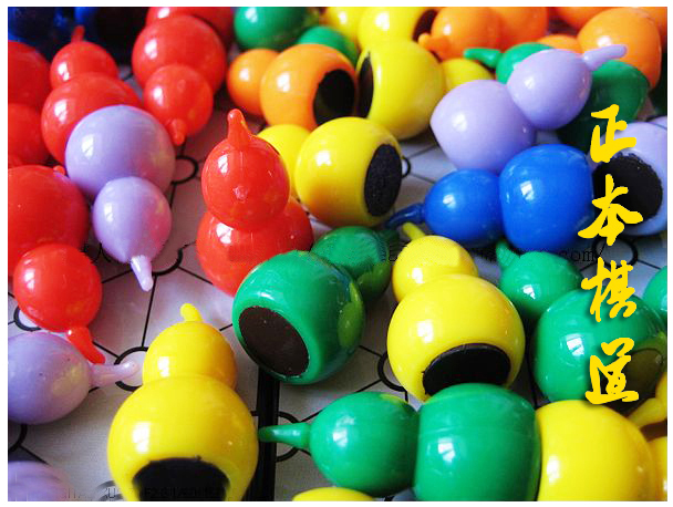 棋子:棋子为6种颜色(红、黄、蓝、绿、橙、紫)每种色10个棋子,所有棋子均为塑料葫芦造型,特别惹小朋友喜爱,