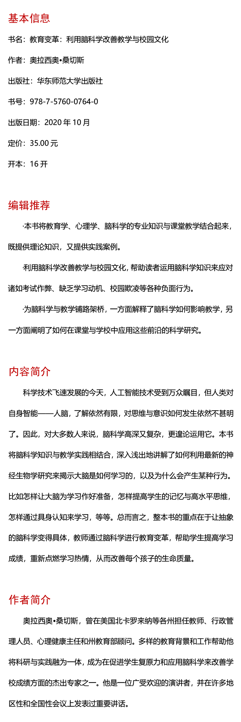 ·本书将教育学、心理学、脑科学的专业知识与课堂教学结合起来,既提供理论知识,又提供实践案例。·利用脑科学改善教学与校园文化,帮助读者运用脑科学知识来应对诸如考试作弊、缺乏学习动机、校园欺凌等各种负面行为。·为脑科学与教学铺路架桥,一方面解释了脑科学如何影响教学,另一方面阐明了如何在课堂与学校中应用这些前沿的科学研究。
