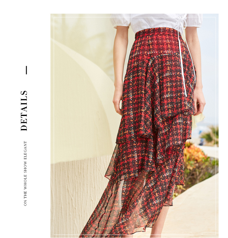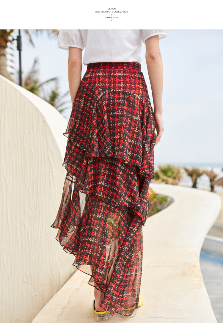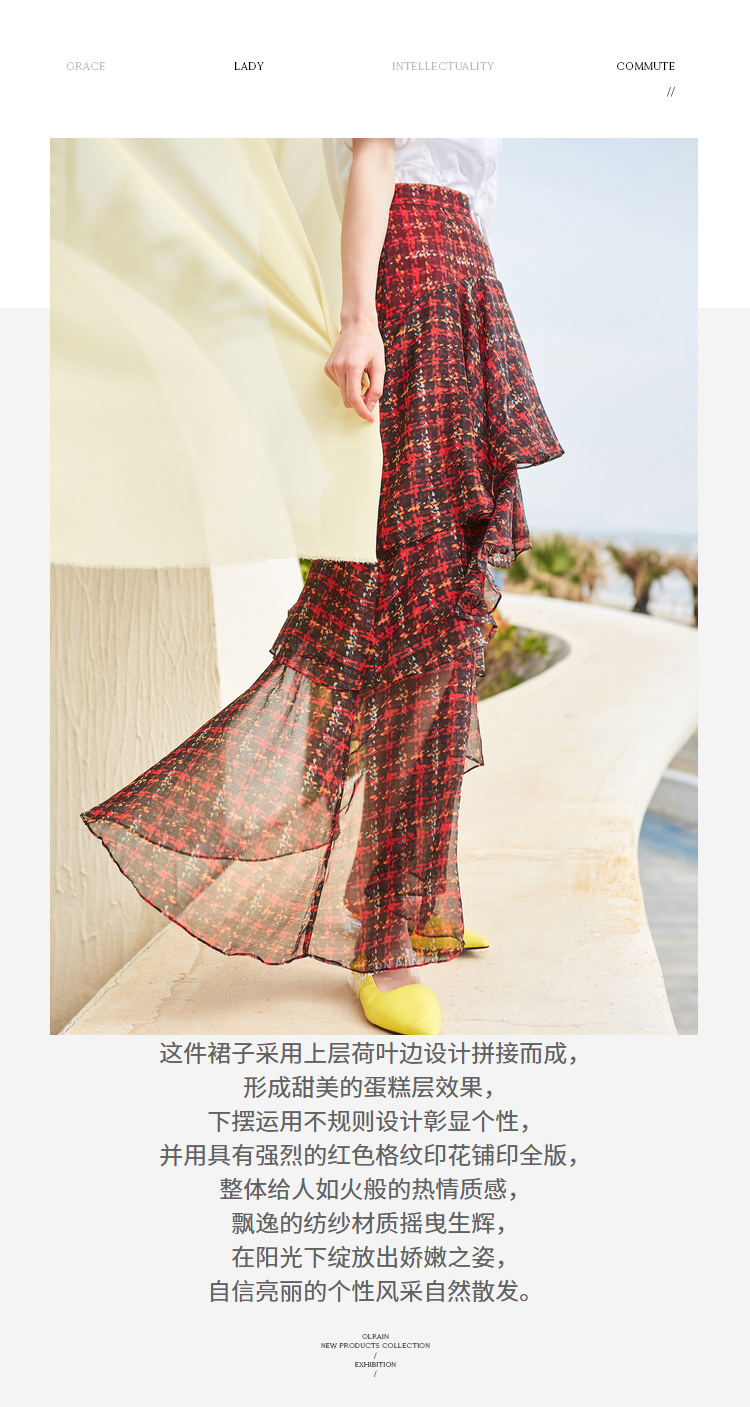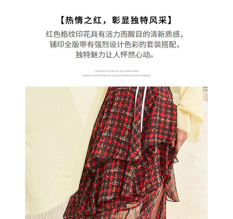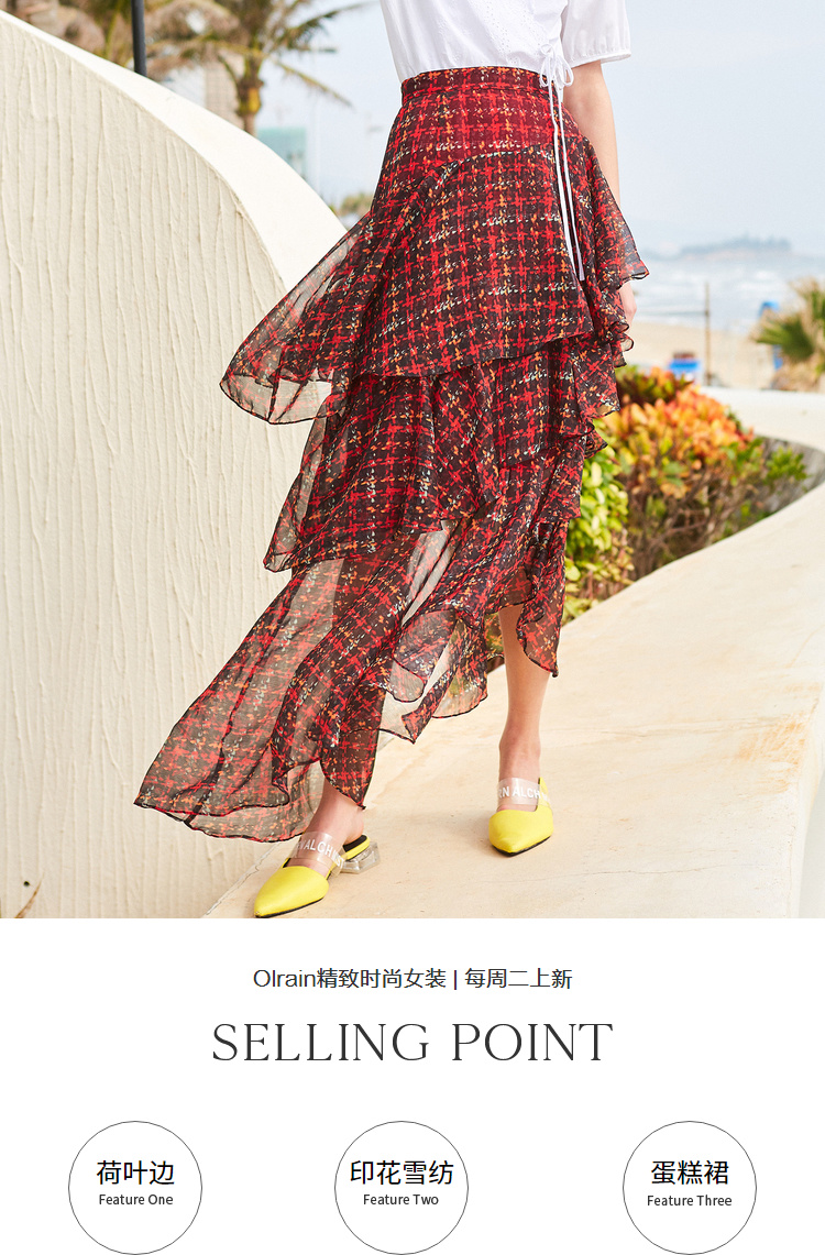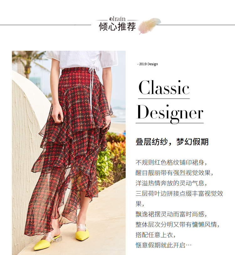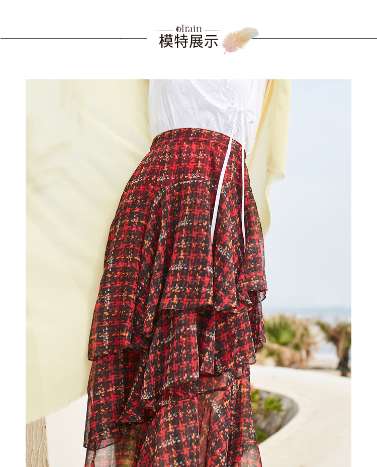 欧芮儿格子半身裙女中长款夏装2019新女装红色叠叠裙女裙中长款