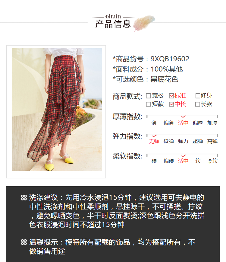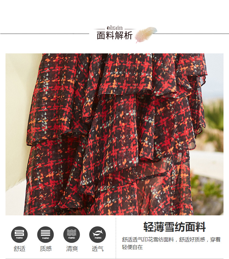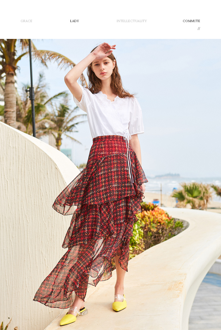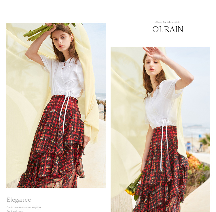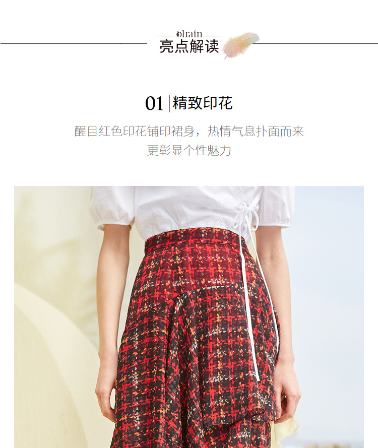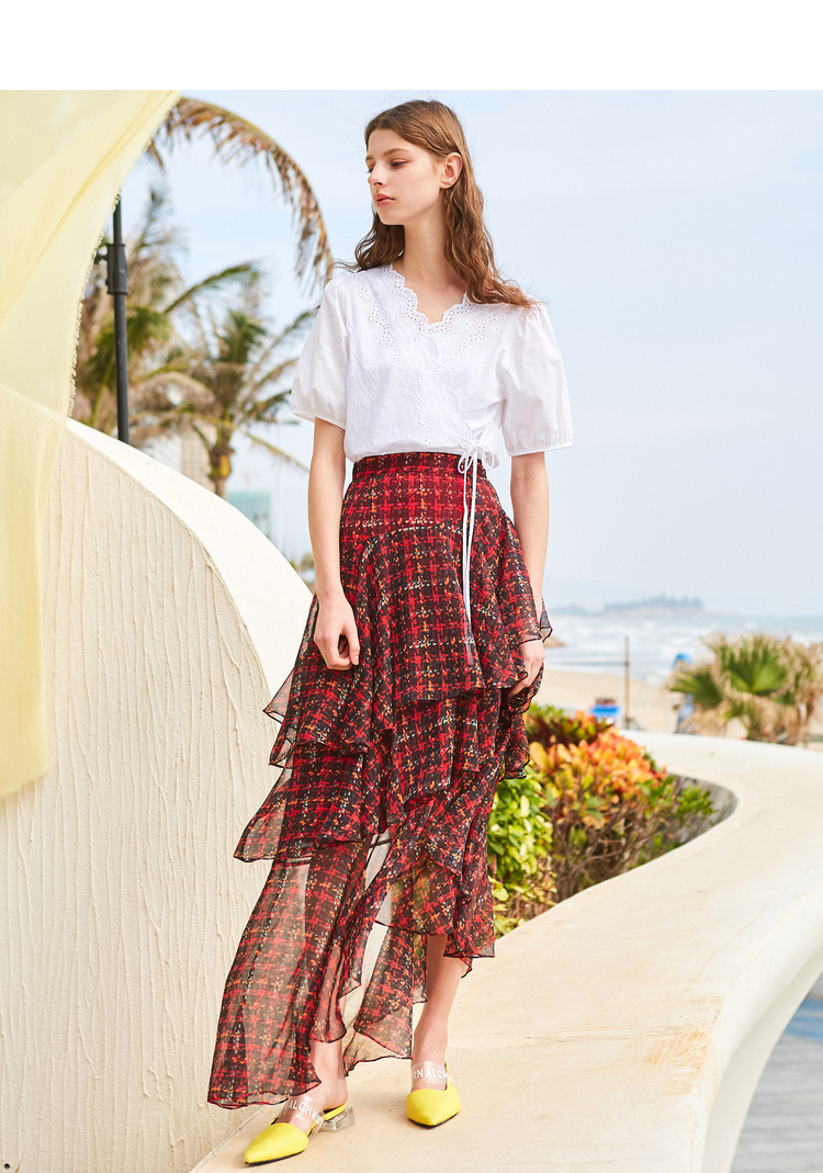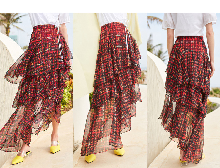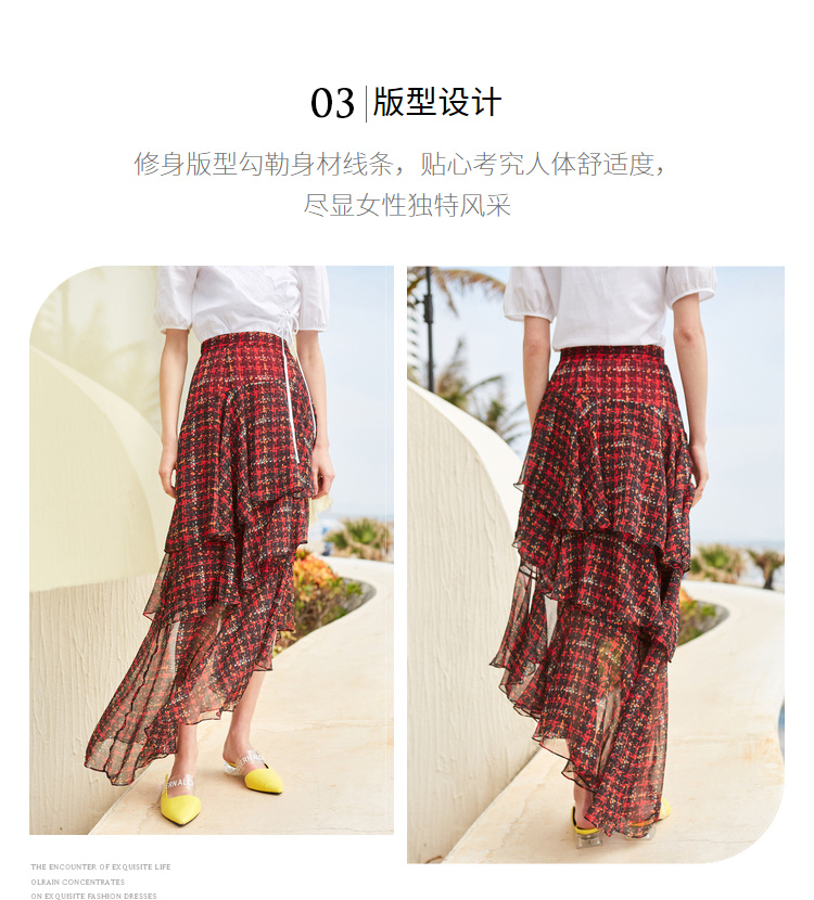 欧芮儿格子半身裙女中长款夏装2019新女装红色叠叠裙女裙中长款