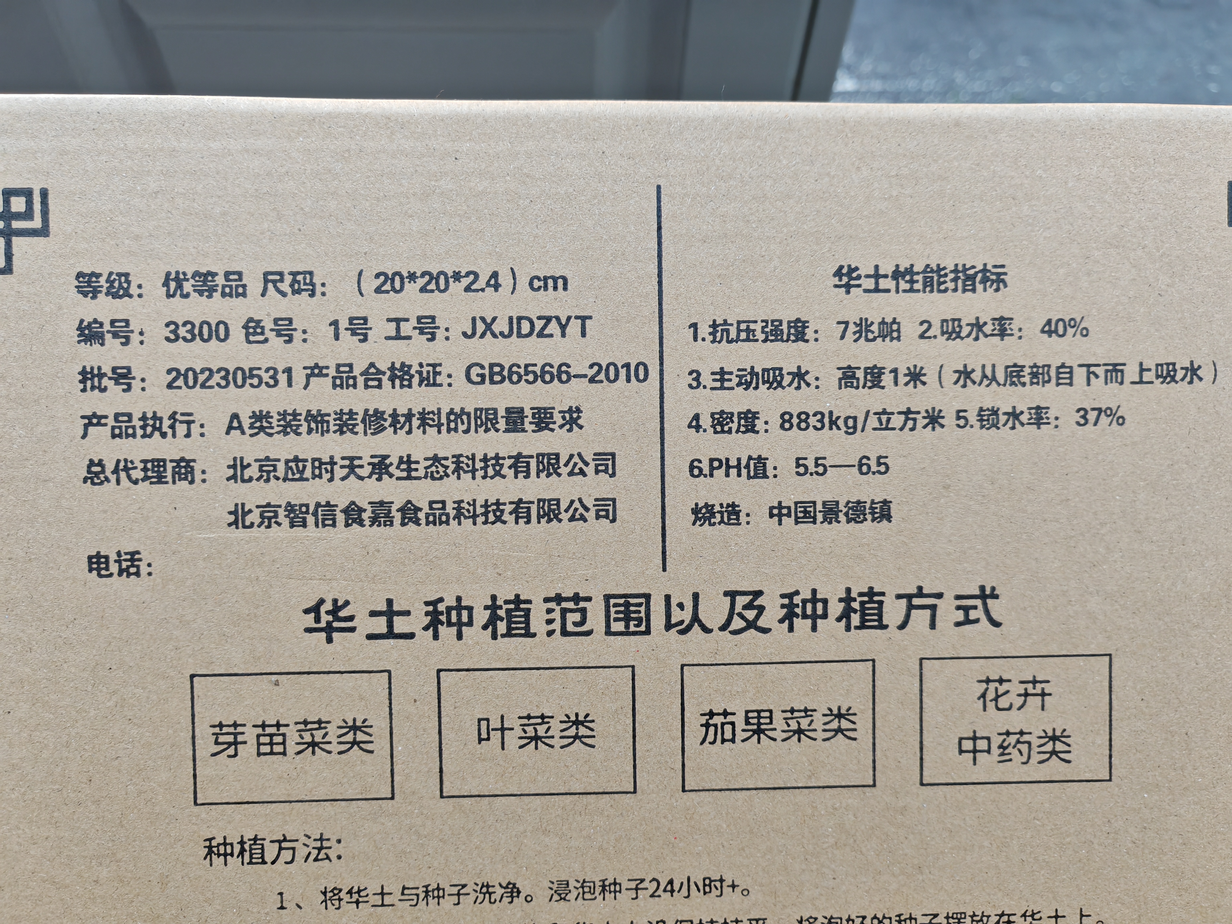商品名称:华土陶瓷种植板 产品规格尺码:(20*20*2.4)cm 等级:优等品 编号:3300 色号:1号 工号:JXJDZYT 批号:20230531 产品合格证:GB6566-2010 产品执行:A类装饰装修材料的限量要求 总代理商: 北京应时天承生态科技有限公司 北京智信食嘉食品科技有限公司 产地:江西景德镇 发货地:河北廊坊 发货快递:京东 发货时效:48小时 不发货地区:西藏、新疆 加运费地区:云南,海南,青海+15元运费/套