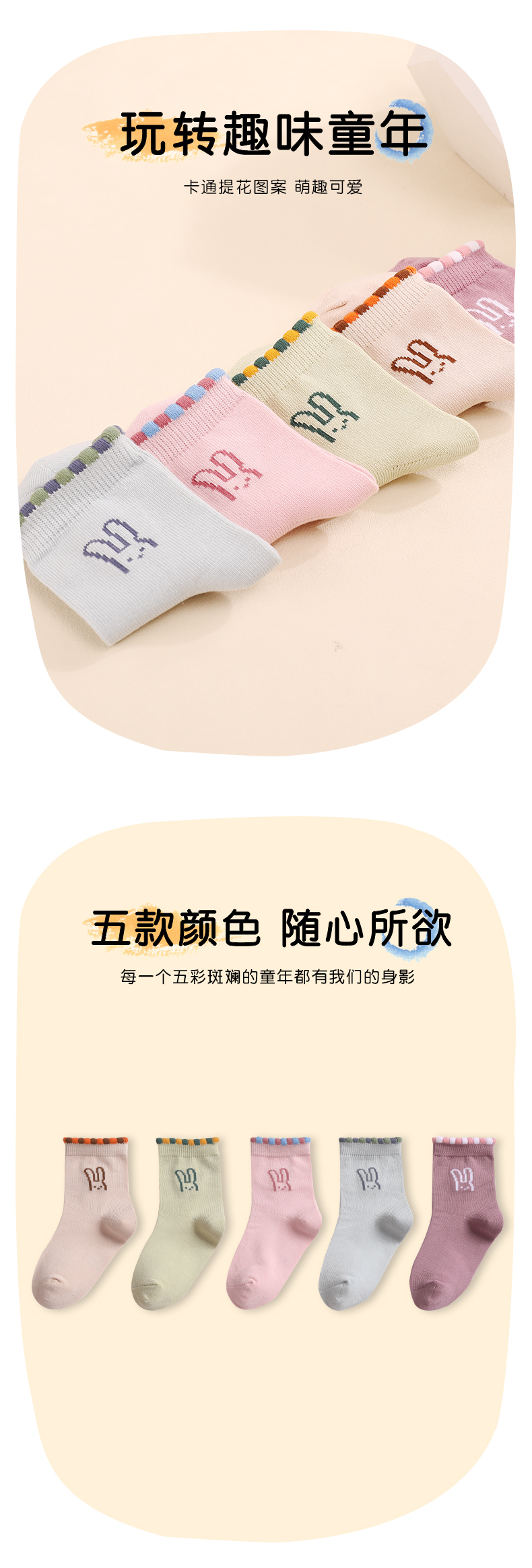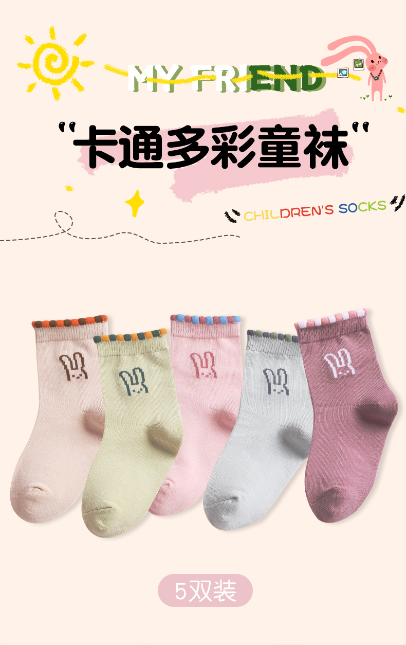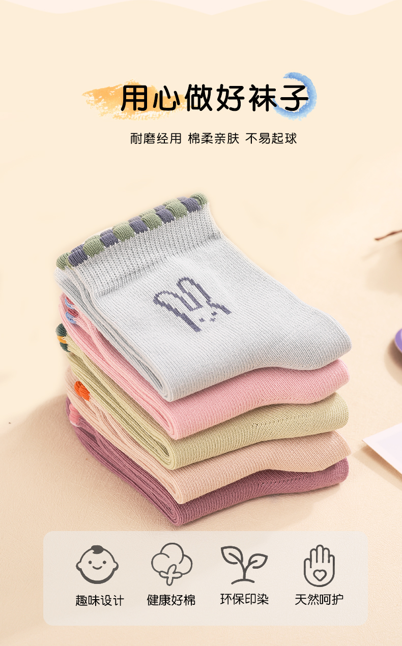 洁丽雅5双装童袜中筒袜子儿童袜新疆棉可爱印花亲肤柔软袜子小孩