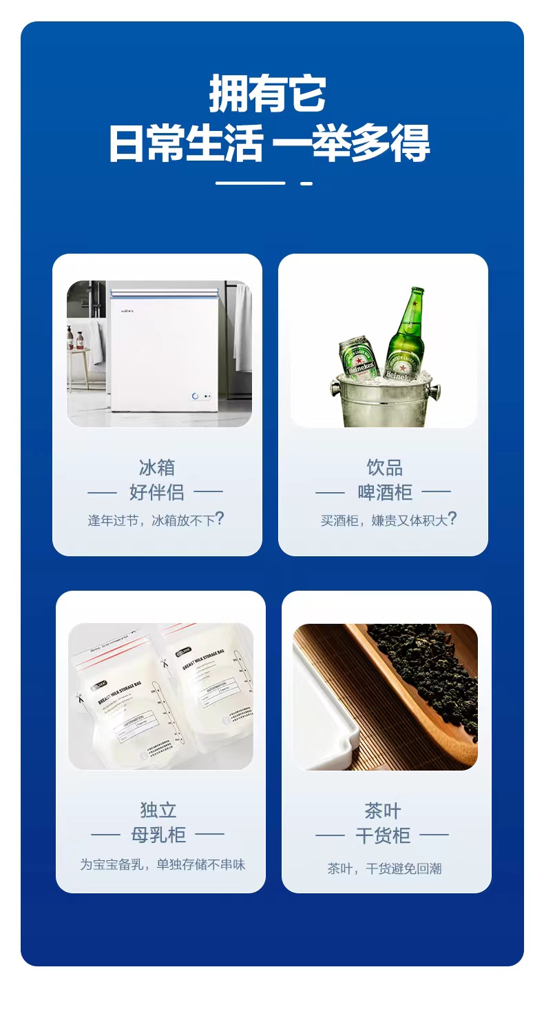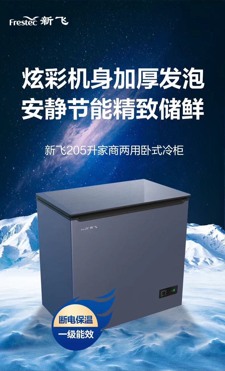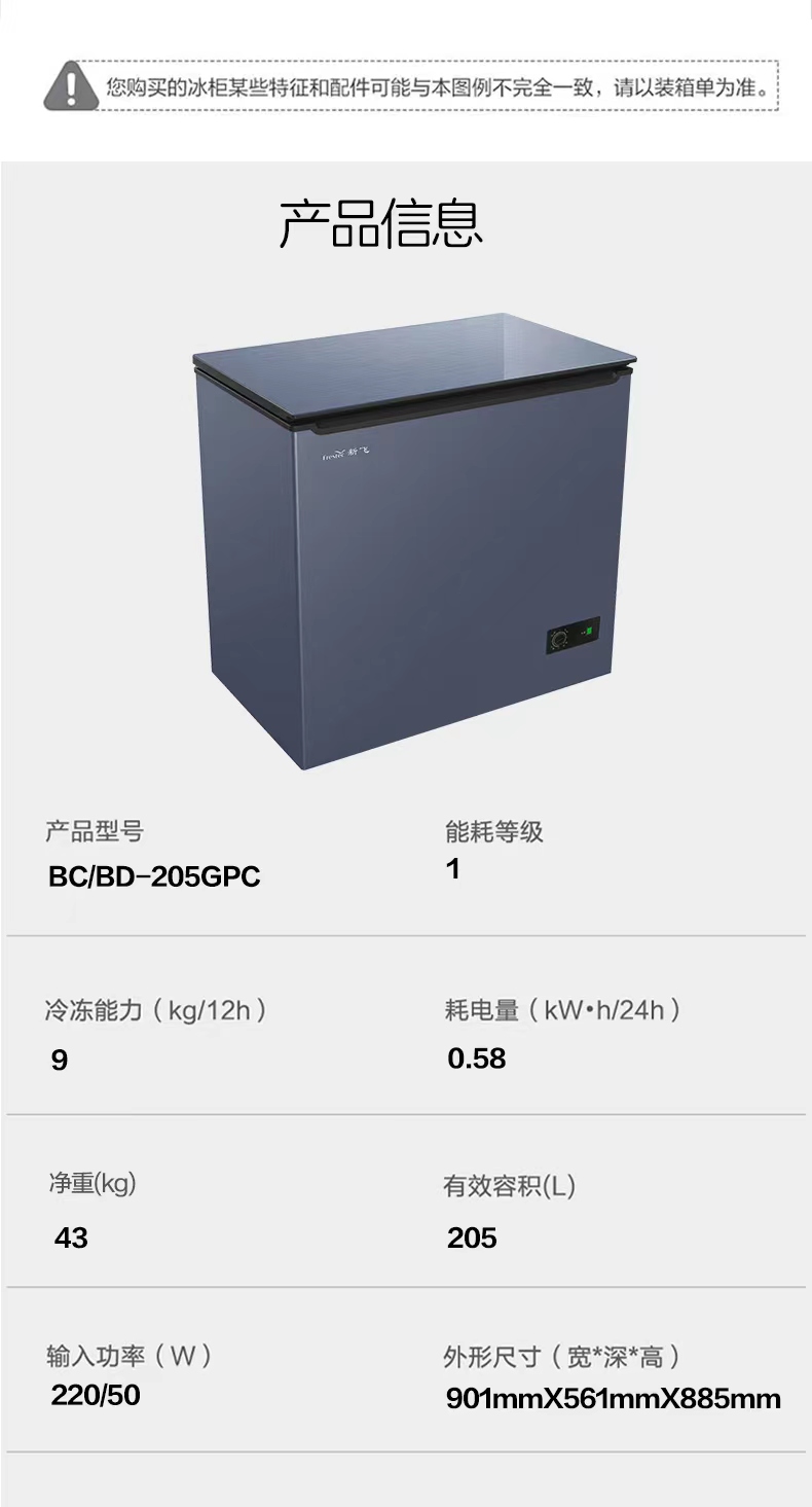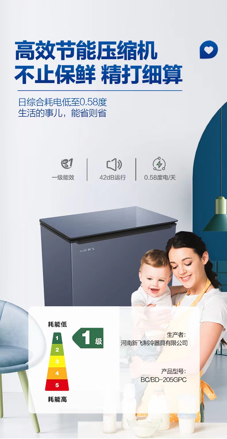新飞 冰柜 BC/BD-205GPC 205升 单温 变频 一级能效 顶开门 机械控温 彩金玻璃面板 蓝色系