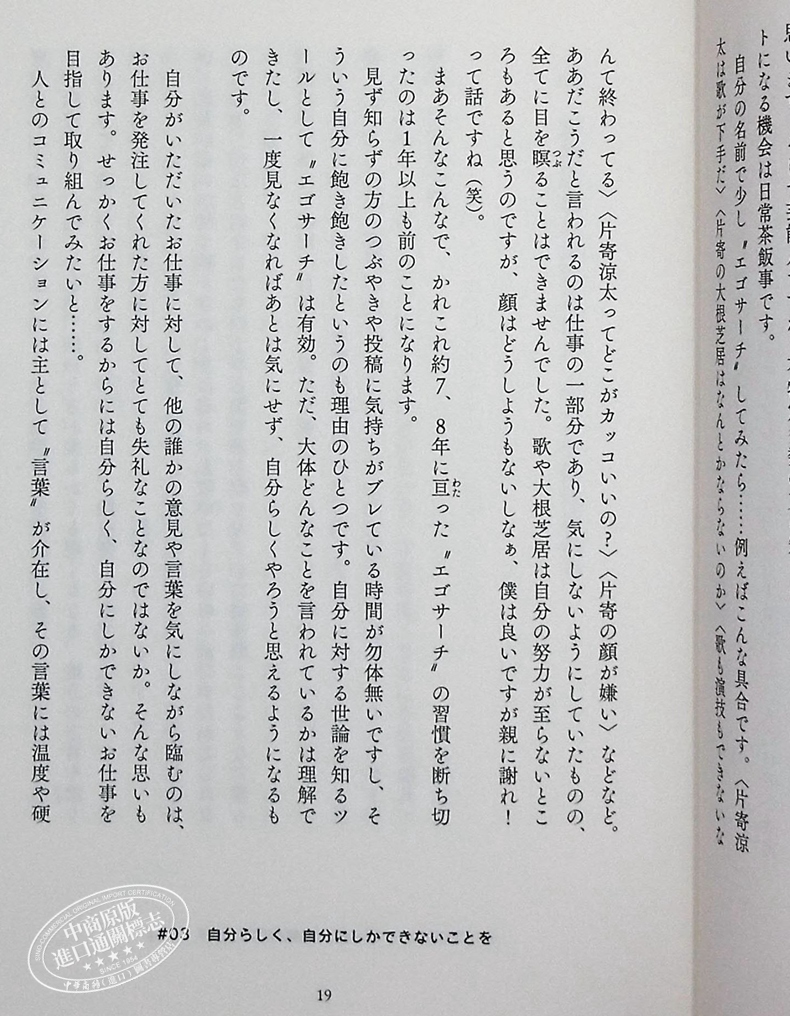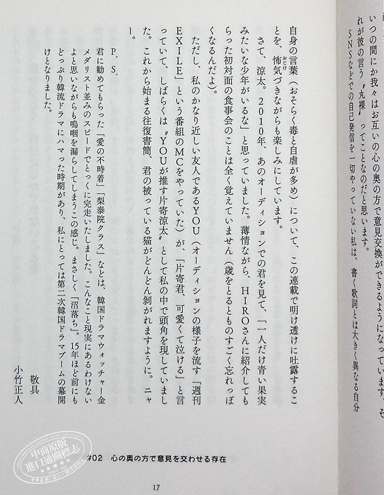 最も信頼する作詞家が引き出した、本人も気づいていなかった「素の片寄涼太」。GENERATIONS from EXILE TRIBE のヴォーカル·片寄涼太と、彼をデビュー前から知る作詞家·小竹正人。二人の出会いや懐かしい出来事、それぞれの家族の話や恋愛観、結婚観まで、戦友のような二人が互いに宛てた往復書簡集。「こんな涼太、見たことない!」と小竹に言わしめた撮り下ろしグラビア16ページと巻末に特別対談も収録。