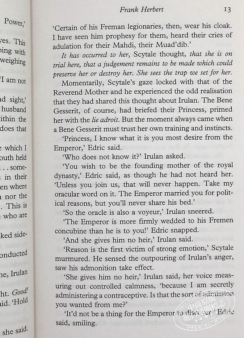 当以前的盟友阴谋推翻保罗,甚至他自己的妃子也对他不利时,保罗接受了Tleilaxu的礼物,一个基因操纵者的公会,希望能在背叛和混乱中找到和平和友谊的唯一火花。但这一行为破坏了保罗从弗曼人(他自己的人民)那里得到的支持。弗曼人是保罗权力的真正来源;失去他们是可以真正颠覆他的帝国的一件事。