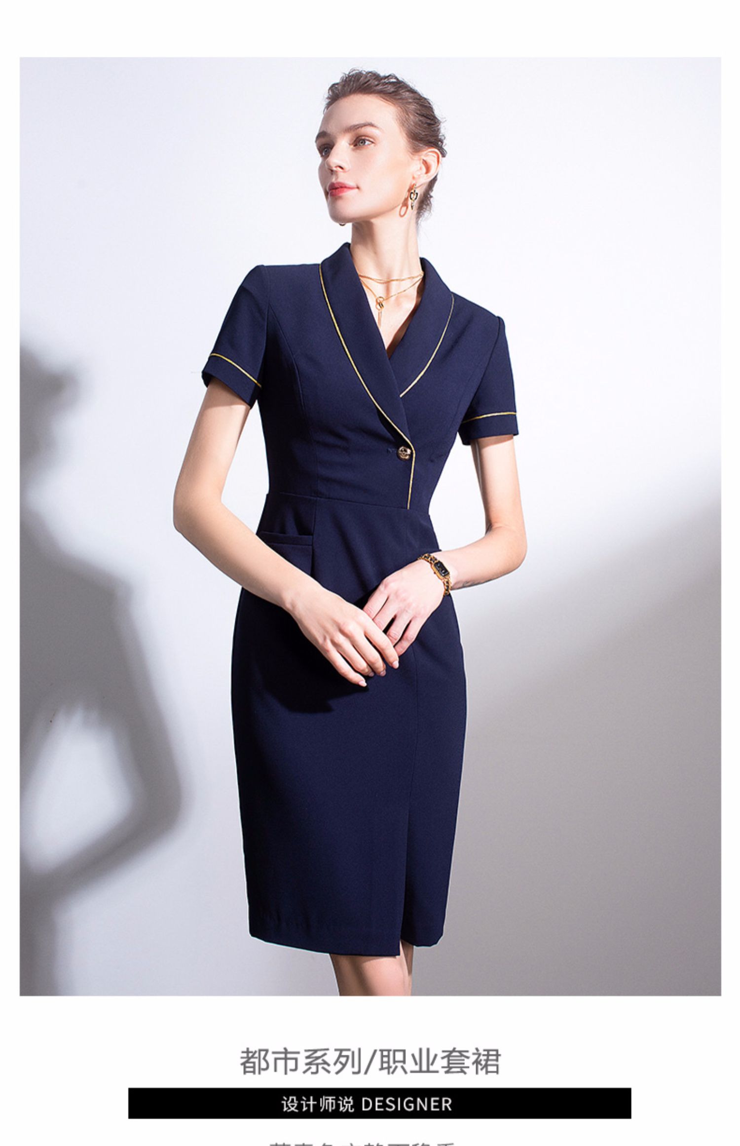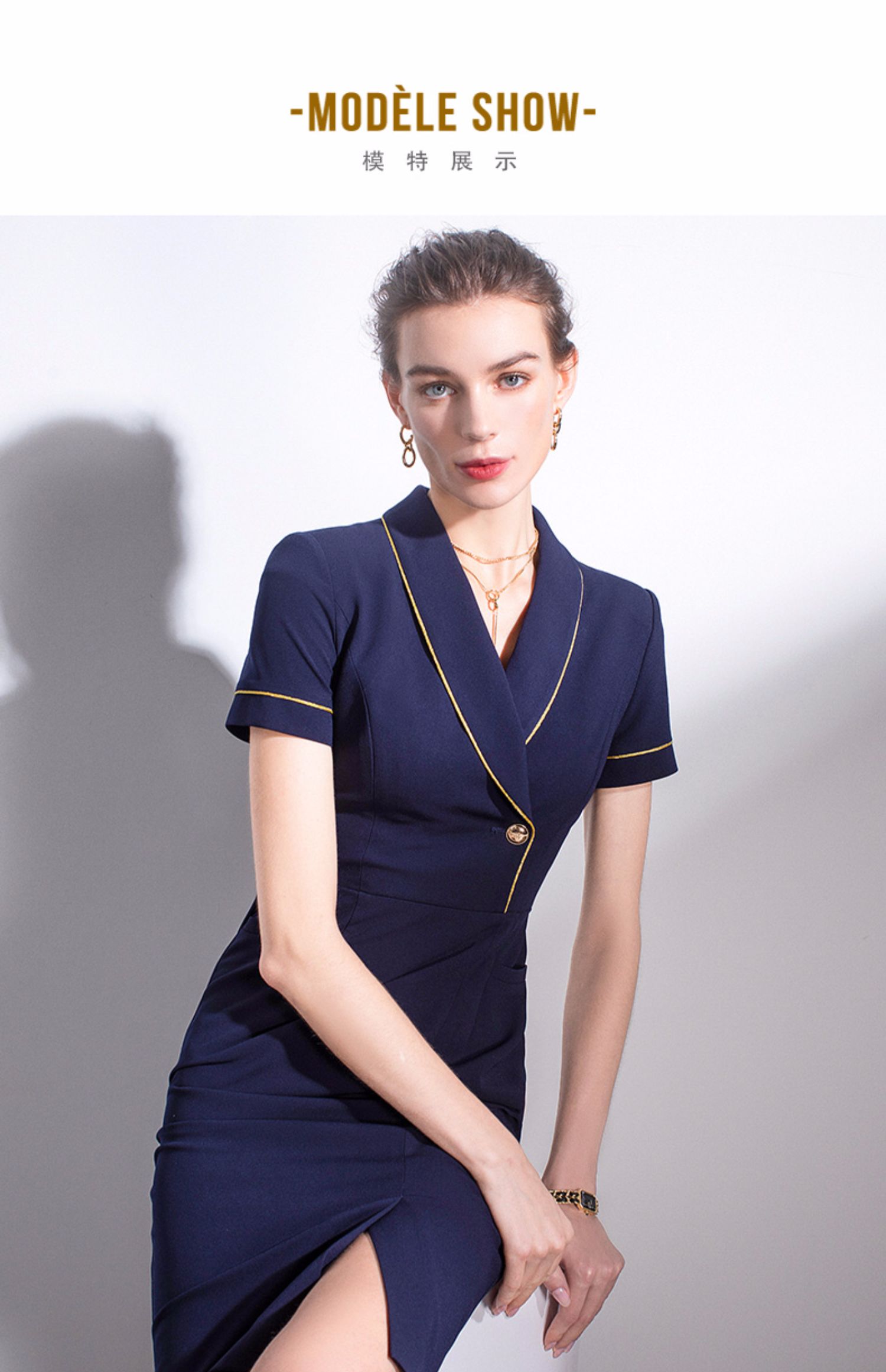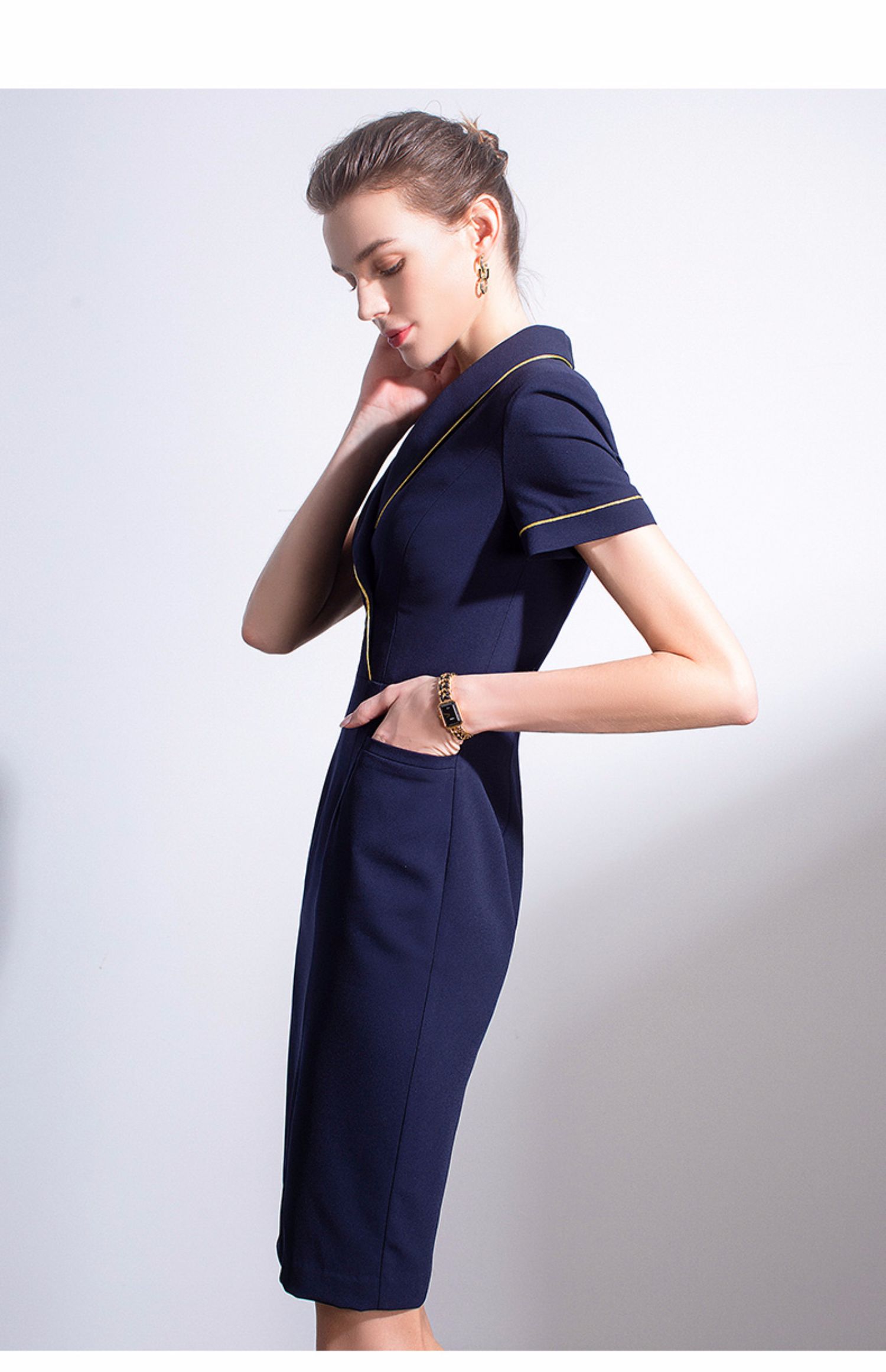 IWY/藏青色职业连衣裙滚边设计优雅知性收腰修身空姐商务正装西装 Q587