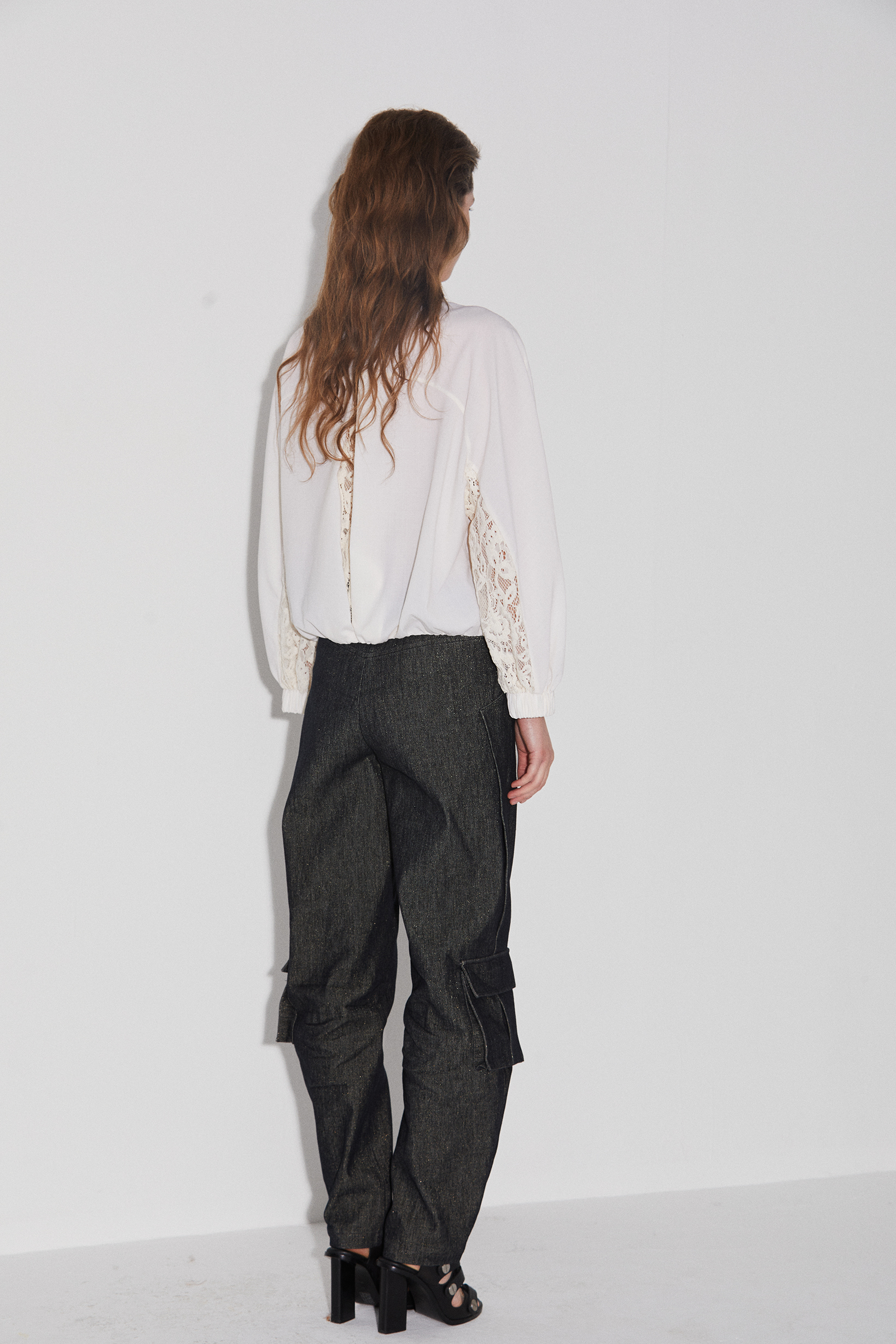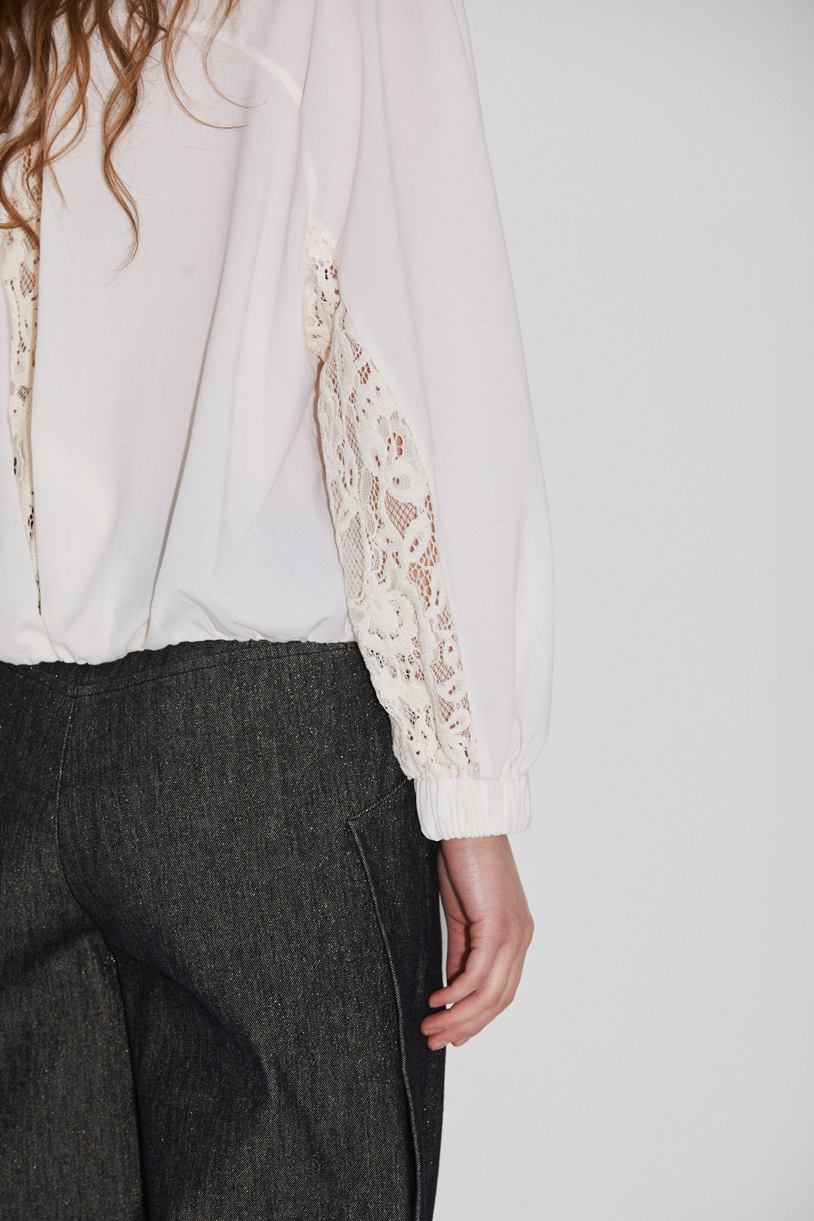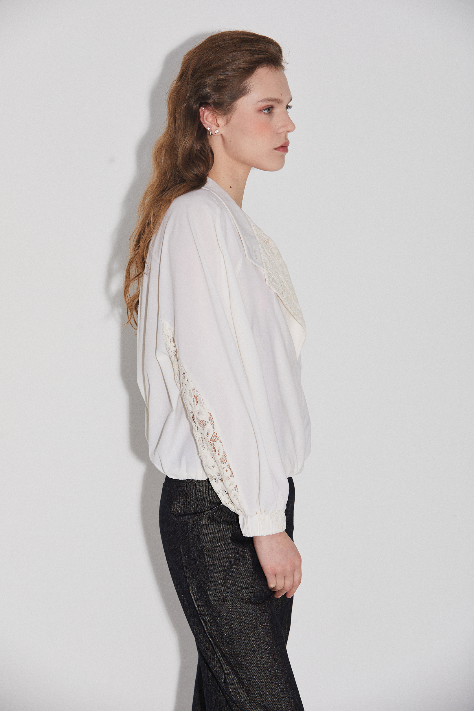 法式极简细节设计感V领蕾丝拼接 羊毛短款休闲衬衫