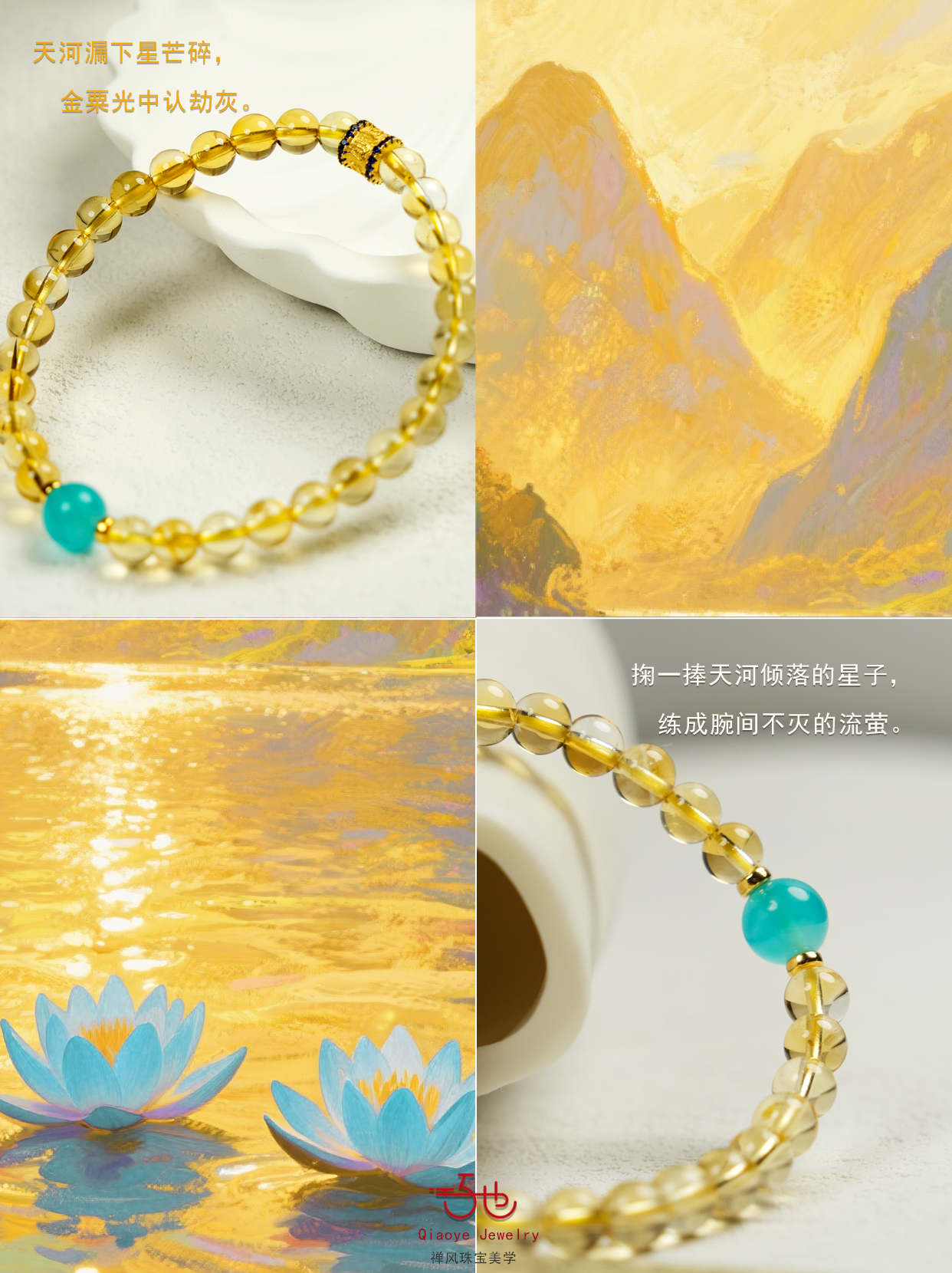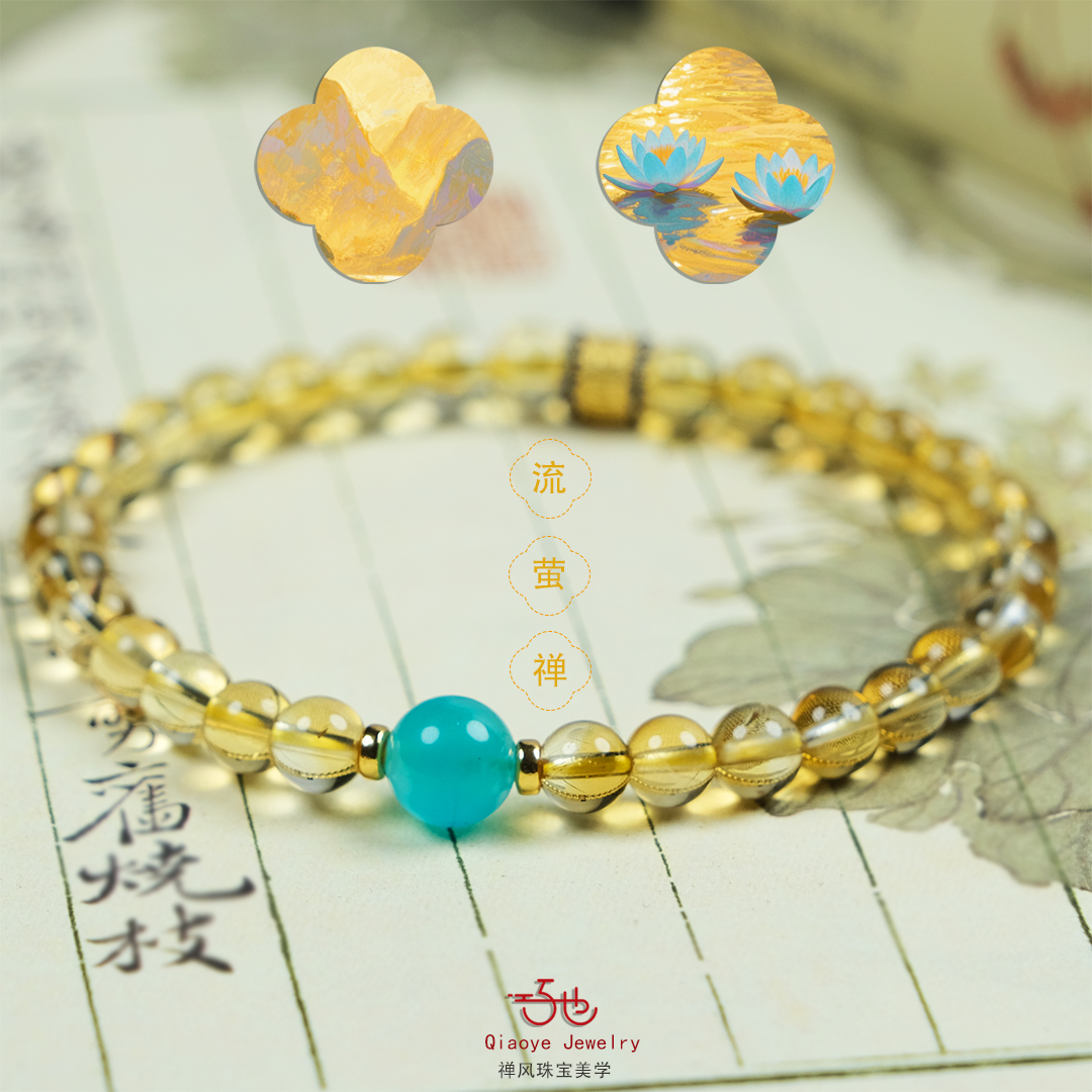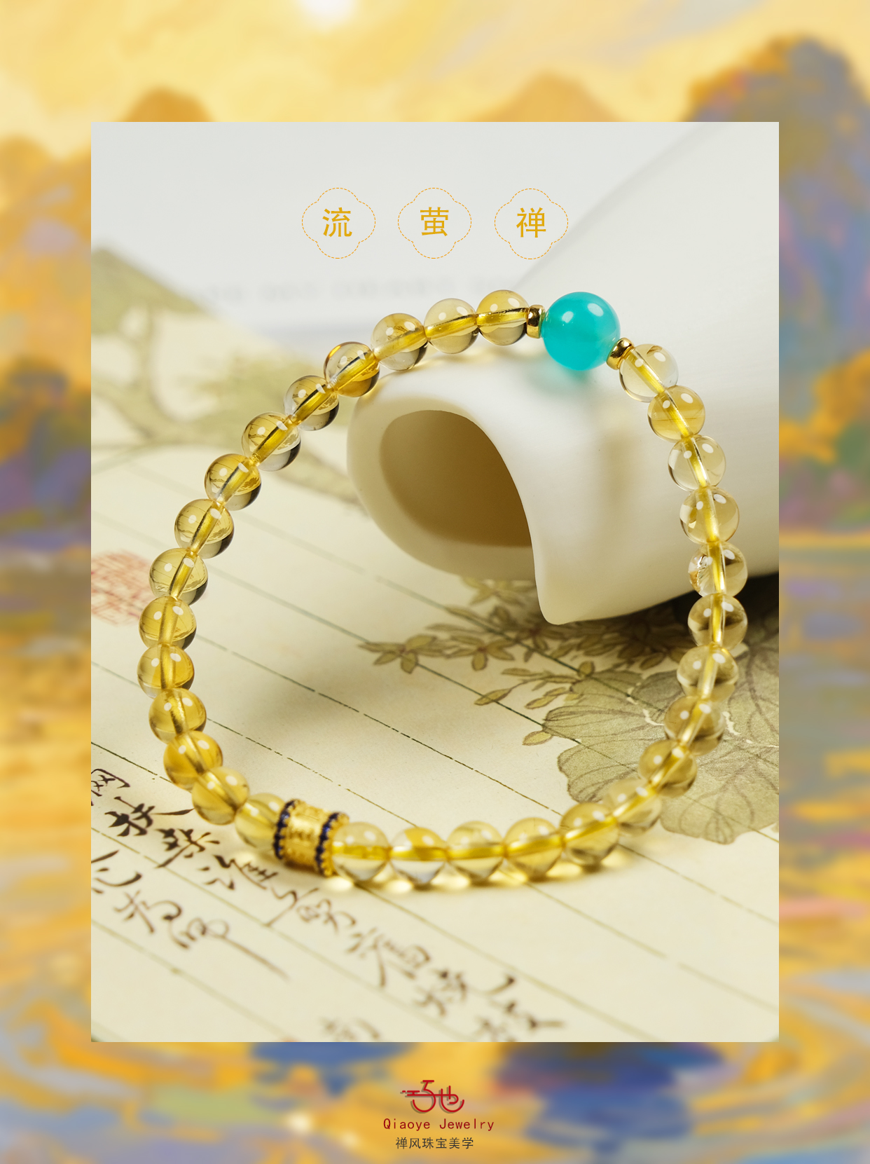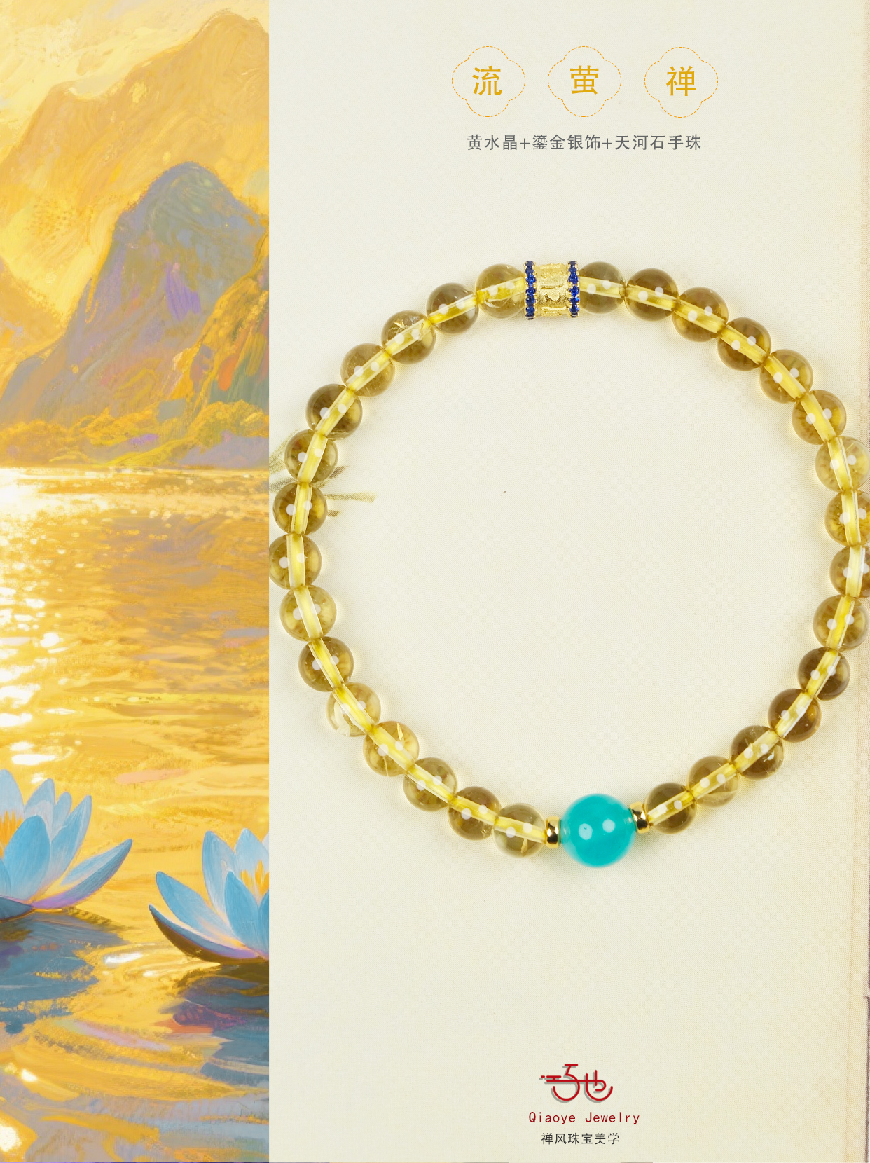 “流萤禅”手串,以巴西黄水晶为体,其色如敦煌壁画里飞天的飘带浸透了夕阳;天河石为魄,蓝绿交辉似孔雀明王座下的星河碎片;银鎏金珠作界,恰似雪窦山月夜惊起的鹤影。拈珠轻转时,金光在石纹间游走如萤,恍惚照见永嘉玄觉禅师“月下披云笑一声”的禅机。