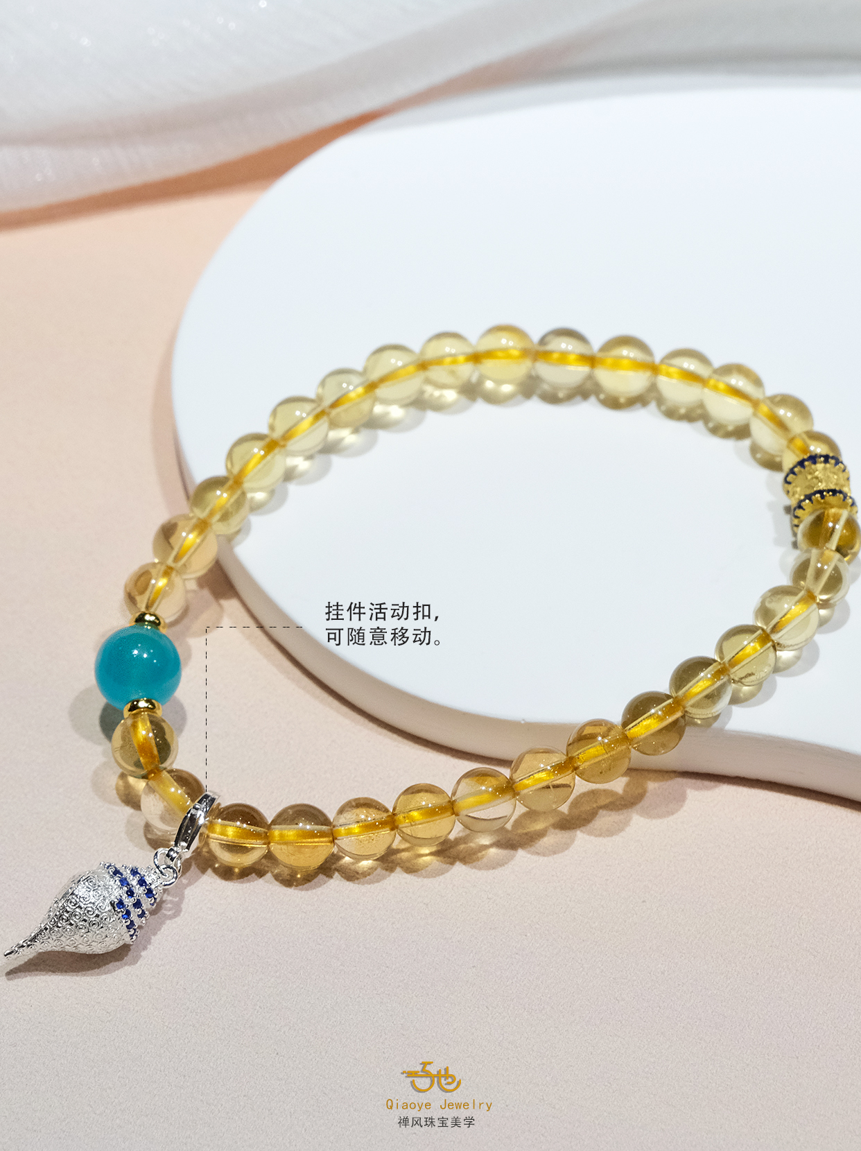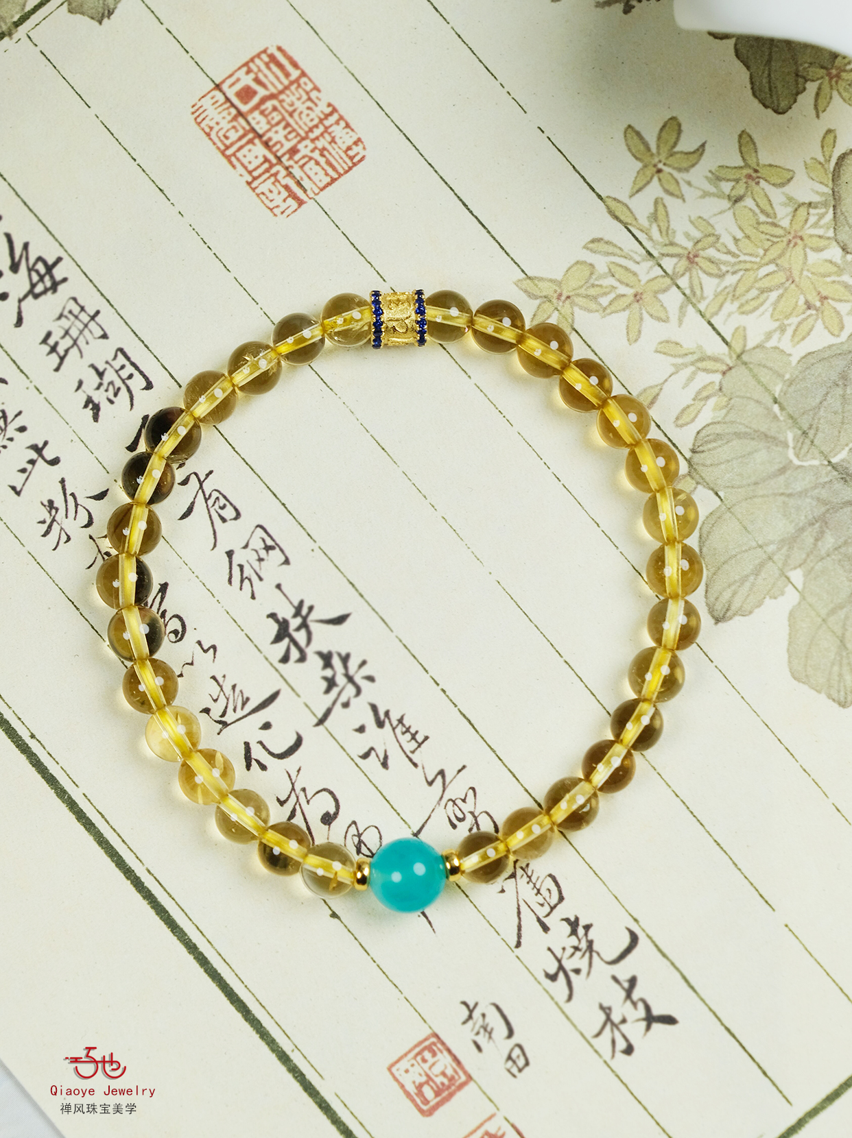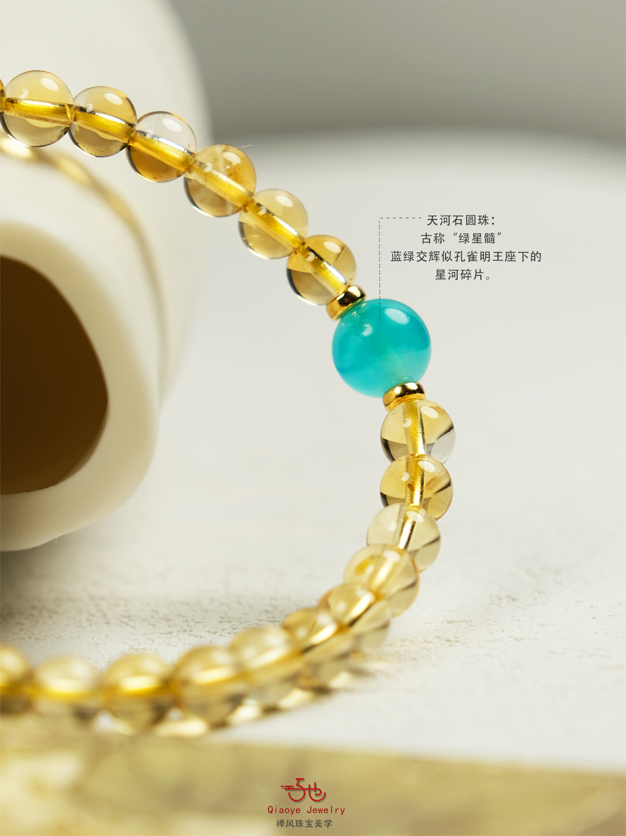 “流萤禅”手串,以巴西黄水晶为体,其色如敦煌壁画里飞天的飘带浸透了夕阳;天河石为魄,蓝绿交辉似孔雀明王座下的星河碎片;银鎏金珠作界,恰似雪窦山月夜惊起的鹤影。拈珠轻转时,金光在石纹间游走如萤,恍惚照见永嘉玄觉禅师“月下披云笑一声”的禅机。