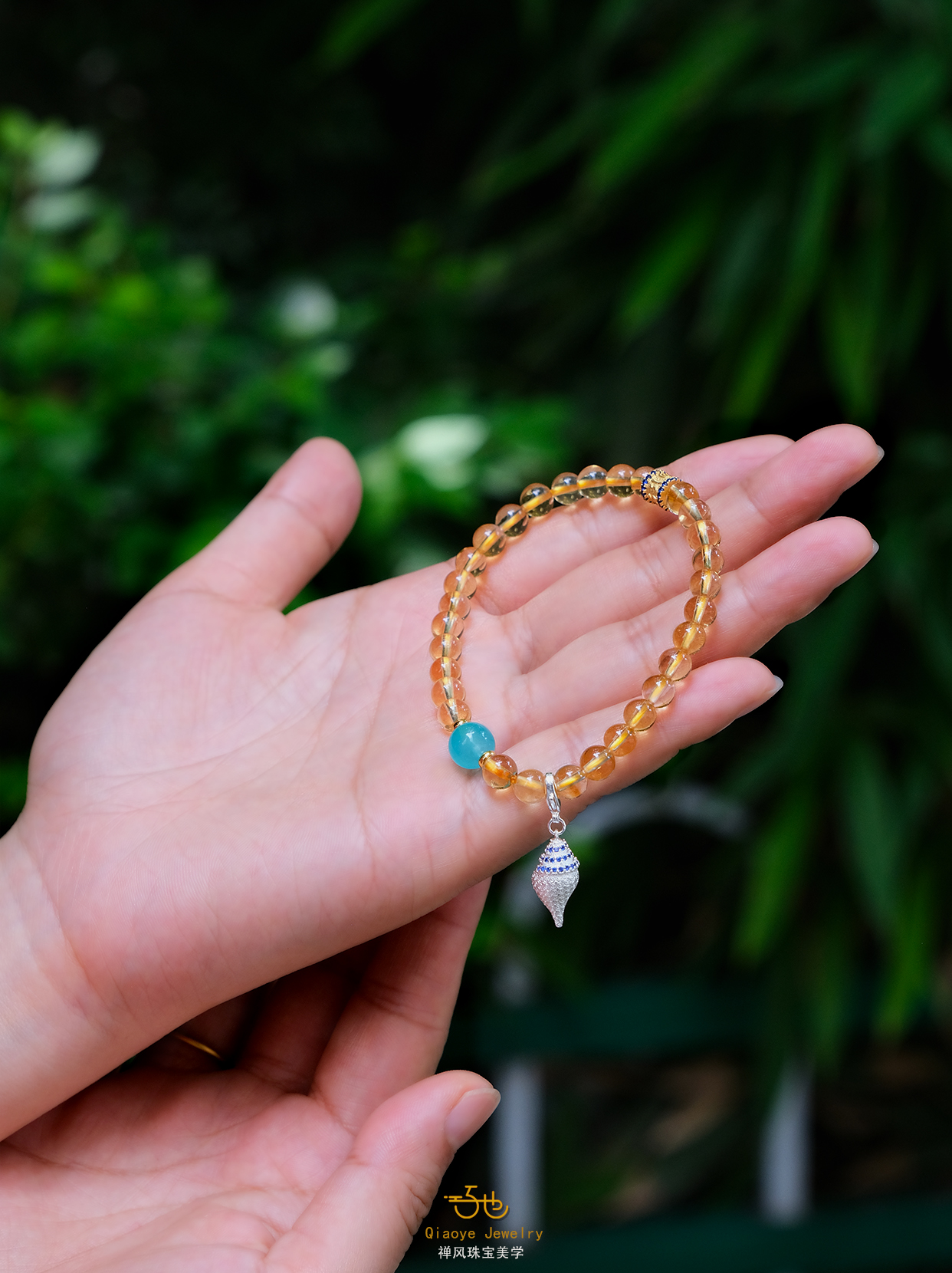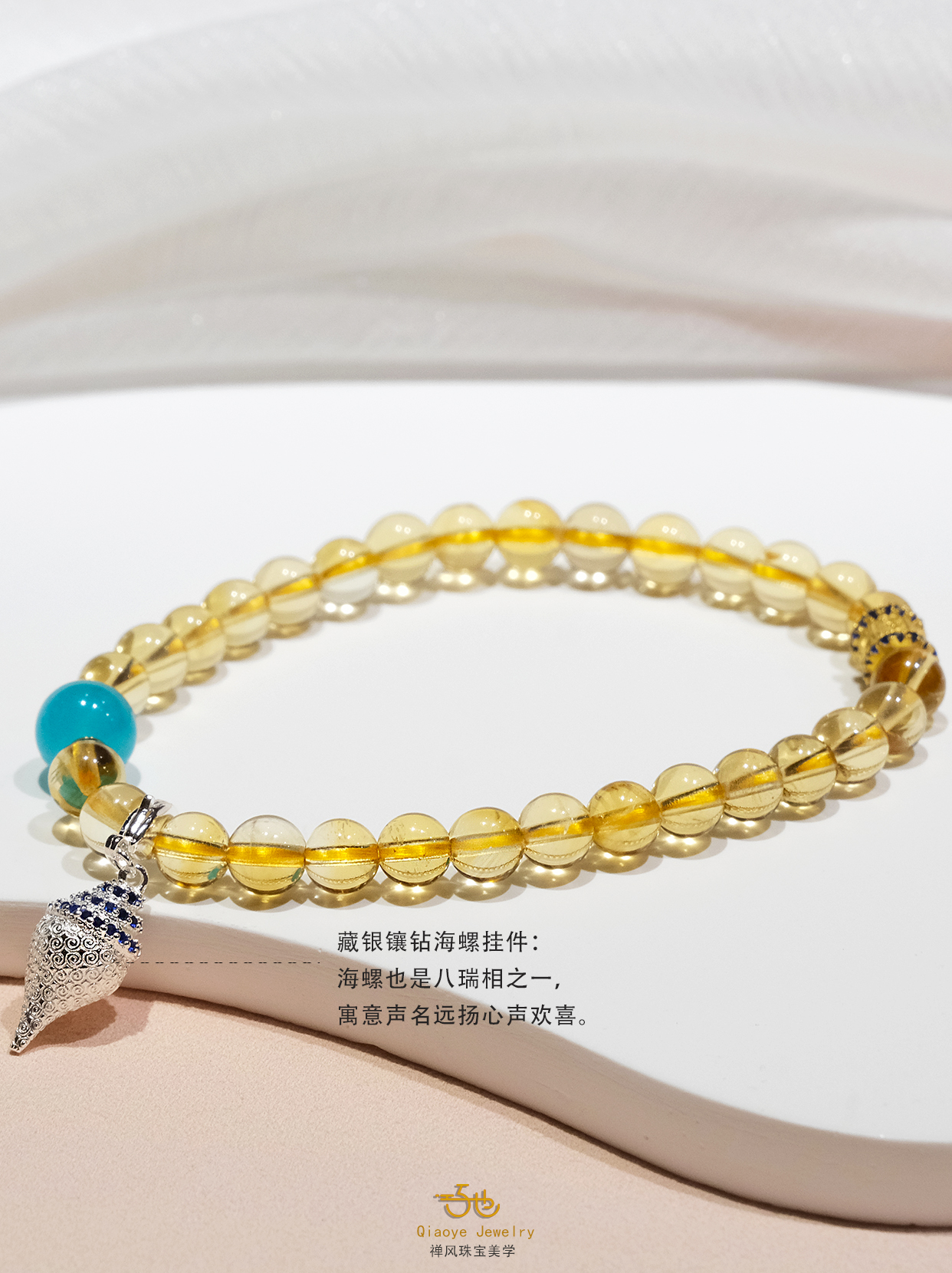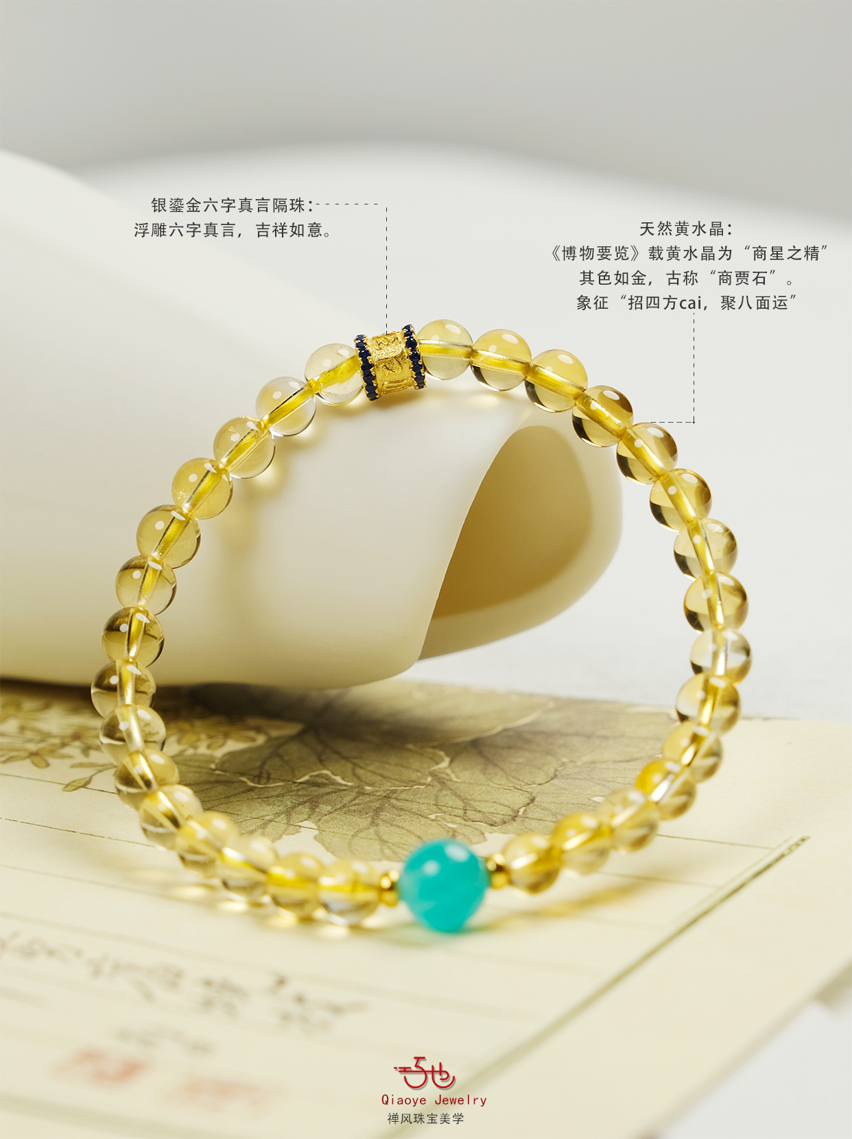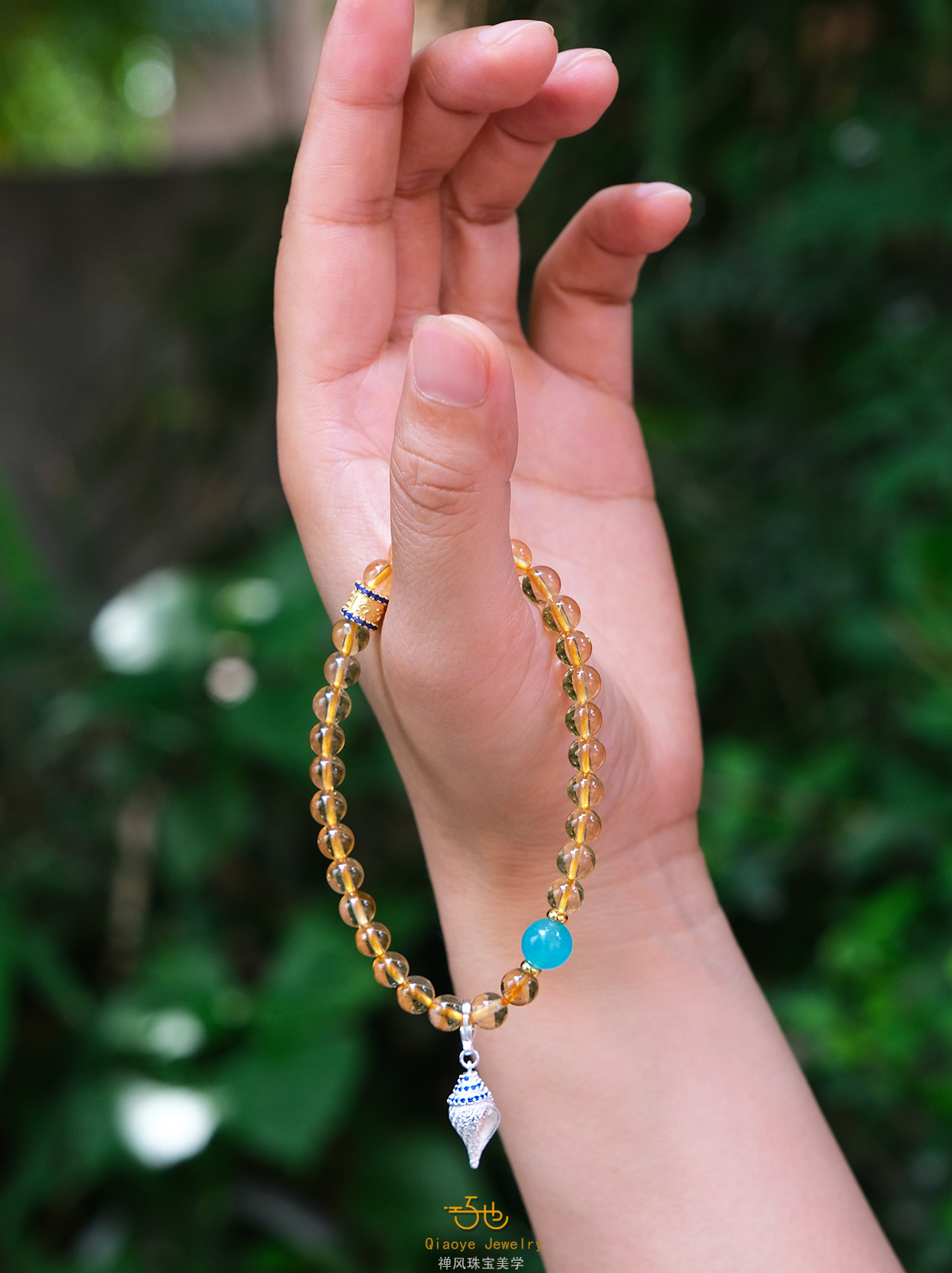“流萤禅”手串,以巴西黄水晶为体,其色如敦煌壁画里飞天的飘带浸透了夕阳;天河石为魄,蓝绿交辉似孔雀明王座下的星河碎片;银鎏金珠作界,恰似雪窦山月夜惊起的鹤影。拈珠轻转时,金光在石纹间游走如萤,恍惚照见永嘉玄觉禅师“月下披云笑一声”的禅机。