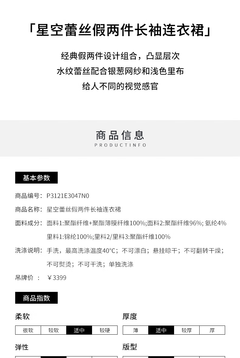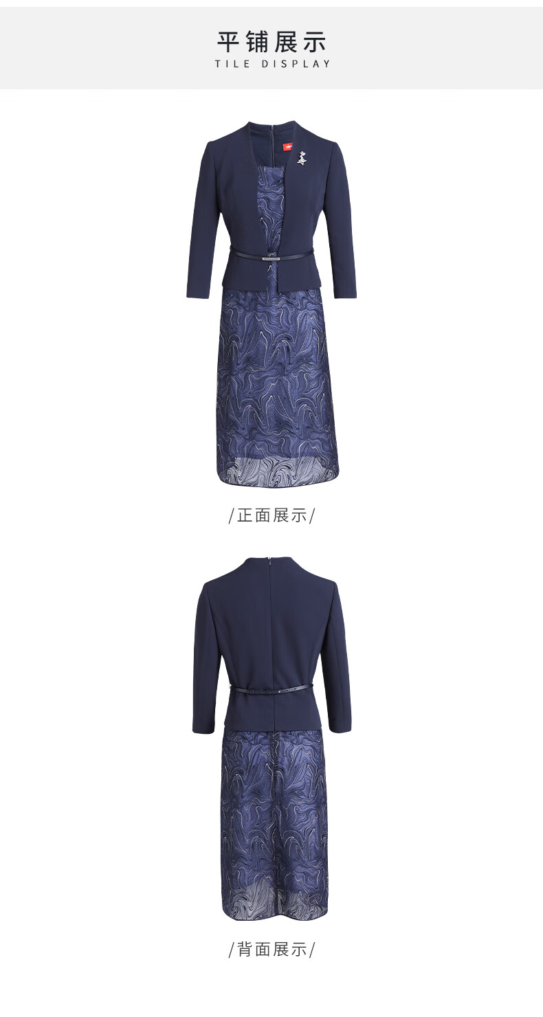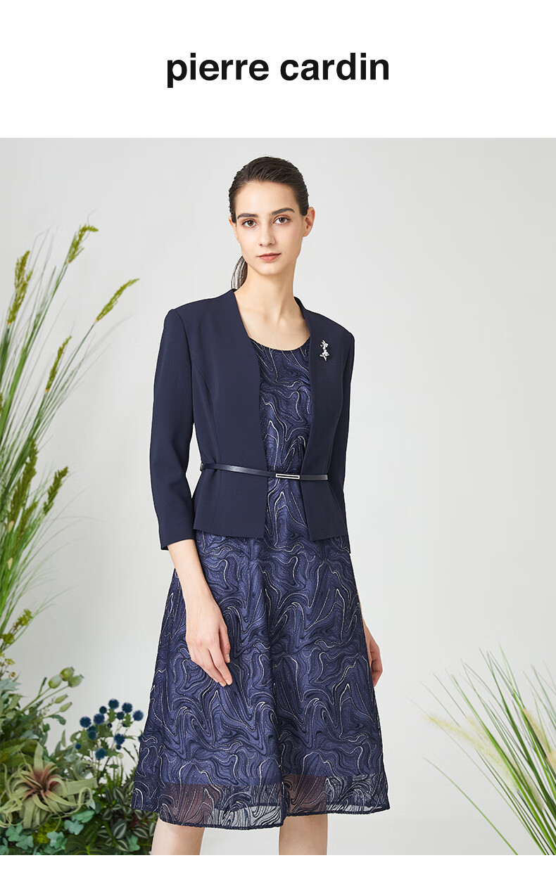 皮尔卡丹女装春季新款藏蓝色假两件法式连衣裙P3121E3047N0