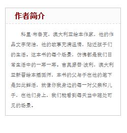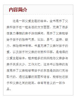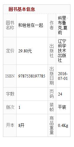 | 适读人群 :3-6岁 “和爸爸在一起,我什么都不怕!”父亲在孩子心中有着不可替代的地位。爸爸们,在忙碌了一天后,给孩子读一读这本书吧,这是出孩子和父亲在一起有多么快乐和富有创造性的绘本,希望能给爸爸们带去一丝触动,让爸爸们多陪孩子玩一玩,父亲的陪伴带给孩子的乐趣是母亲无法取代的,尤其是男孩子。 |