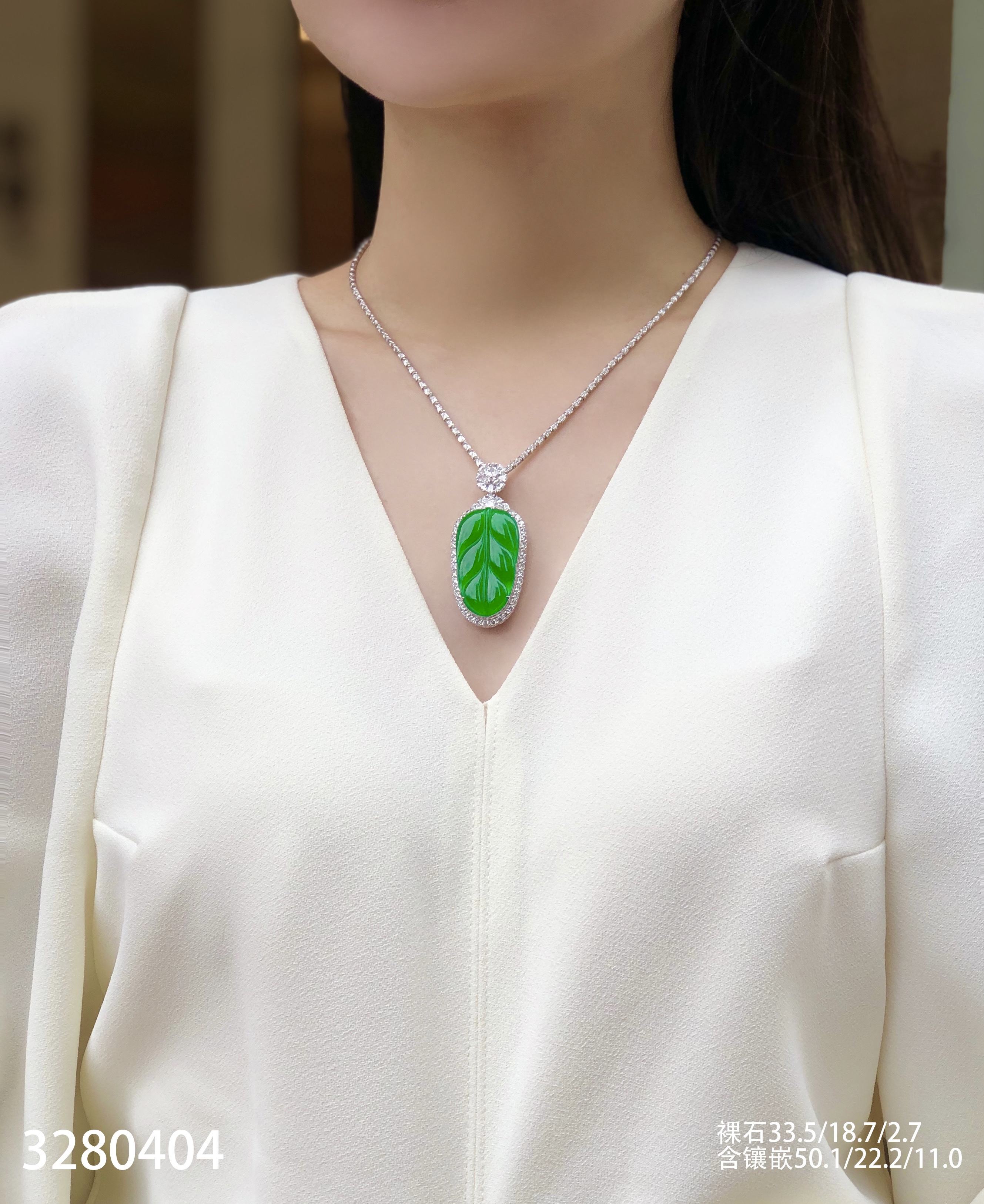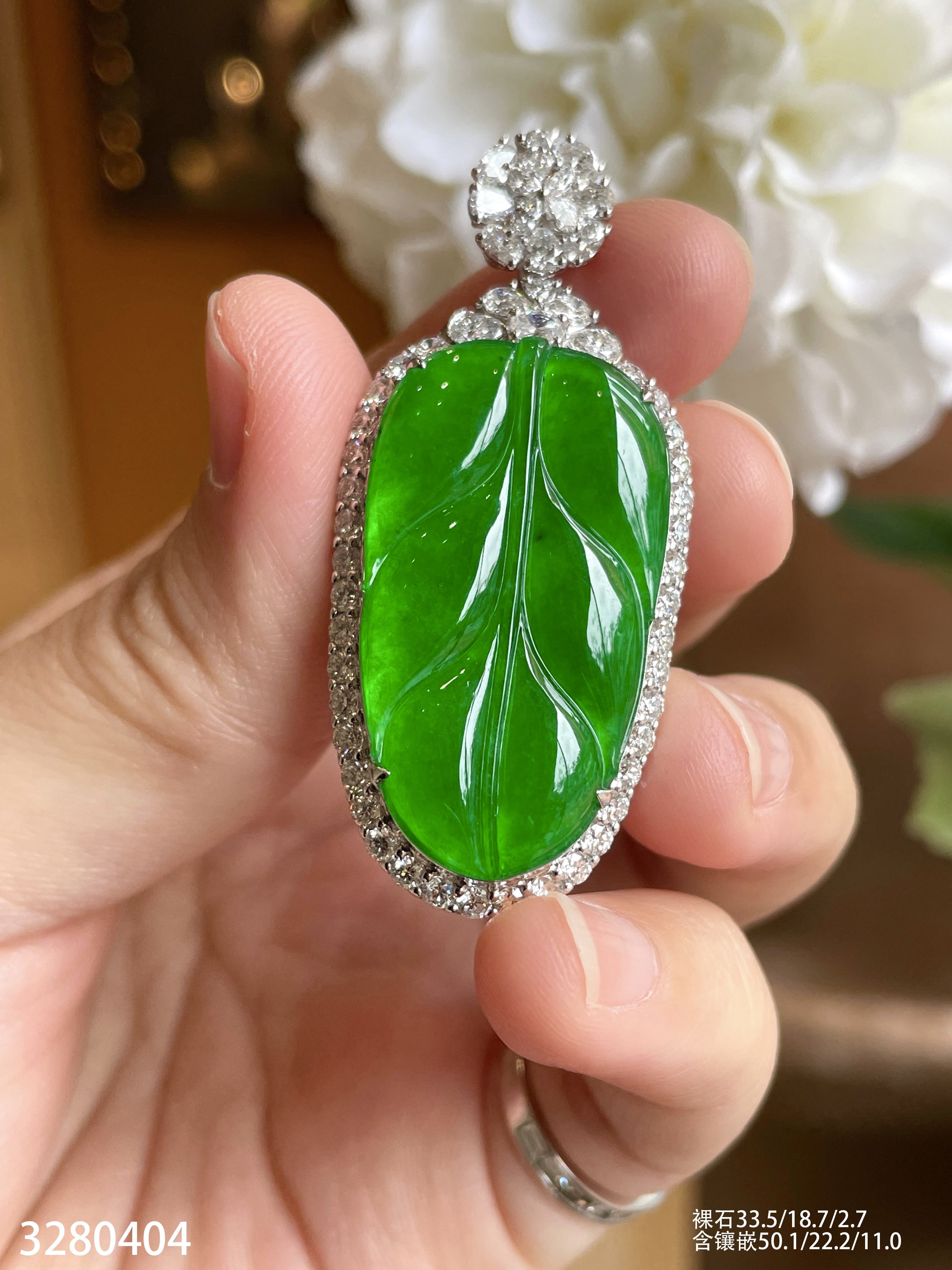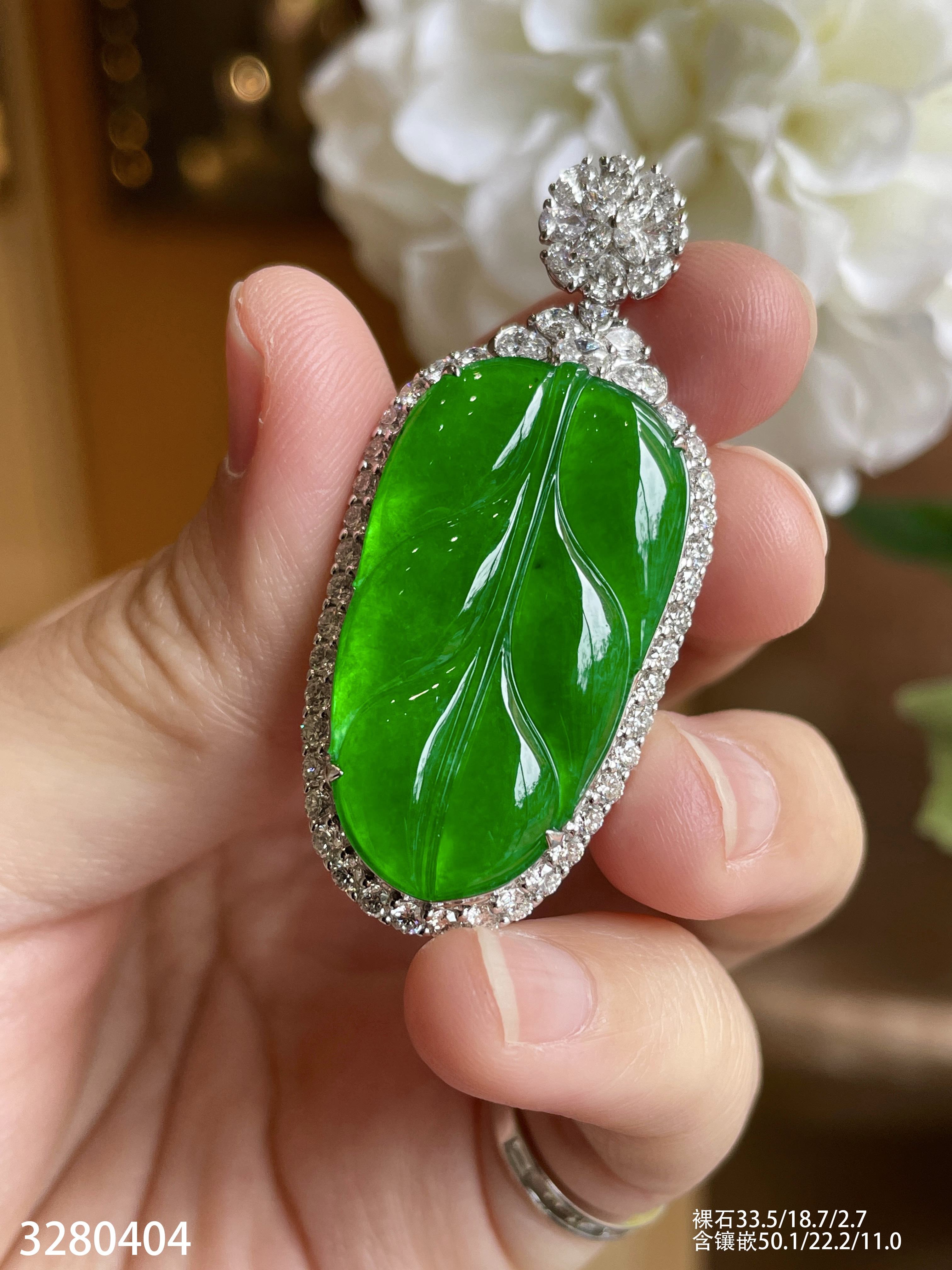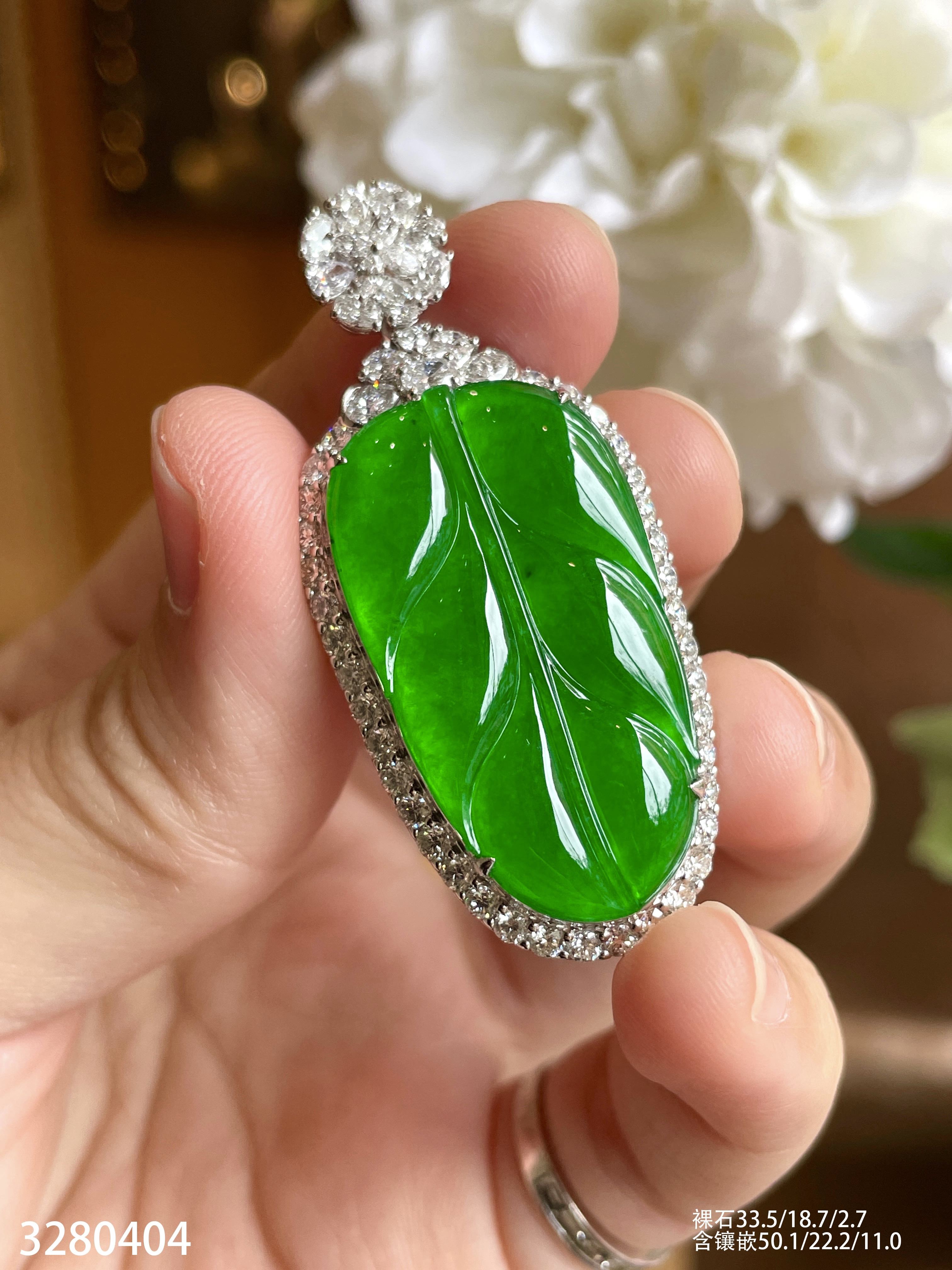 高冰艳绿叶子吊坠【3280404】具体价格微信咨询