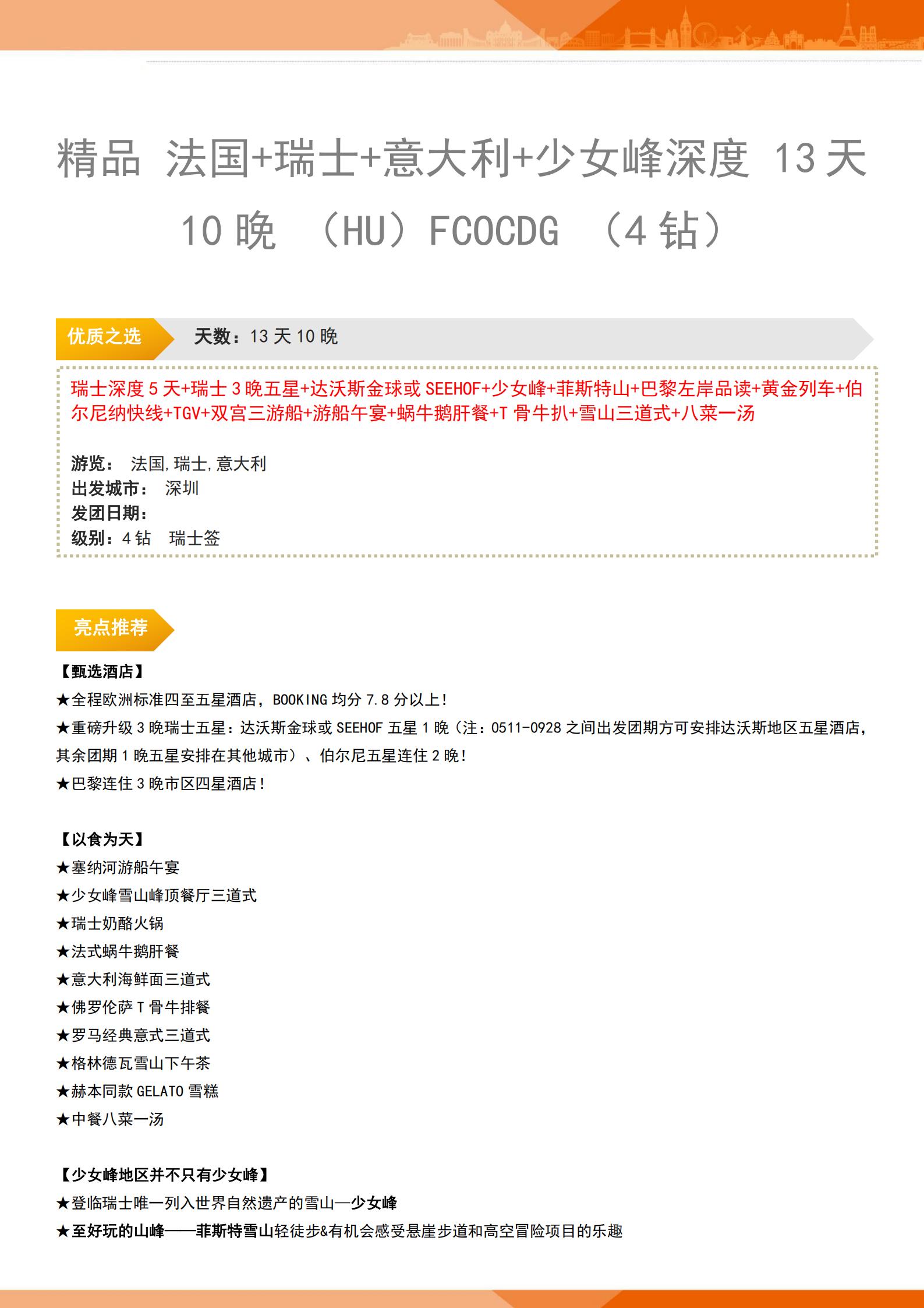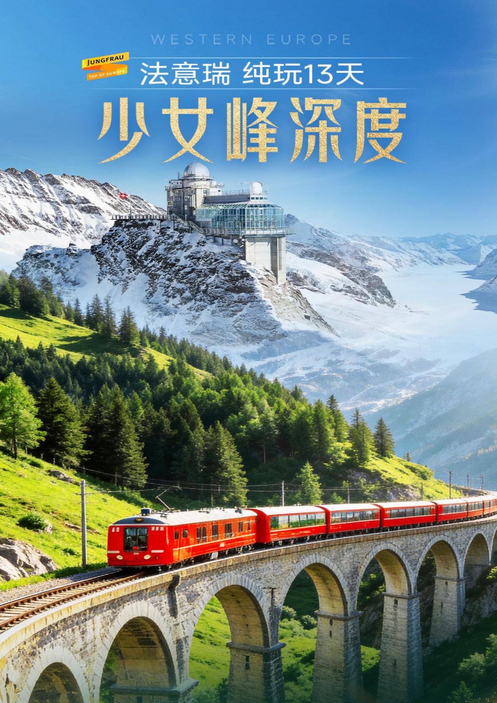 【暑假、国庆】<西欧三国:法国+瑞士+意大利13天深度纯玩-26人小团>深圳直飞往返+瑞士3晚五星+达沃斯金球或SEEHOF+少女峰+菲斯特山+巴黎左岸品读+黄金列车+伯尔尼纳快线+TGV+双宫三游船