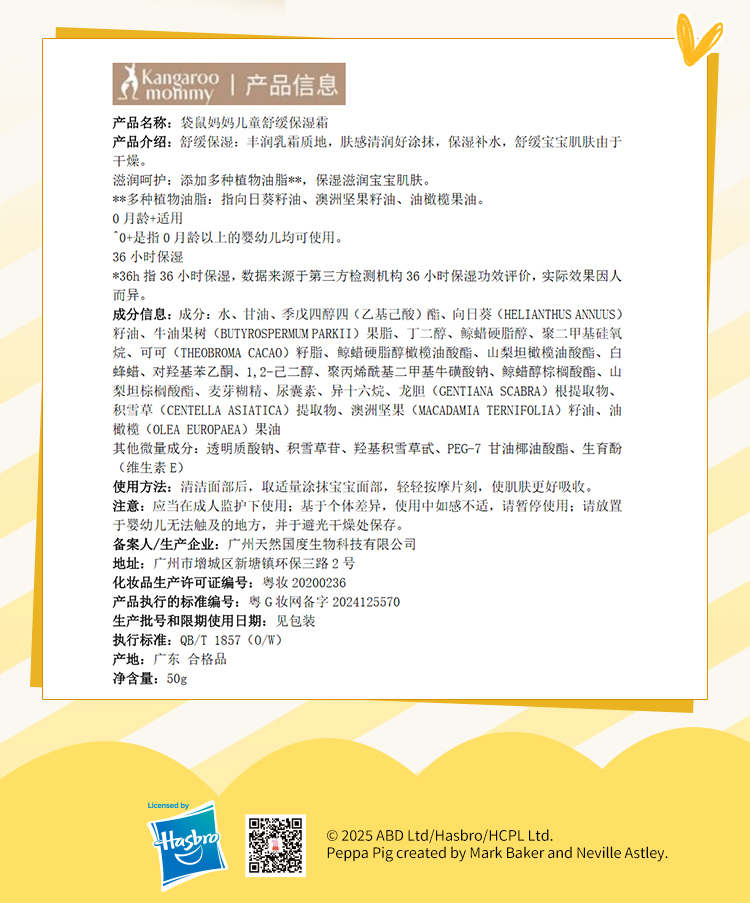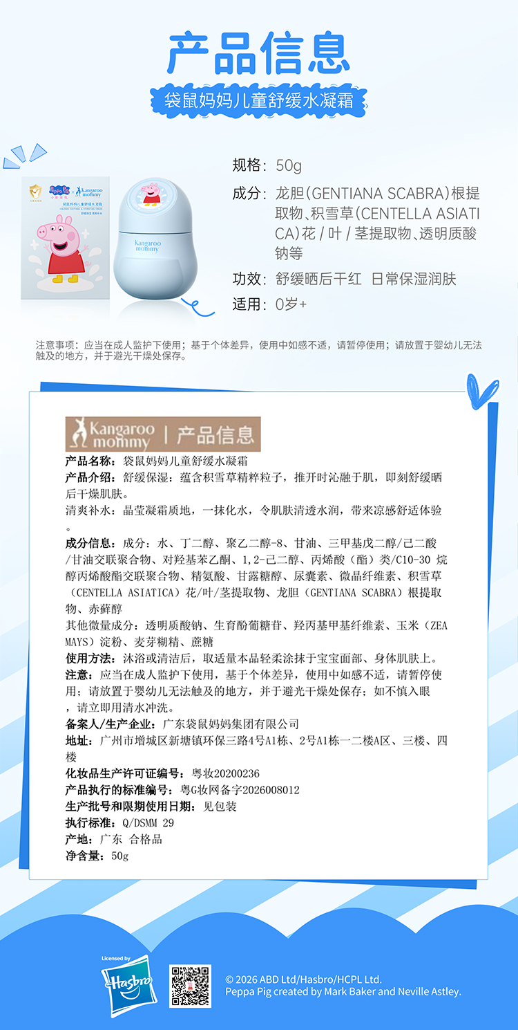 【小猪佩奇联名款】舒缓晒后小红脸婴儿宝宝霜清爽润肤乳 儿童舒缓水凝霜50g