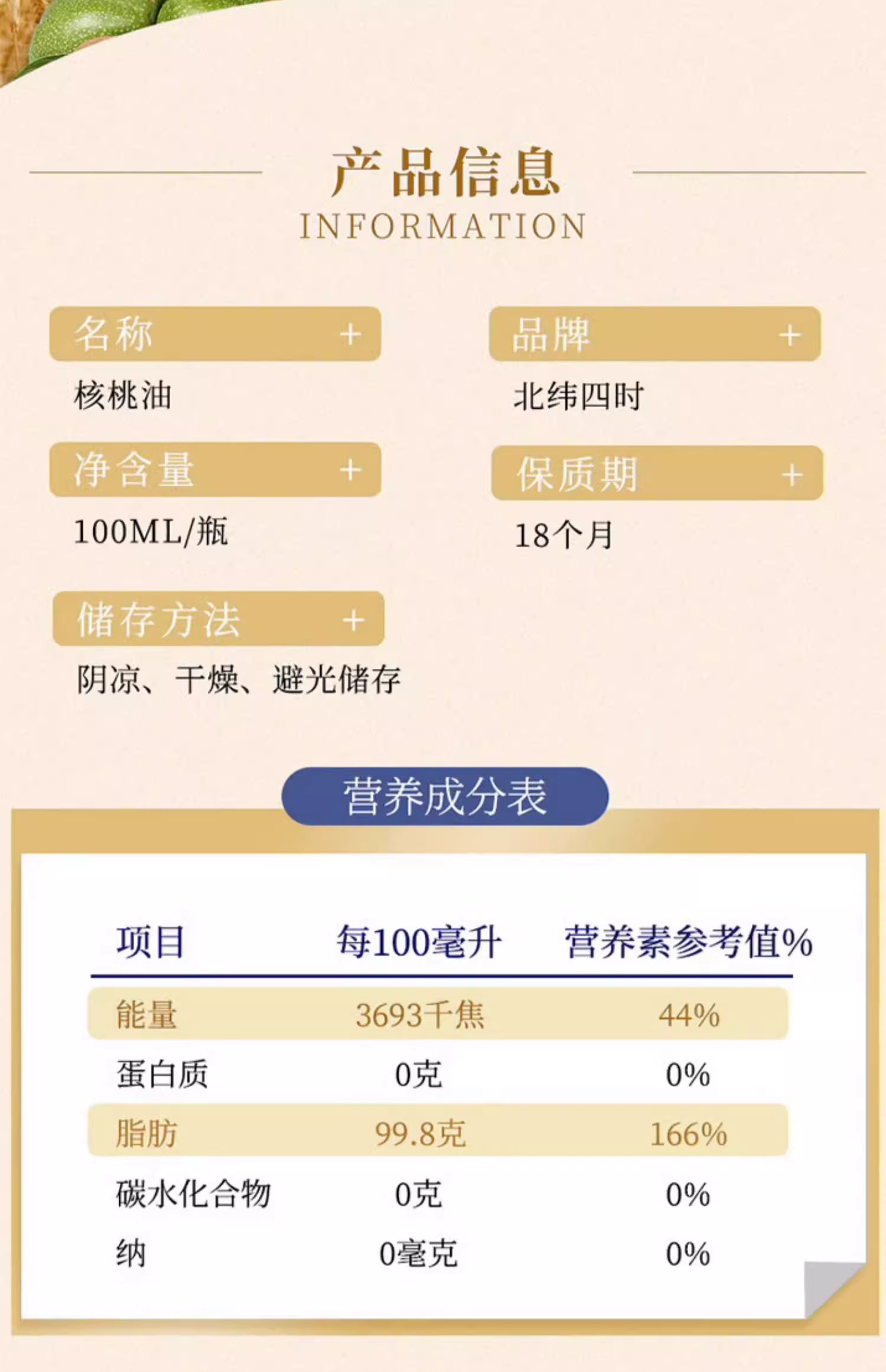 【分仓直发包邮】北纬四时核桃油食用油100ml/瓶