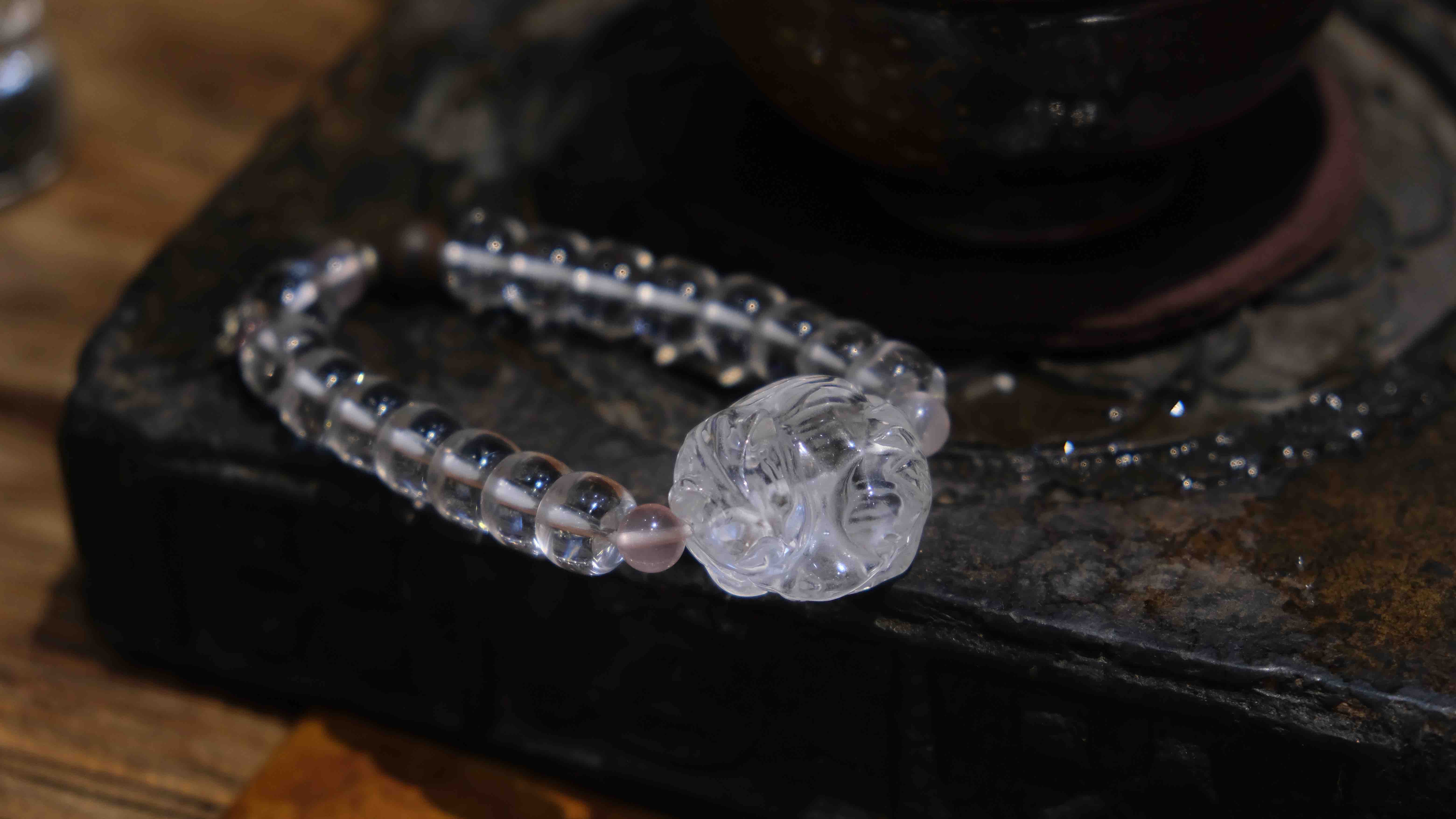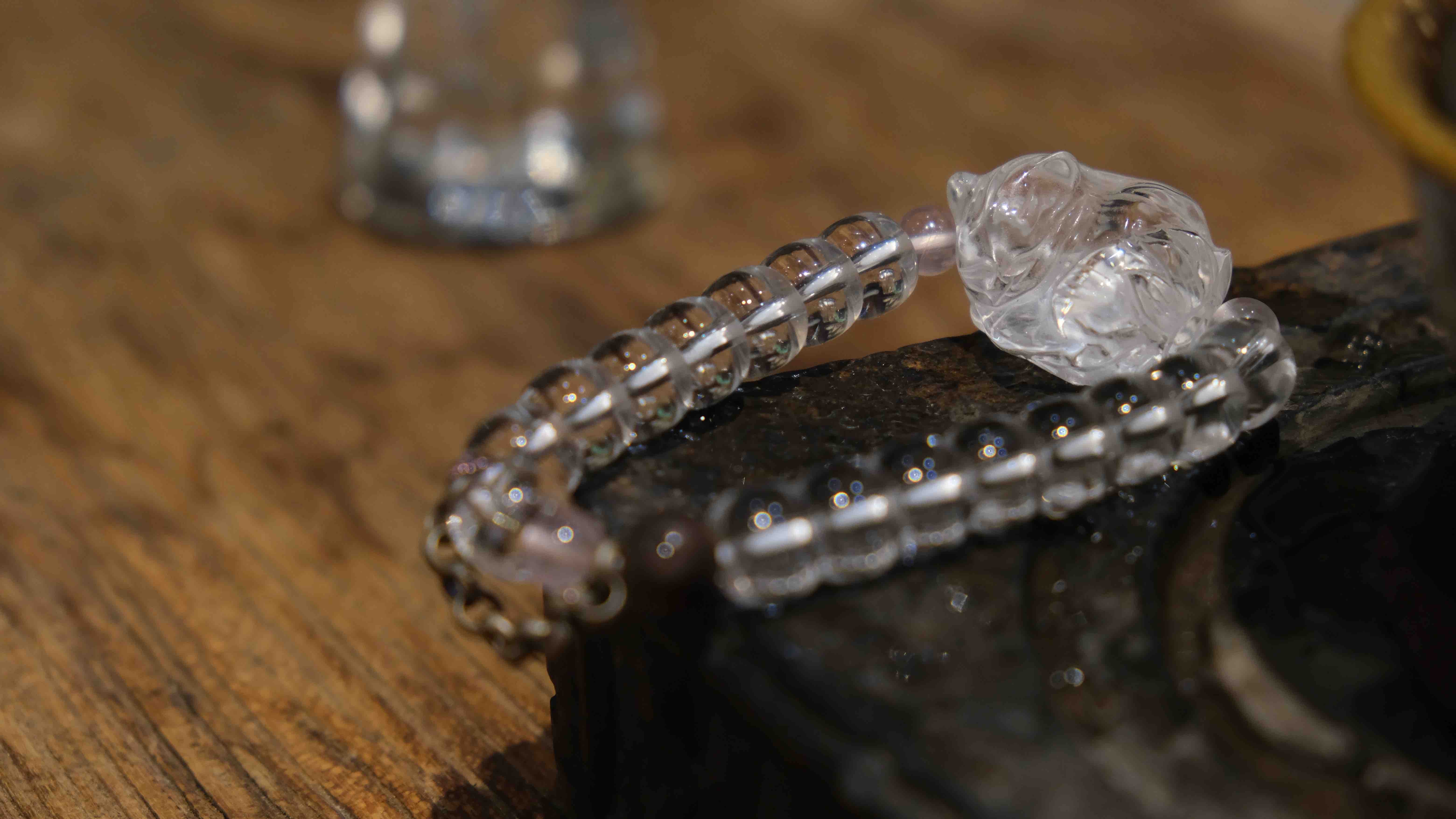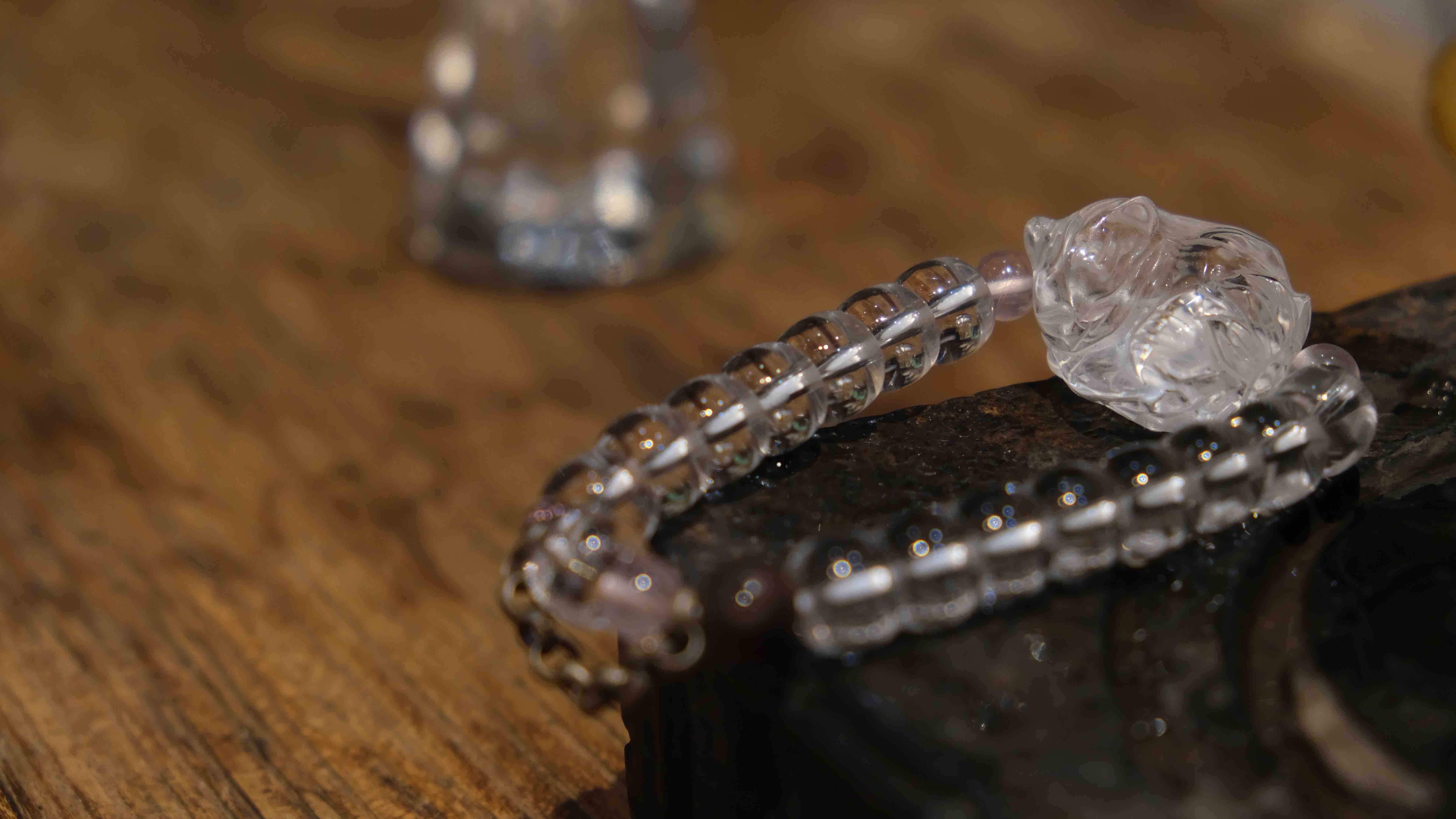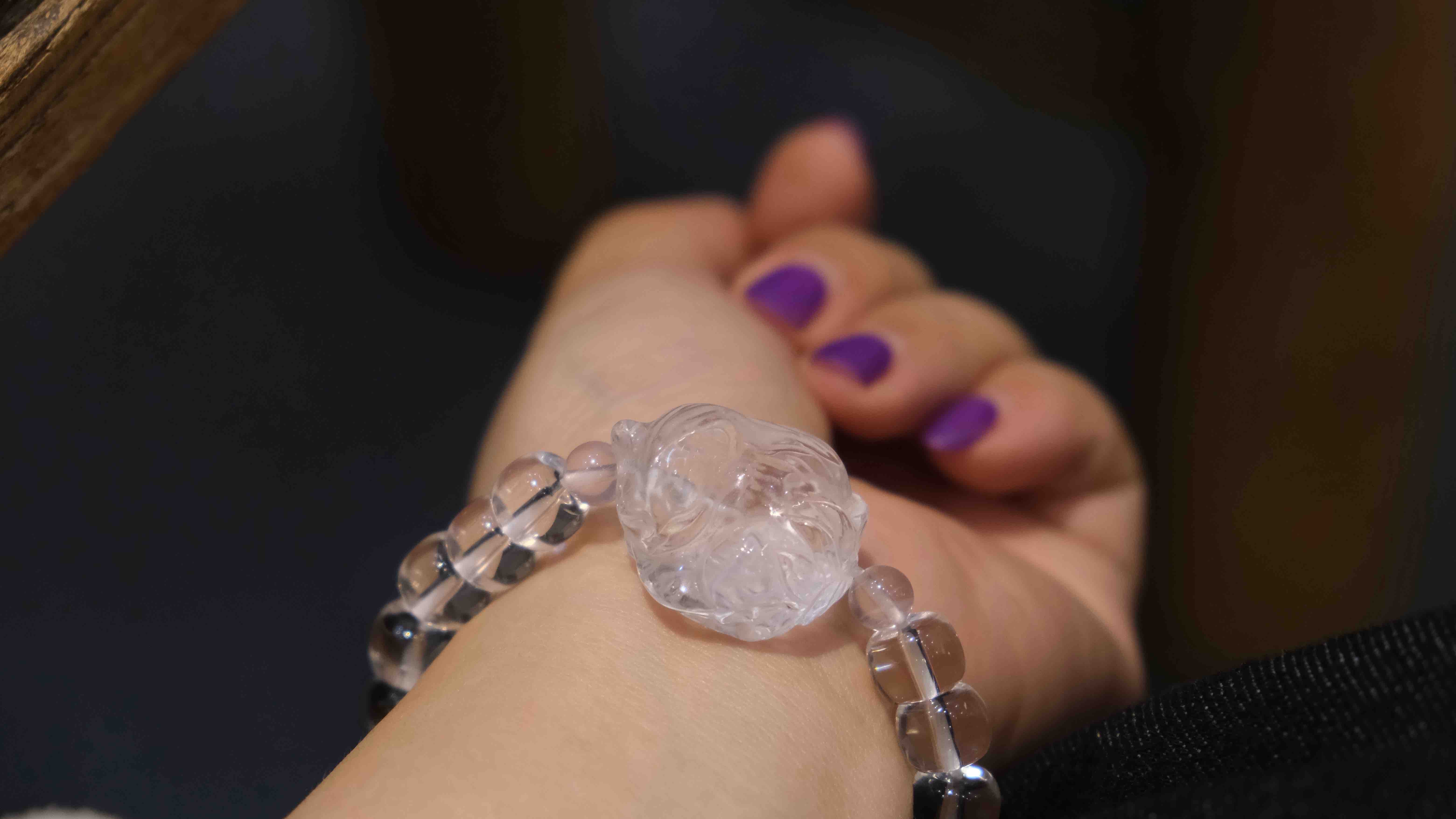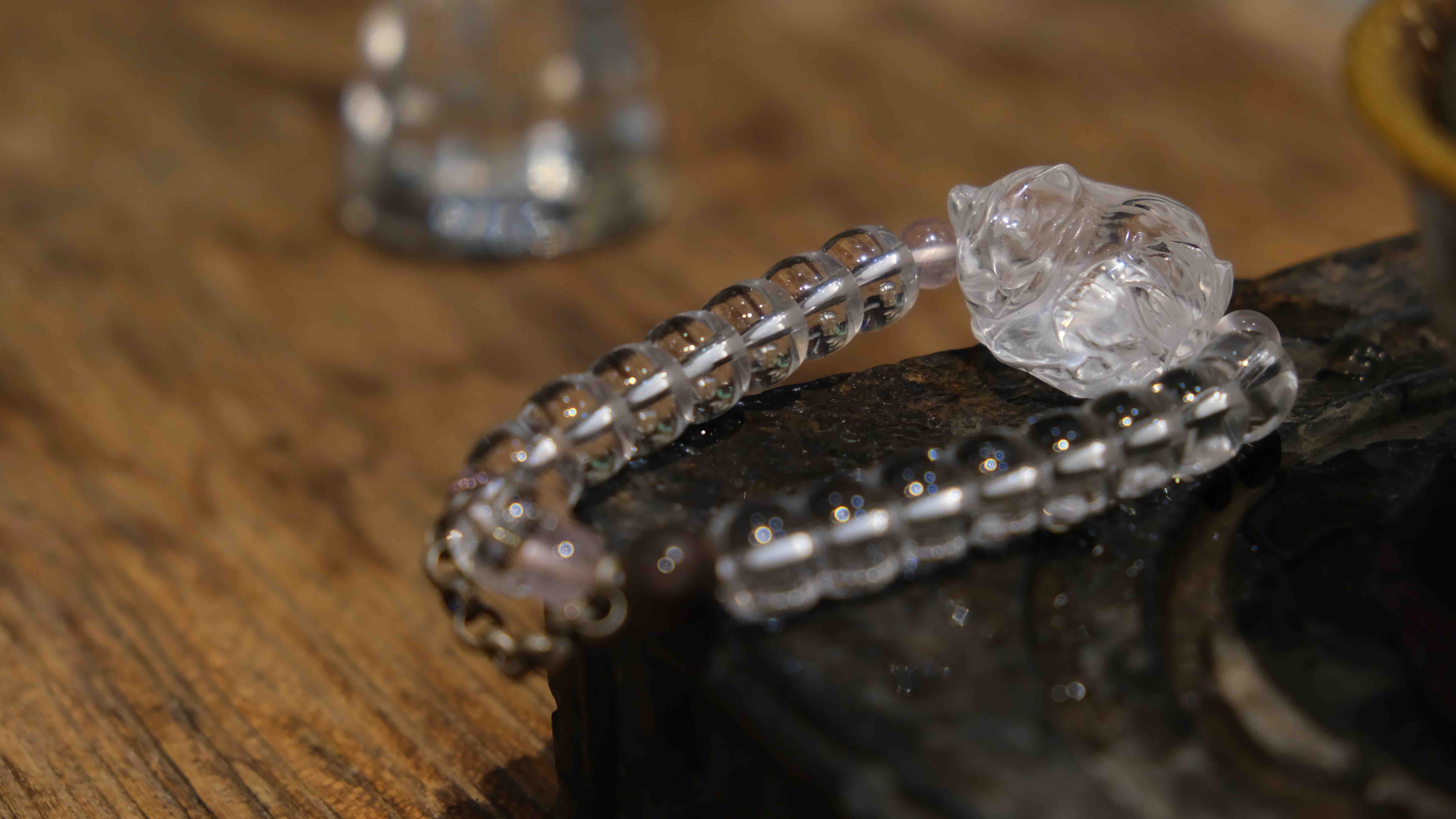 整体通透,纯净,酷而萌,狐狸更增加了灵性色彩。白水晶,缓解压力,去负面能量。净化,是她的关键词。