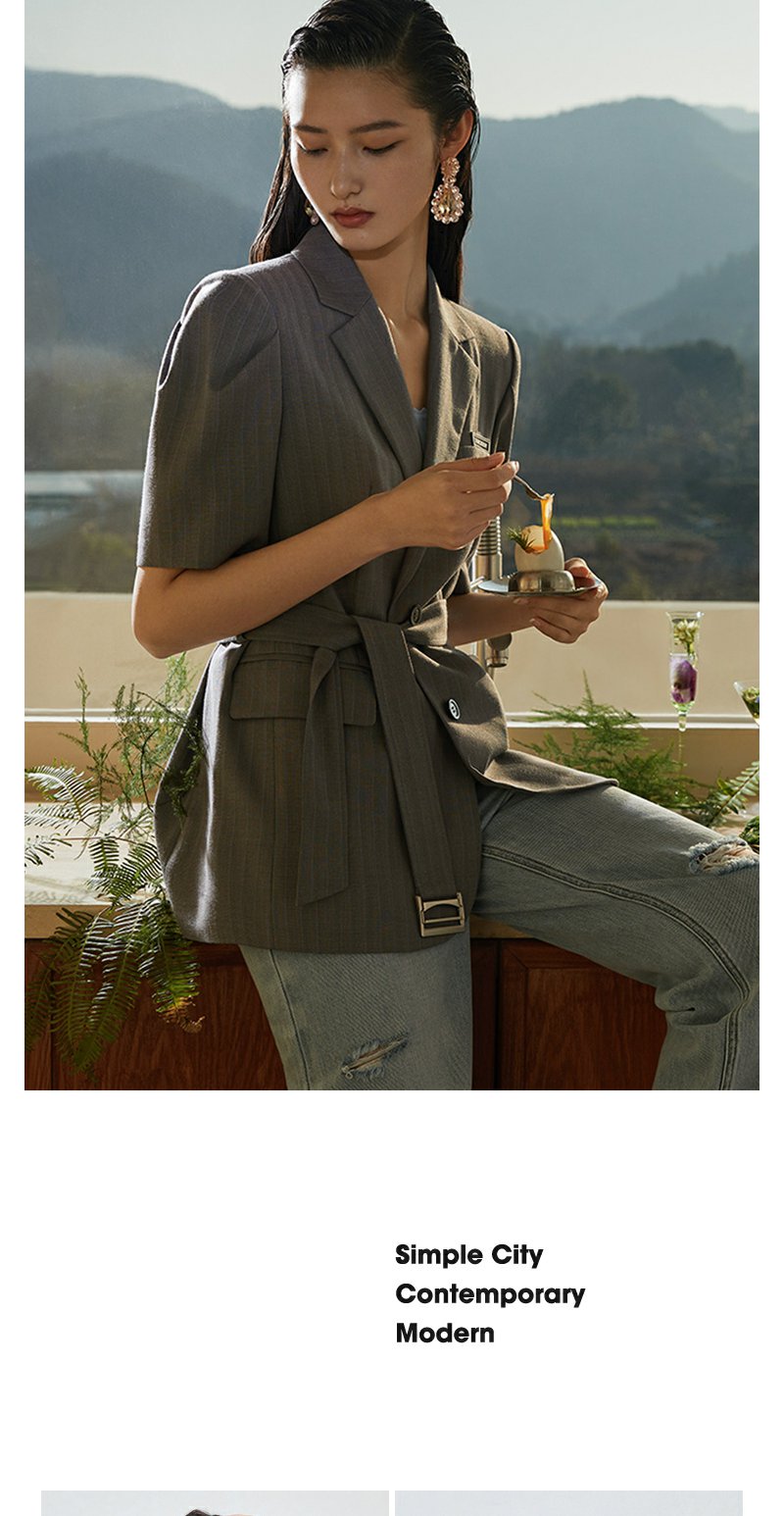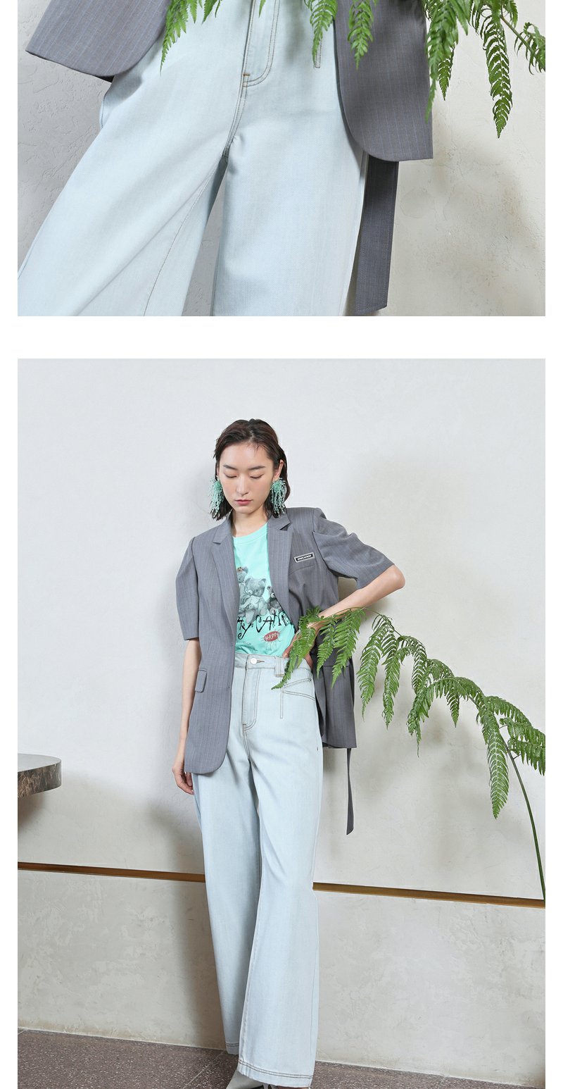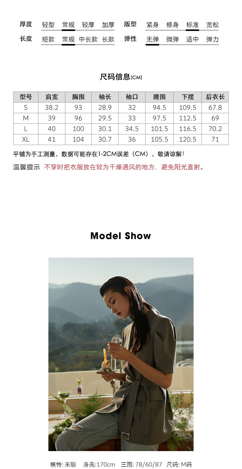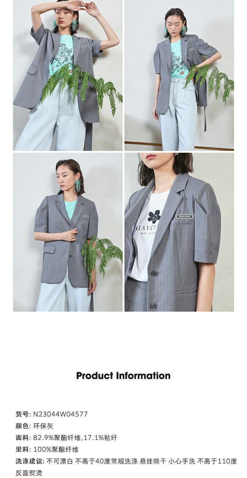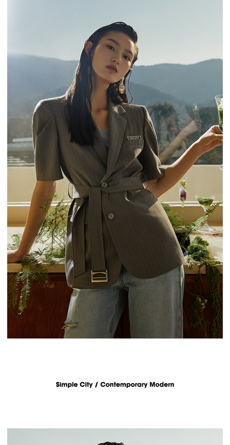 NEELLY纳俪商场同款职场OL竖条纹短袖收腰系带西装廓形西服女外套N23044W04577