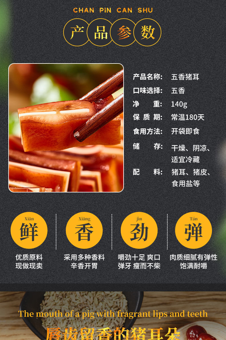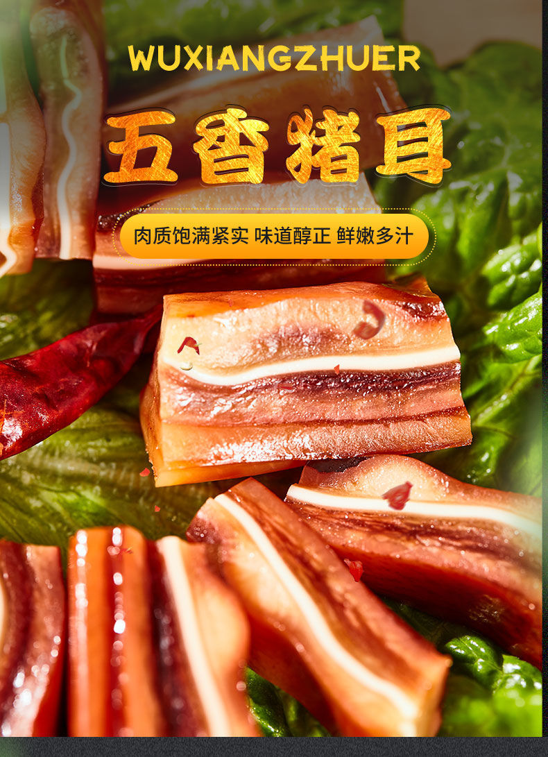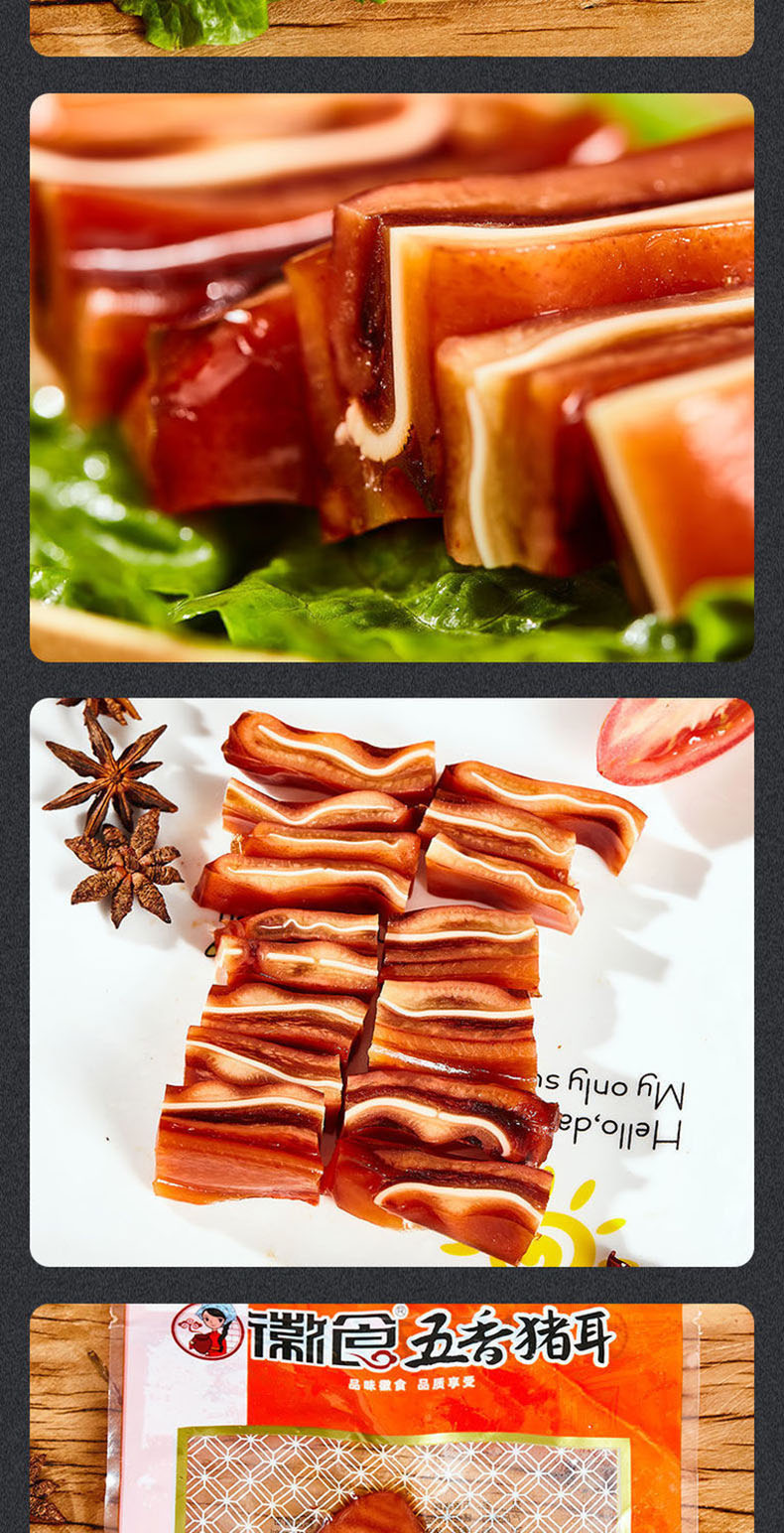 D徽食五香猪耳,5袋组合,选取耳尖部位,采用独特工艺,加入数种天然香辛料卤制而成,酱香浓郁,醇厚,开袋即食,越吃越鲜香D