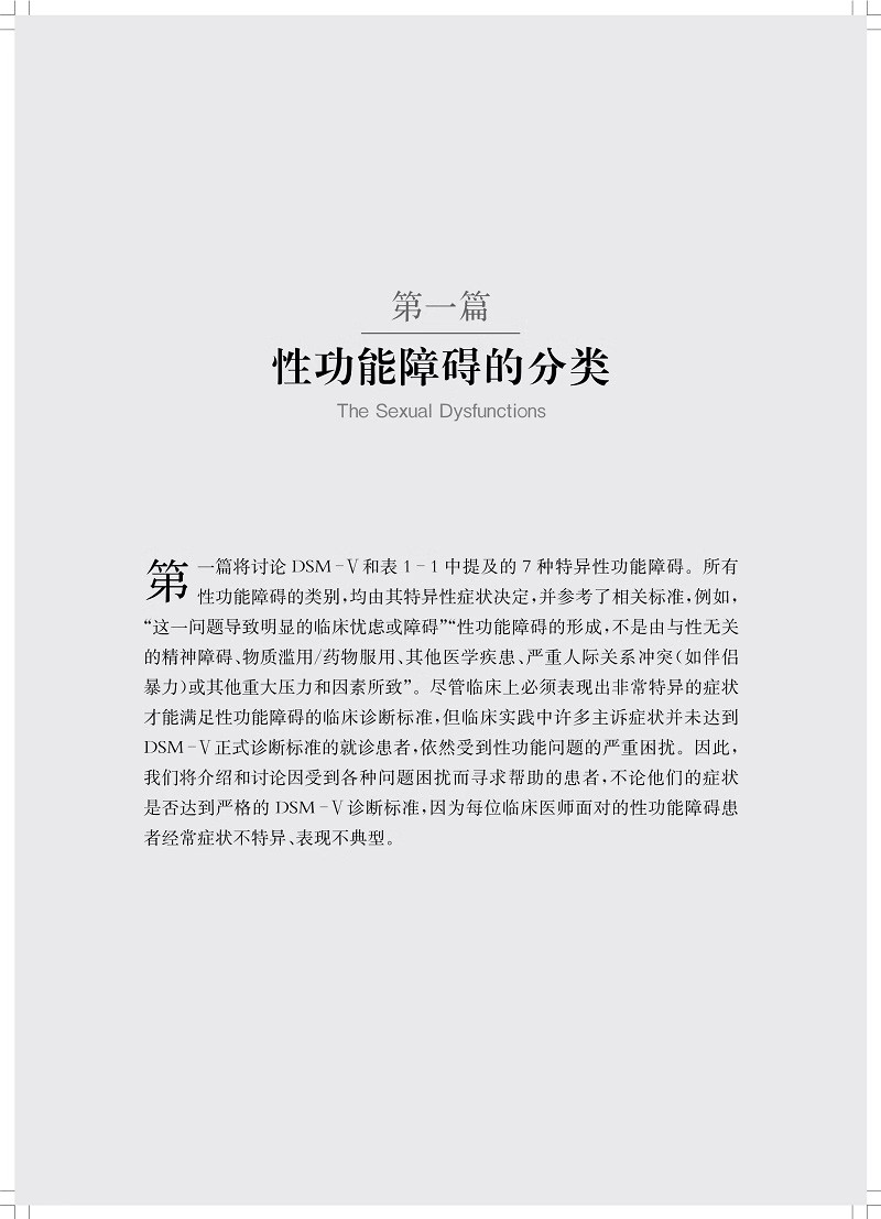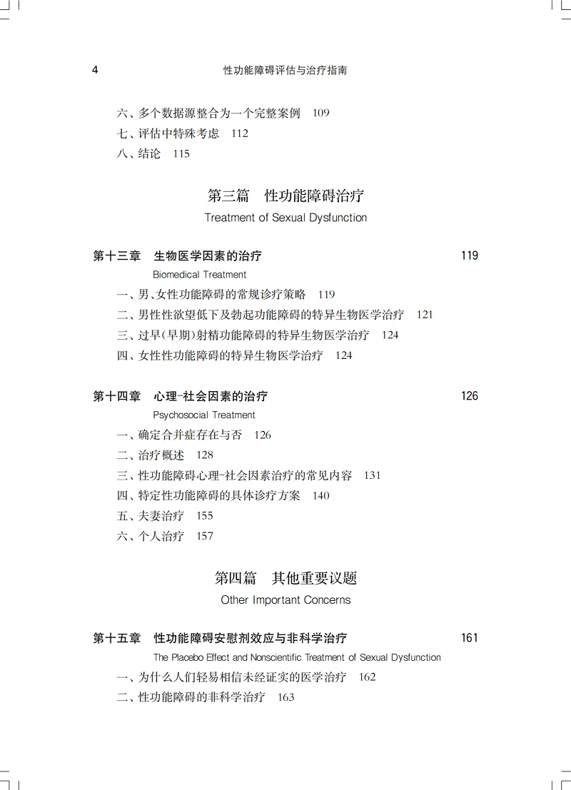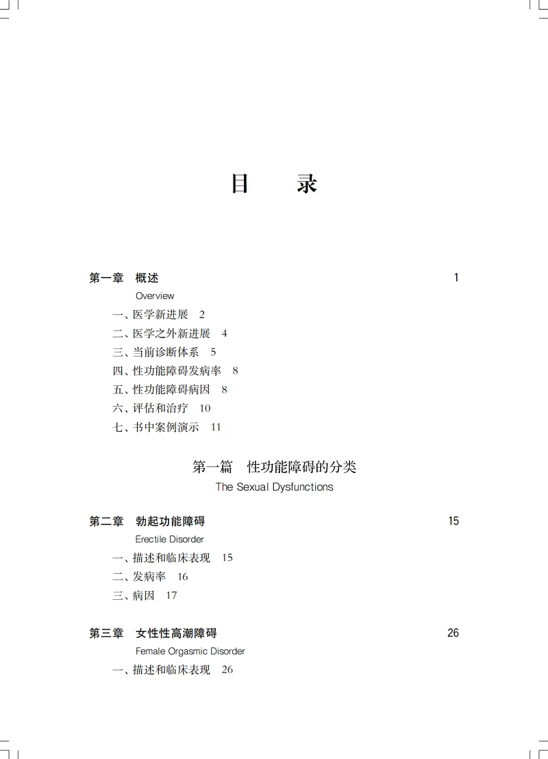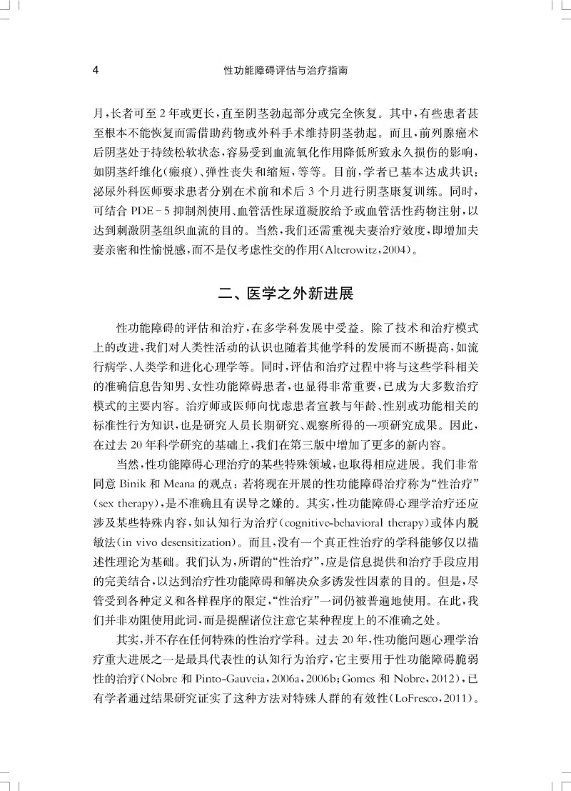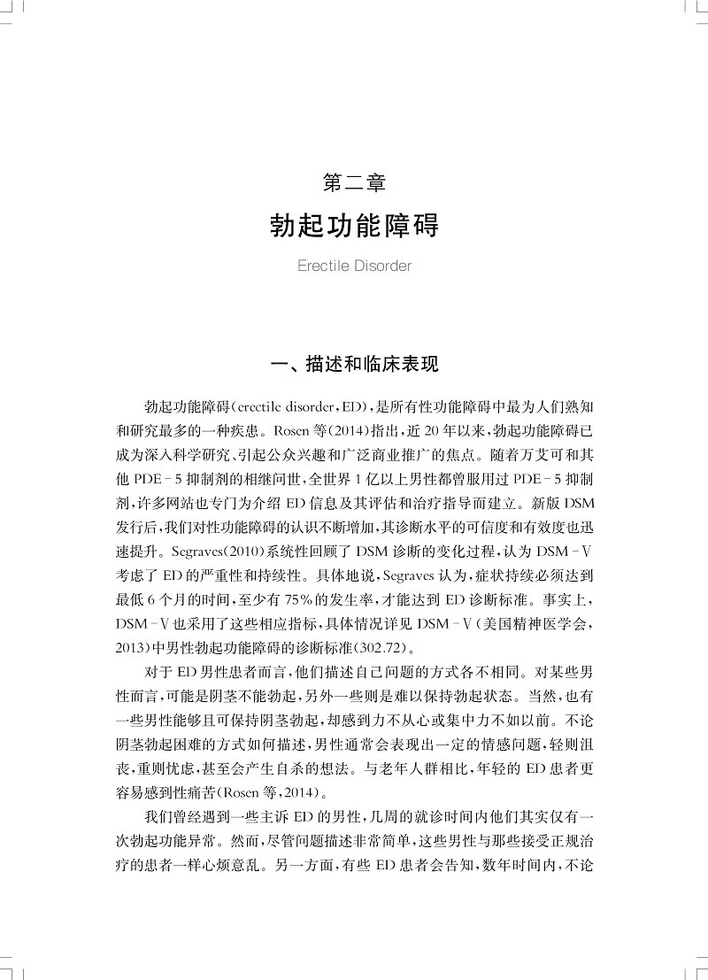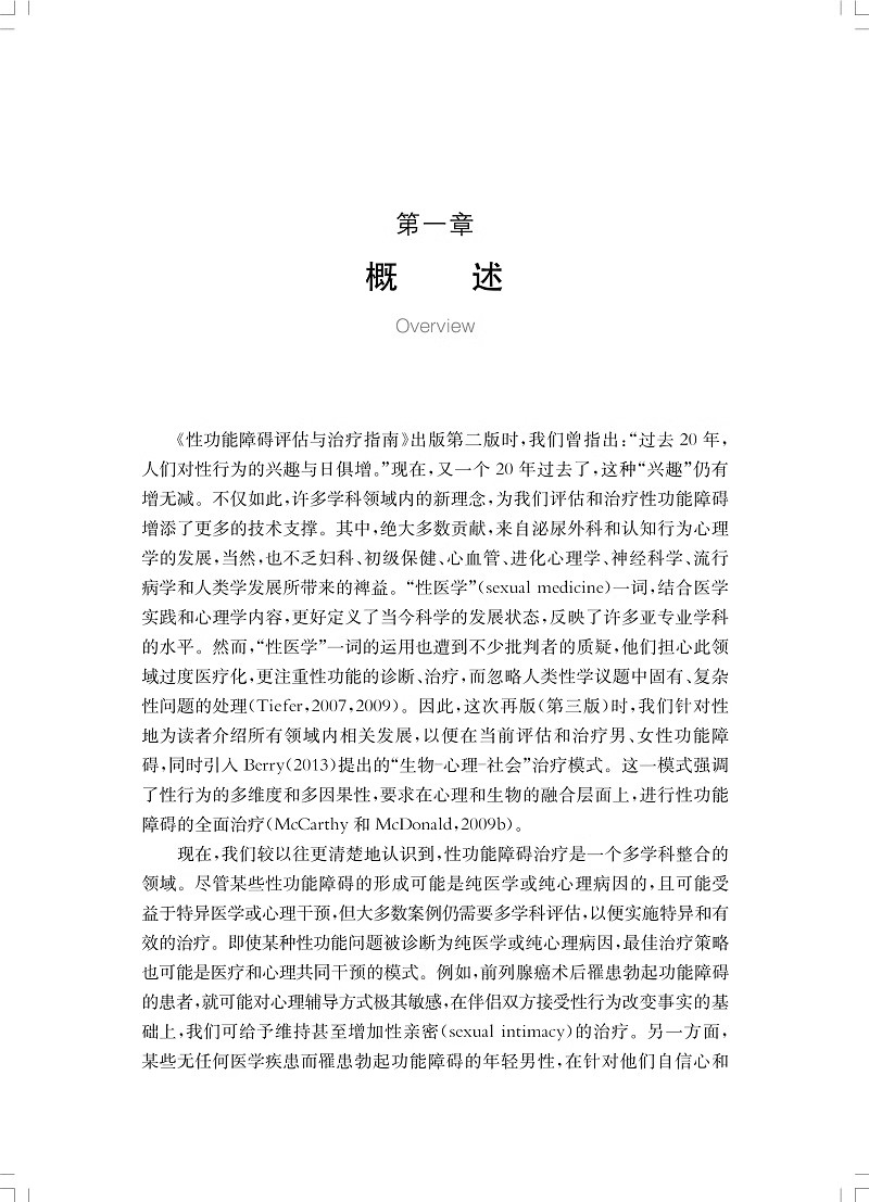 本书与时俱进地反映了当前男、女性功能障碍中生理、心理和社会学研究重大进展,分四篇、十六章进行系统阐述,包括性功能障碍的分类、性功能障碍的评估、性功能障碍的治疗和其他重要议题。全书凝聚作者智慧与临床经验的结晶。其新颖性表现在以下几点:构建了一个可 评估的先进诊疗体系,综合考虑医学和心理 社会因素,更加注重生物 社会 心理评估效果;及时融入 新医学和心理学治疗进展;运用同行认可的认知行为心理学研究成果;案例资料全部更新,贯穿每一章节。