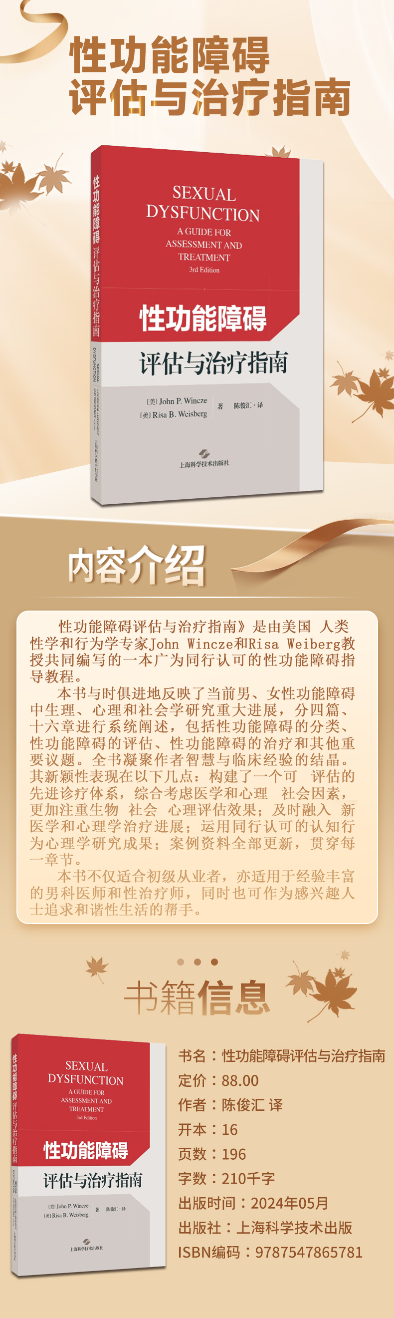 性功能障碍评估与治疗指南》是由美国 人类性学和行为学专家John Wincze和Risa Weiberg教授共同编写的一本广为同行认可的性功能障碍指导教程。