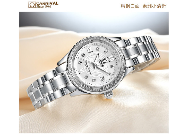 嘉年华(Carnival)女士手表 女表全自动机械表 钢带手链表 夜光防水时尚腕表情侣手表8629L