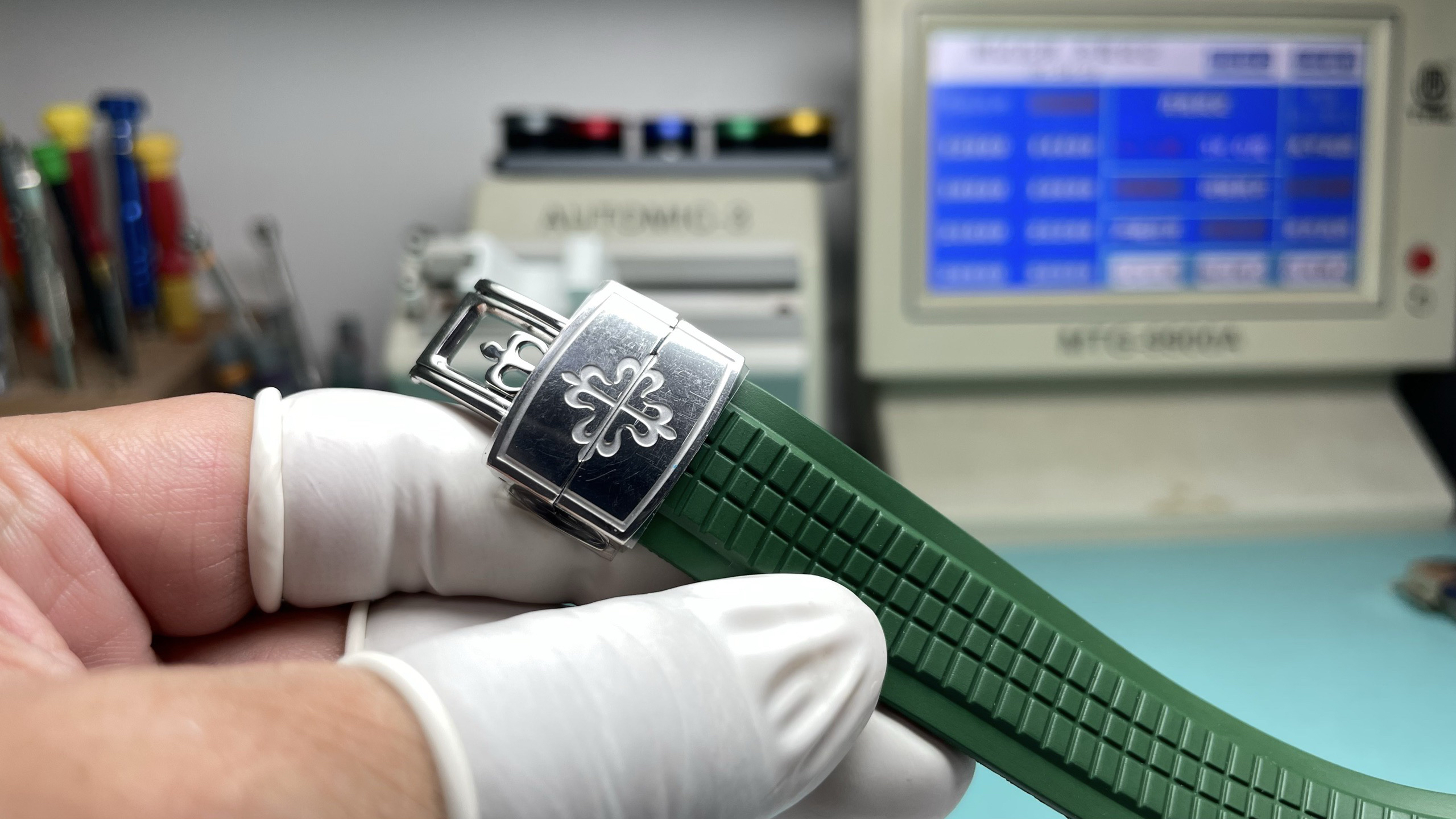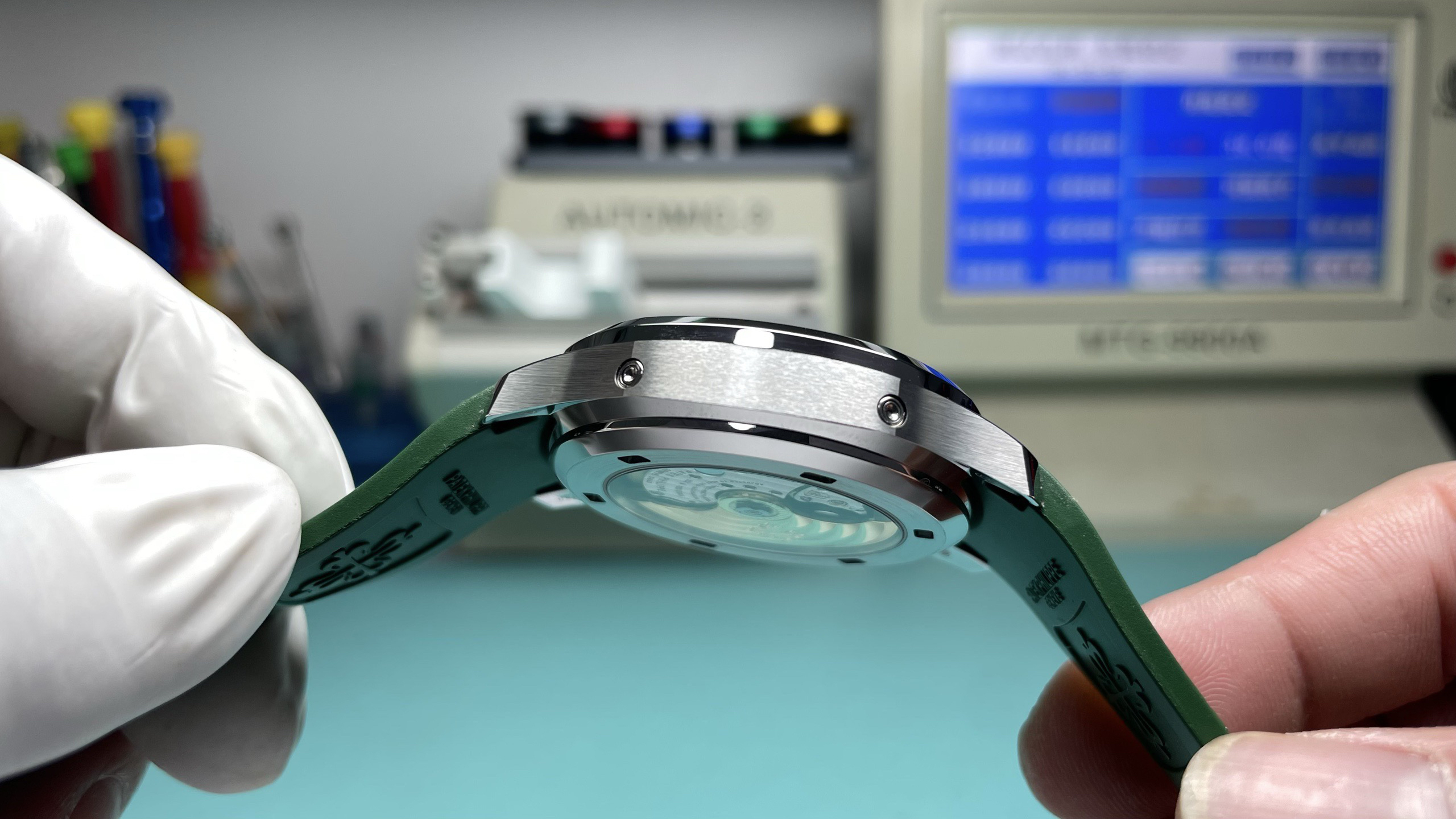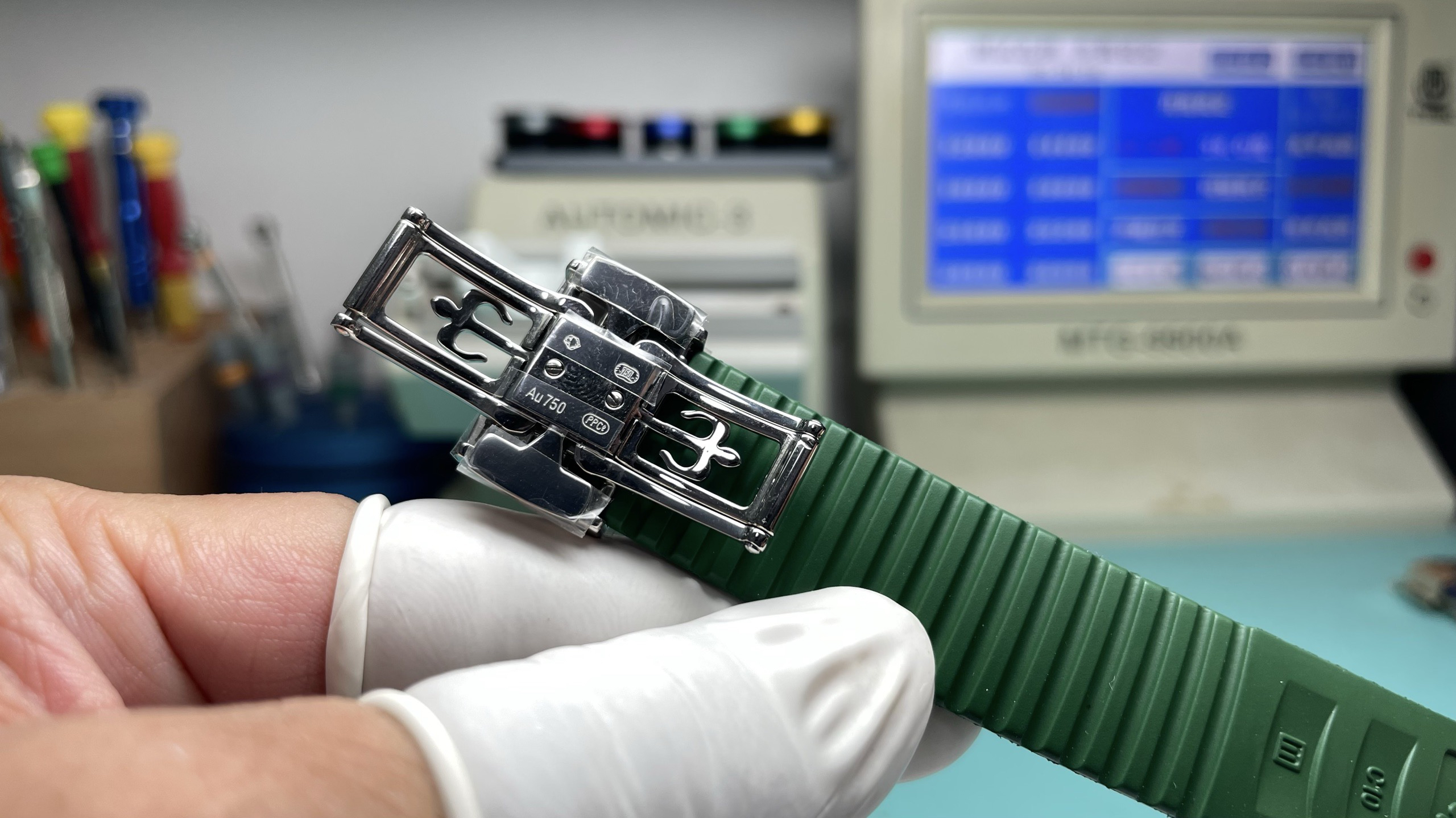 1️⃣ 原装对版氟橡胶带开模,舒适佩戴,全天适配,定制氟橡胶表带柔软亲肤,抗磨耐用性升级;折叠式表扣一键调节,扣子背面打印贵金属清晰标识印记,圣伯纳狗头🐶轮廓内天平⚖️标识.Au750数字.PPC标志,蓝宝石玻璃,商务休闲无缝切换,诠释"优雅随行"的佩戴哲学。
