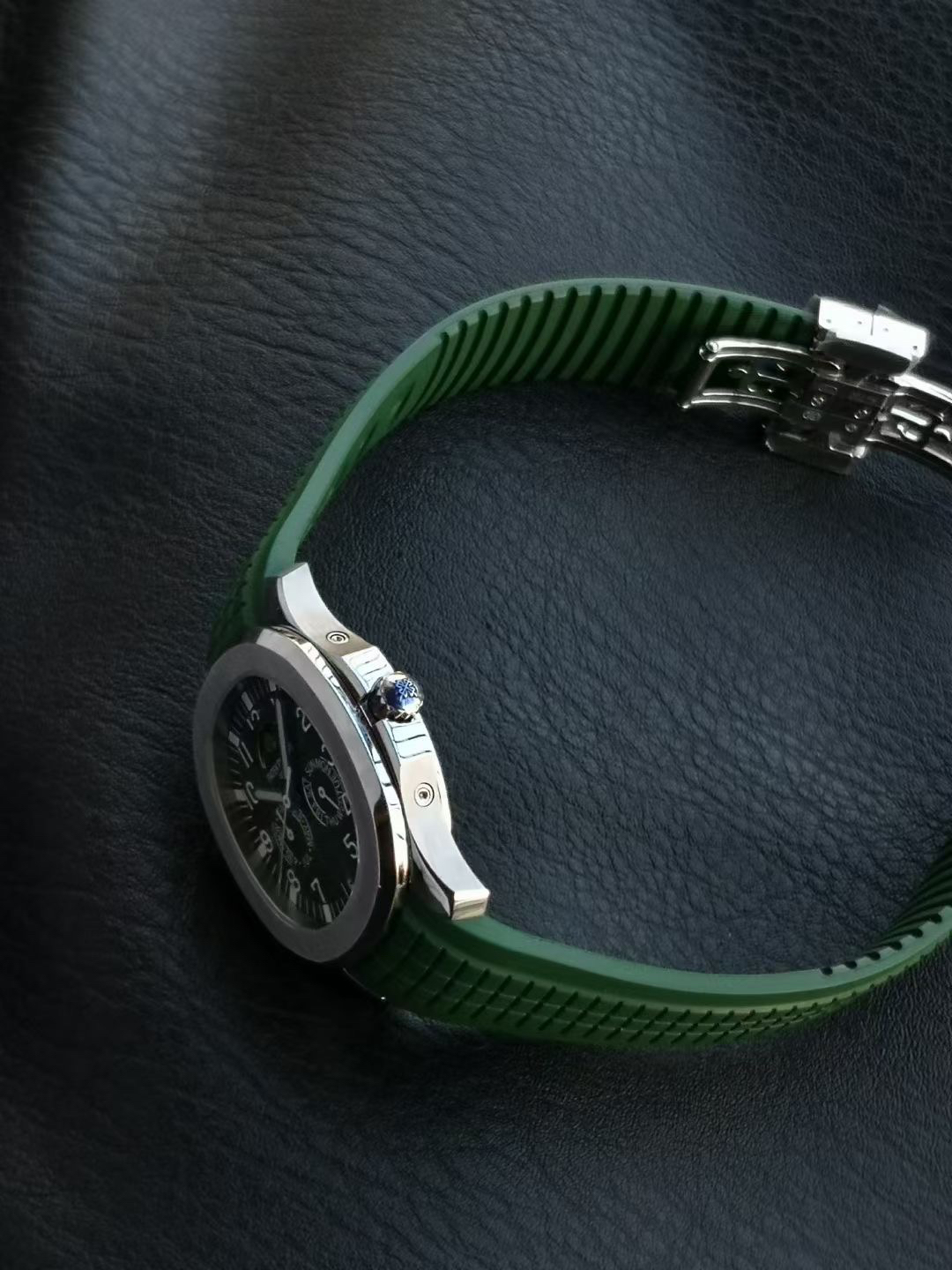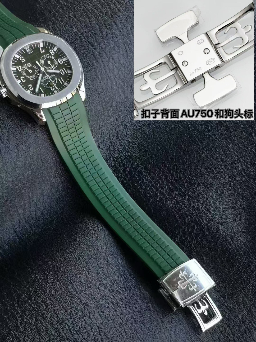 one ️⃣ The original version of the fluororubber strap is molded, comfortable to wear, and suitable for all day use. The customized fluororubber strap is soft and skin friendly, with upgraded wear resistance and durability; Folding clasp with one click adjustment, printed with clear precious metal identification marks on the back of the clasp, and featuring a St. Bernard dog head 🐶 Contour balance ⚖️ identification. Au750 digits PPC logo, sapphire glass, seamless transition between business and leisure, interpreting the wearing philosophy of "elegant and accompanying".