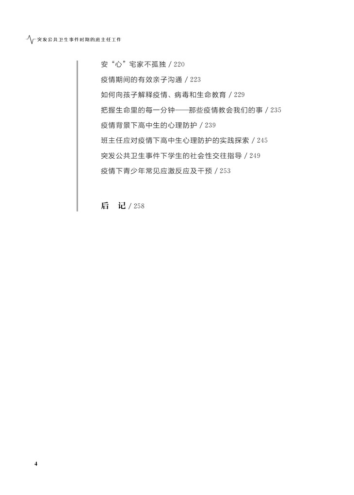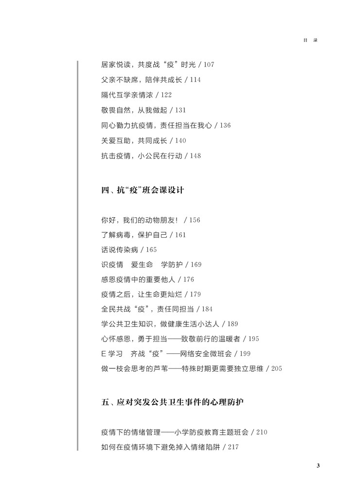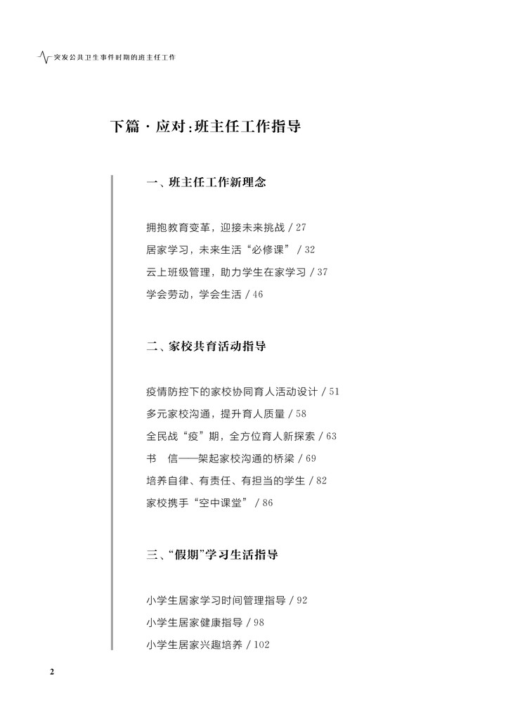 防控疫情将认识与应对突发公共卫生事件推到教育的前台,居家生活与学习将学校教育与家庭、社会教育有机地联系在一起,拓展了班主任工作的时间、空间和内涵。本书在对防控疫情期间的教师生活加以叙事呈现的基础上,提炼出应对突发公共卫生事件的诸多教育议题,生成班主任工作新理念,并围绕家校共育指导、居家学习生活指导、抗“疫”主题班会以及心理防护等内容,构建了班主任工作指导的维度和要素,同时采用理论阐述、活动指导、案例分析、研究性学习指导等多样化的形式予以呈现,以期为广大一线班主任提供应对突发公共卫生事件的创新性工作方法与策略,从而既有利于提升师生应对突发公共卫生事件的能力和水平,助力培育良好的公民素养,又为后疫情时期更好地实现家庭、学校、社会的融合教育提供了实践智慧,具有很强的理论指导和实践价值。