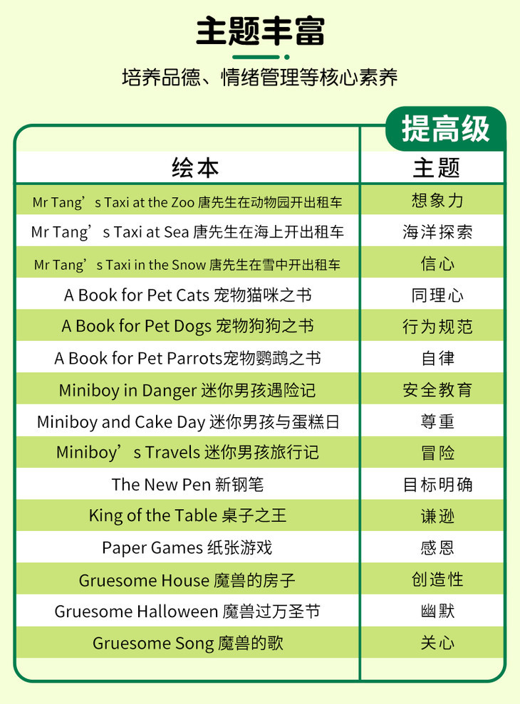本系列“提高级”包含15册英文绘本,附音频二维码,适合给有一定英语基础的幼儿及小学中高年级的学生进行指导性阅读。