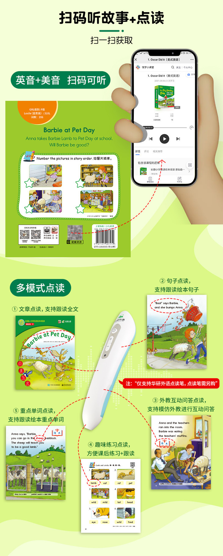 绘本故事提供英音和美音两种录音,重点词汇、互动问答、趣味练习等由美国外教示范朗读,手机扫描二维码即可在线听音,也可使用配套点读笔互动学习。