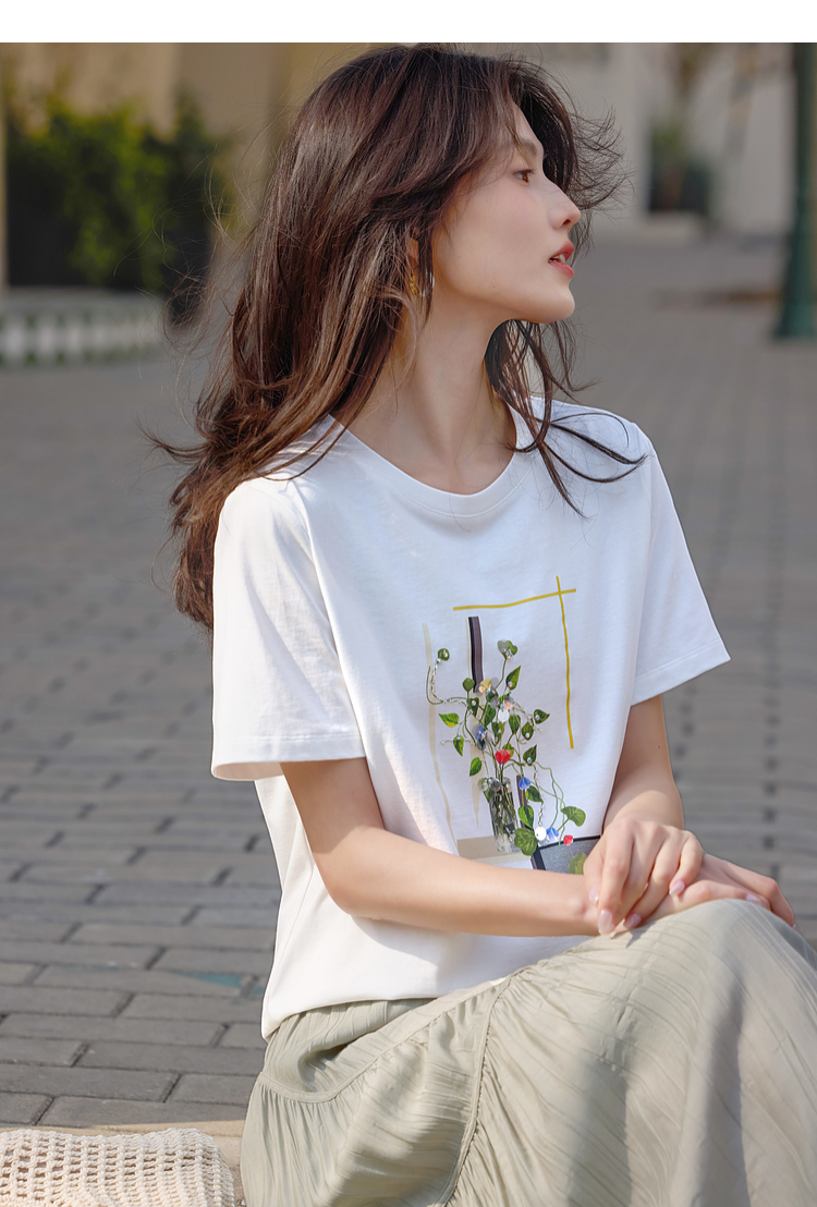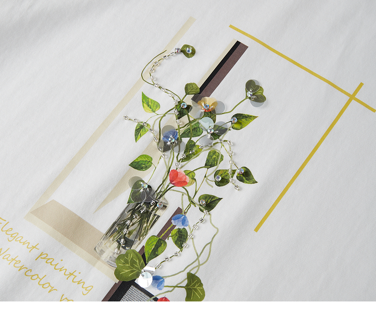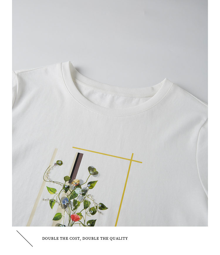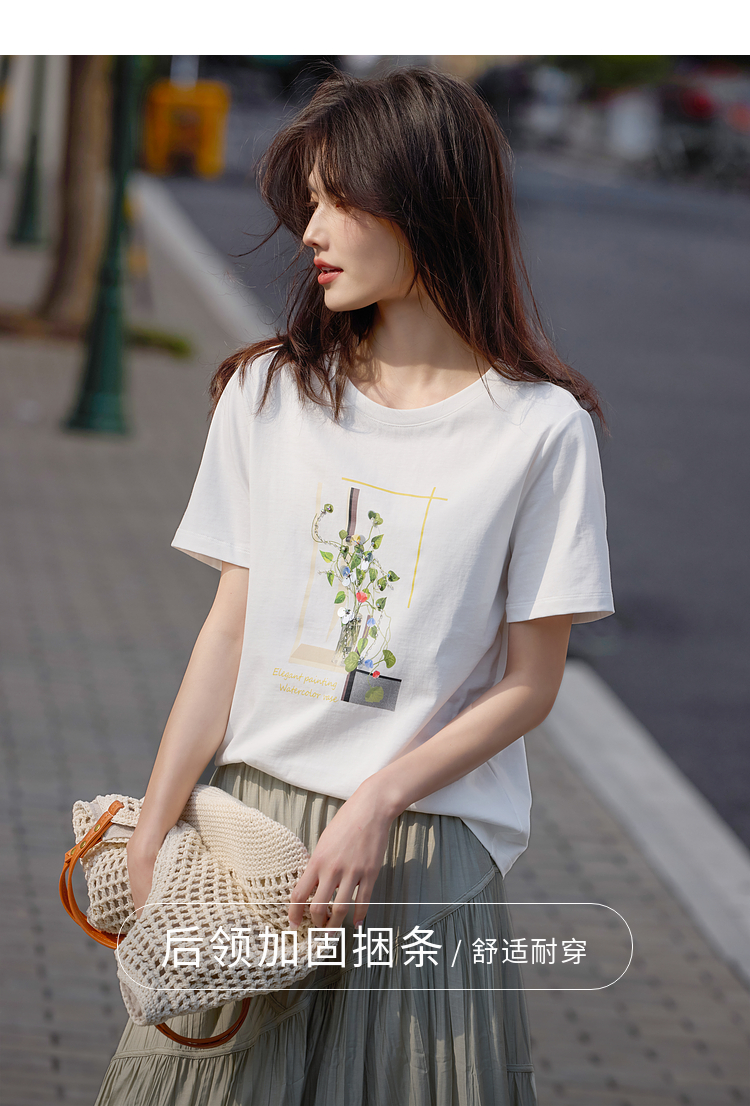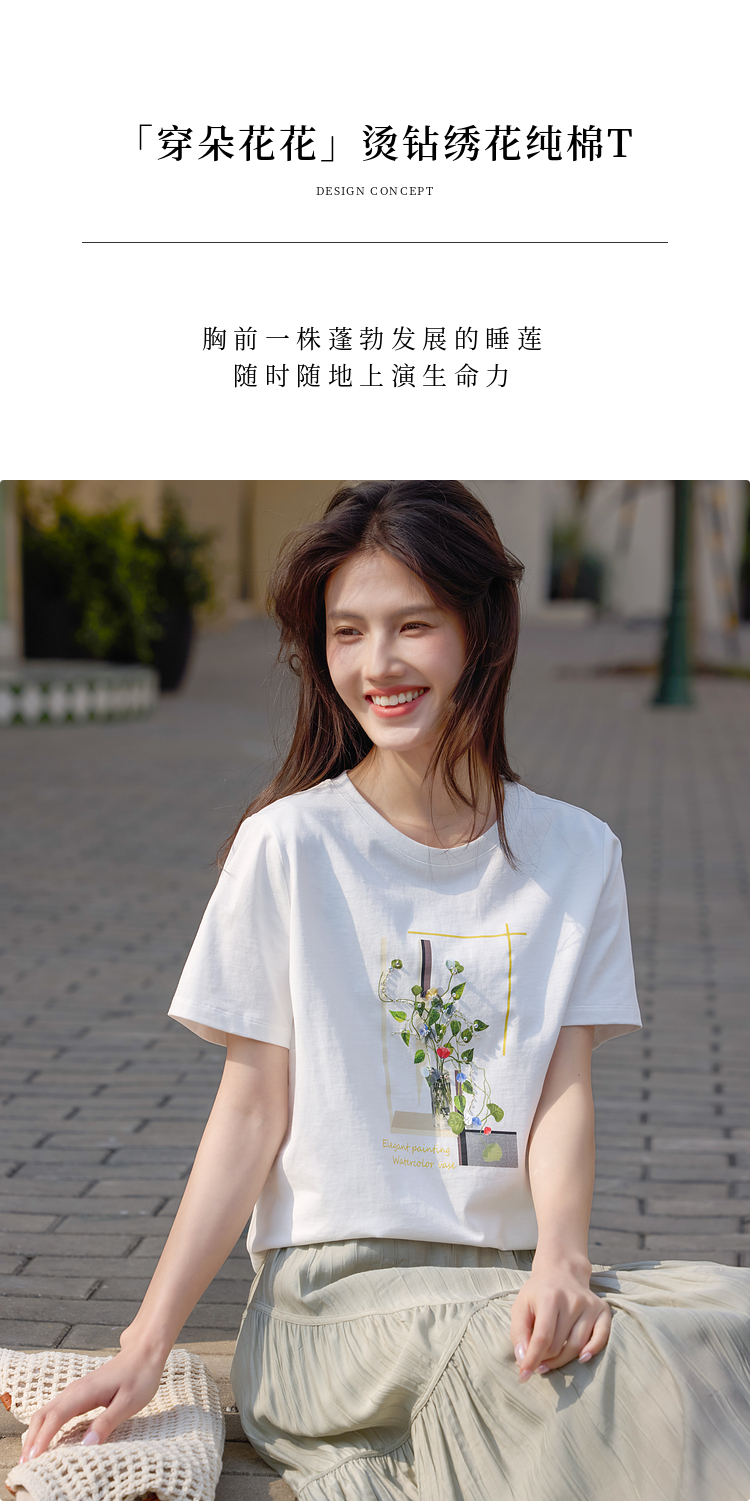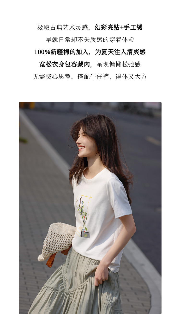 【专属特价】熙世界100%长绒棉T恤女短袖夏新款宽松烫钻绣花圆领正肩体恤上衣