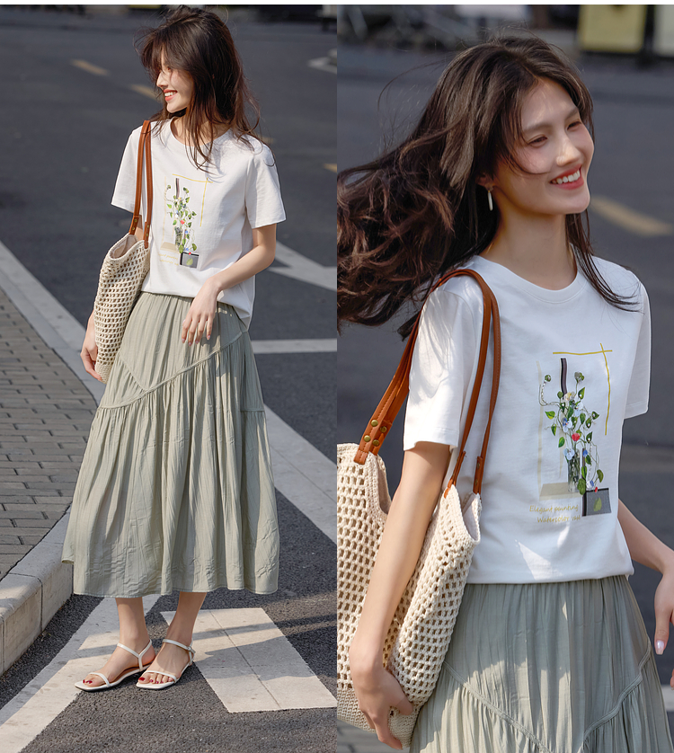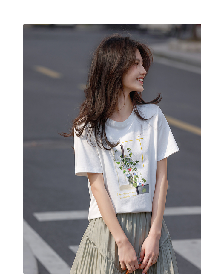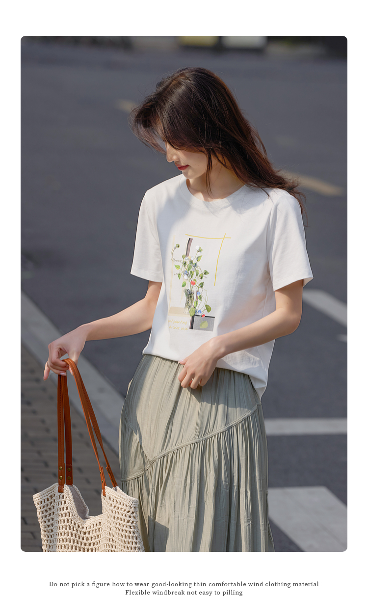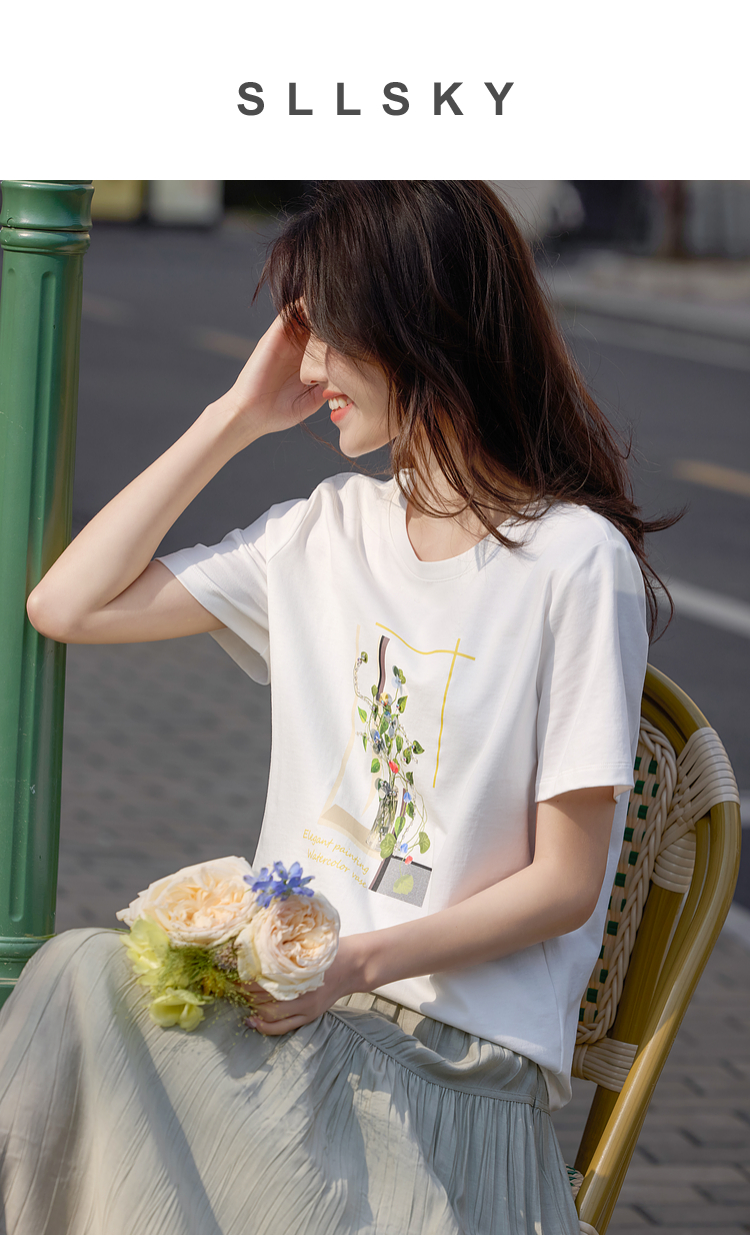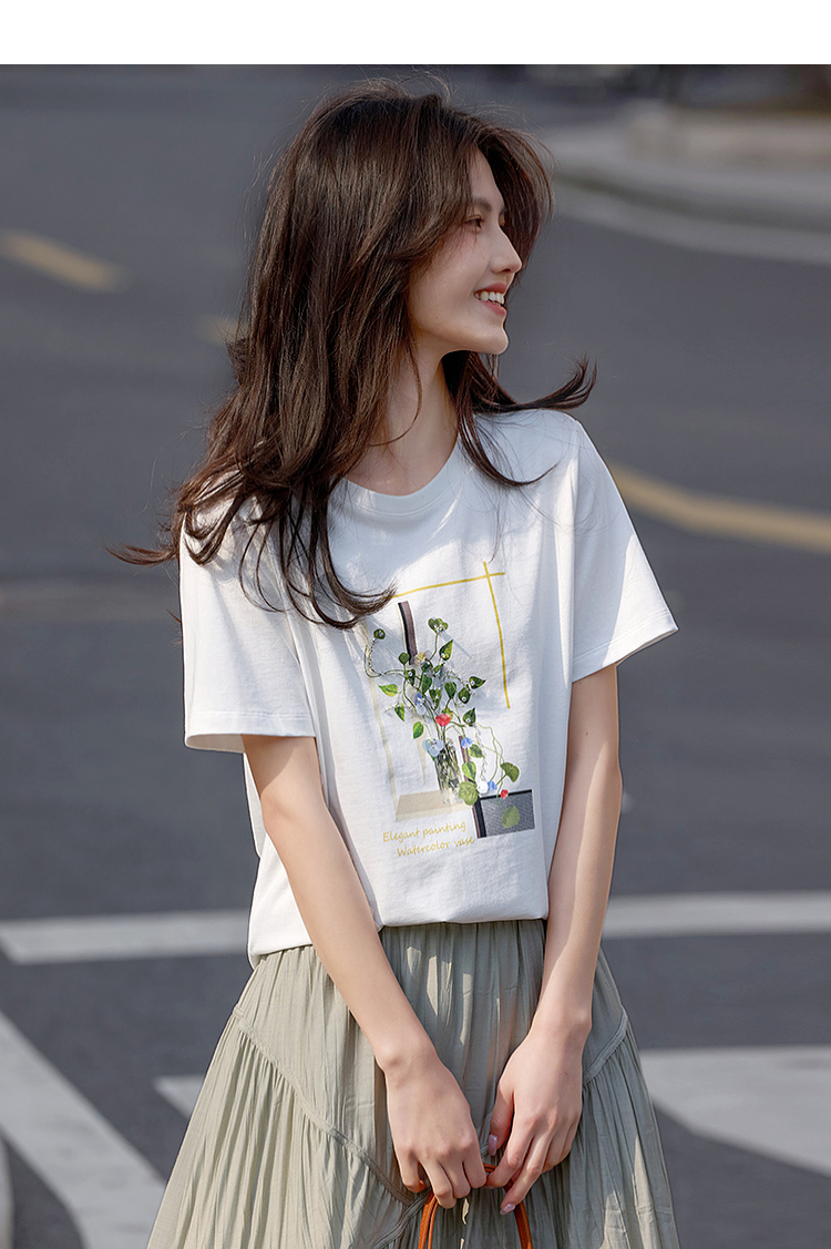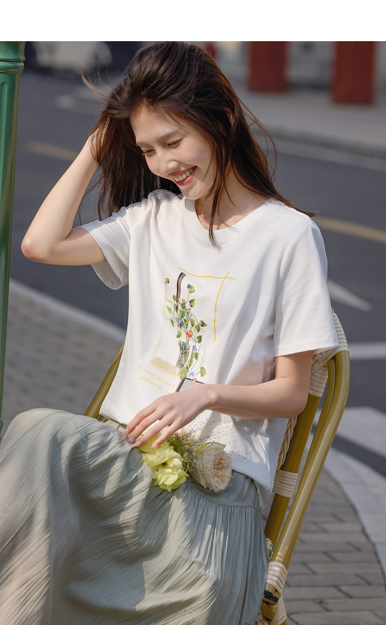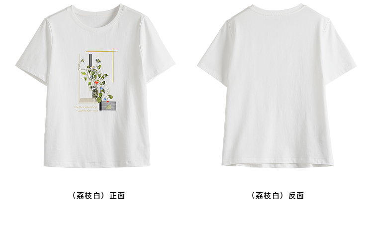 【专属特价】熙世界100%长绒棉T恤女短袖夏新款宽松烫钻绣花圆领正肩体恤上衣