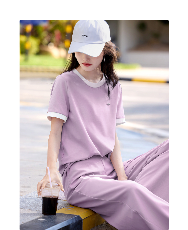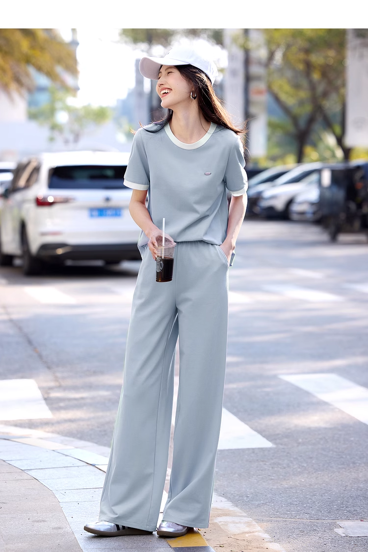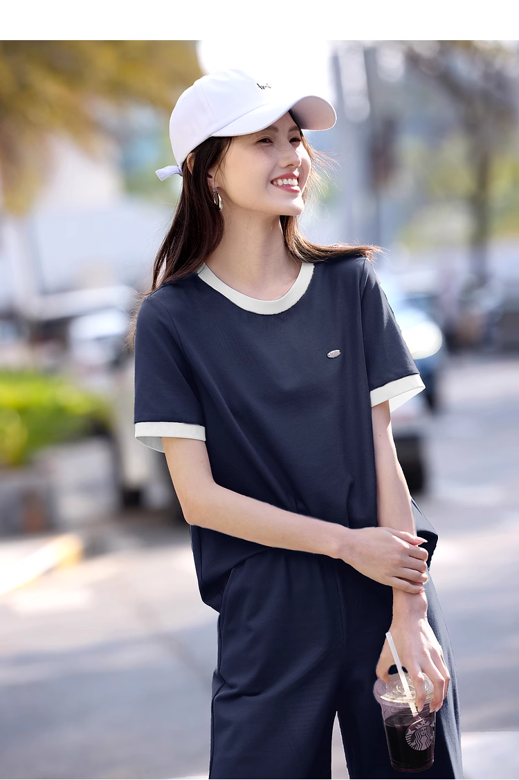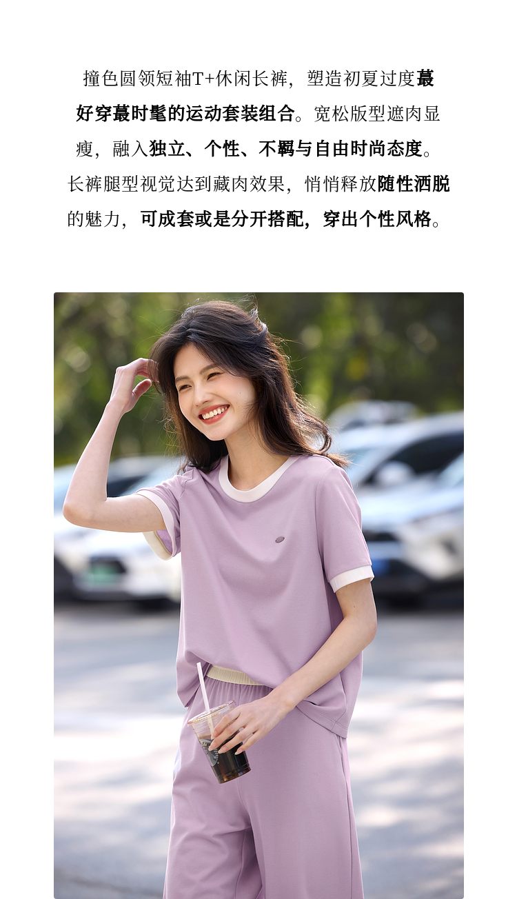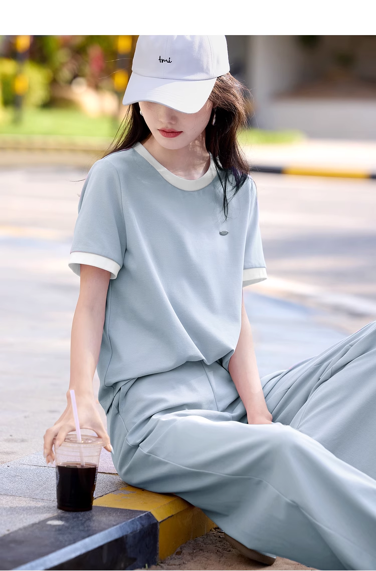 【专属特价】熙世界休闲套装女2025年夏季新款撞色圆领短袖T恤直筒长裤两件套