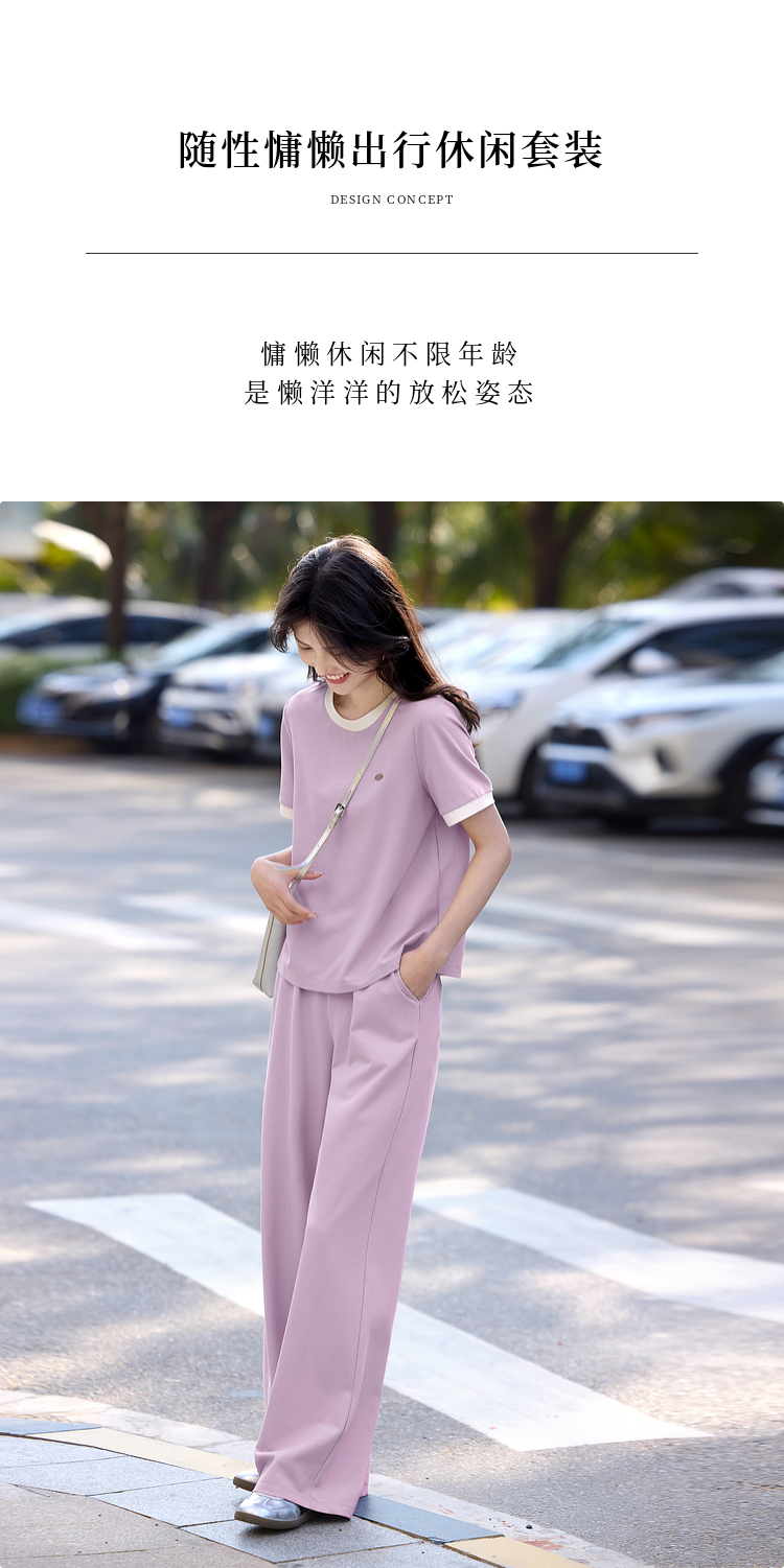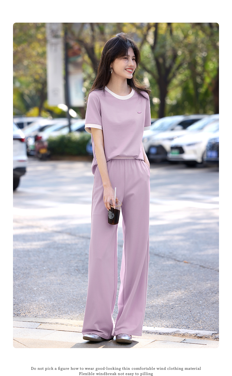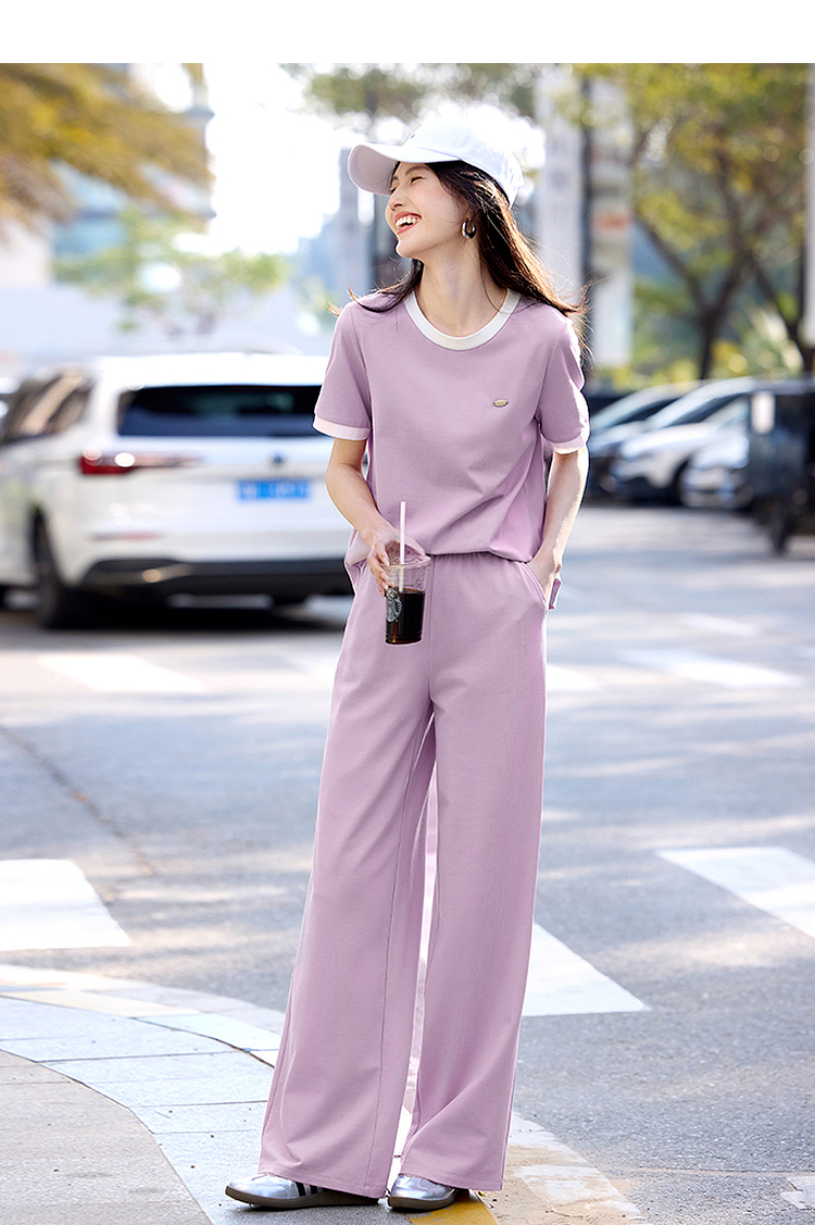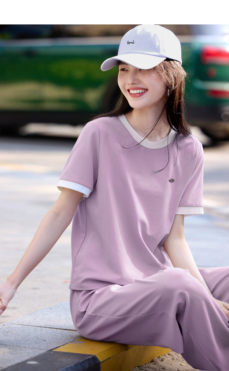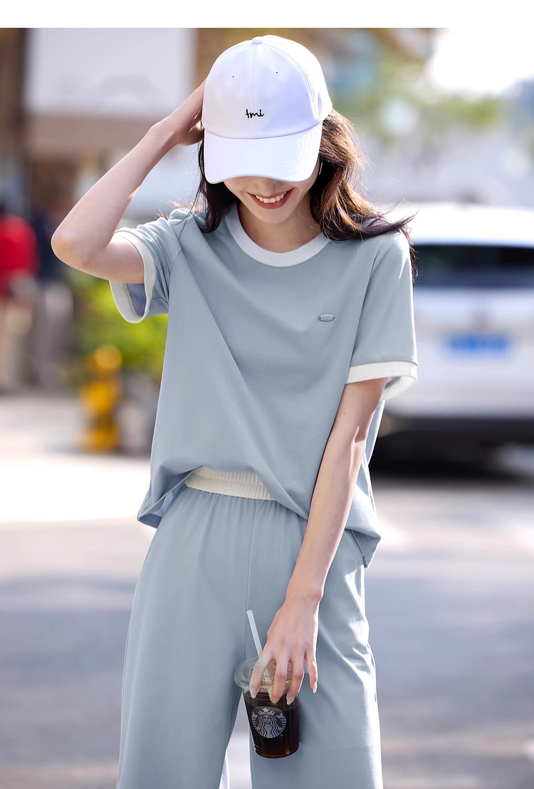 【专属特价】熙世界休闲套装女2025年夏季新款撞色圆领短袖T恤直筒长裤两件套