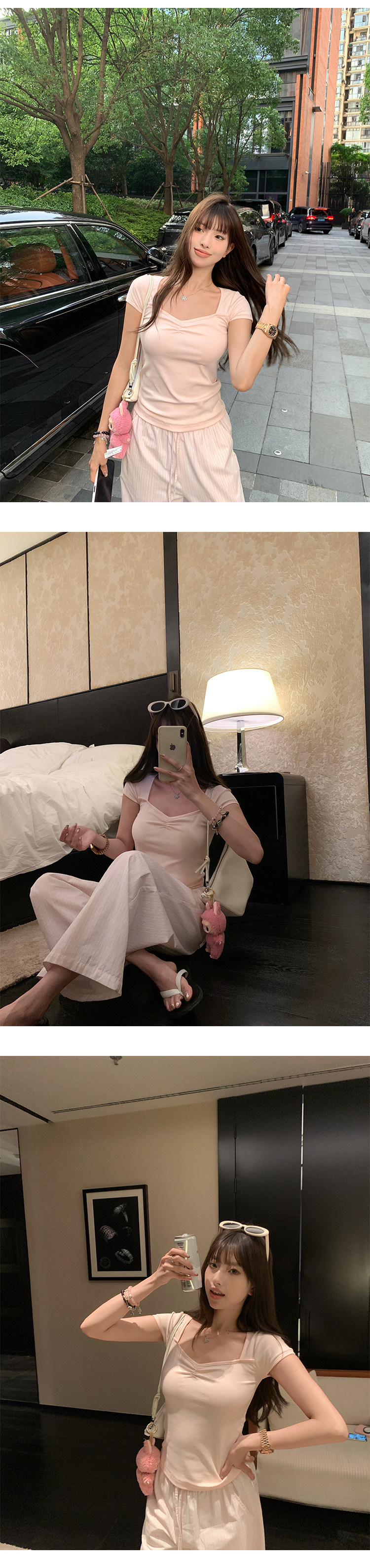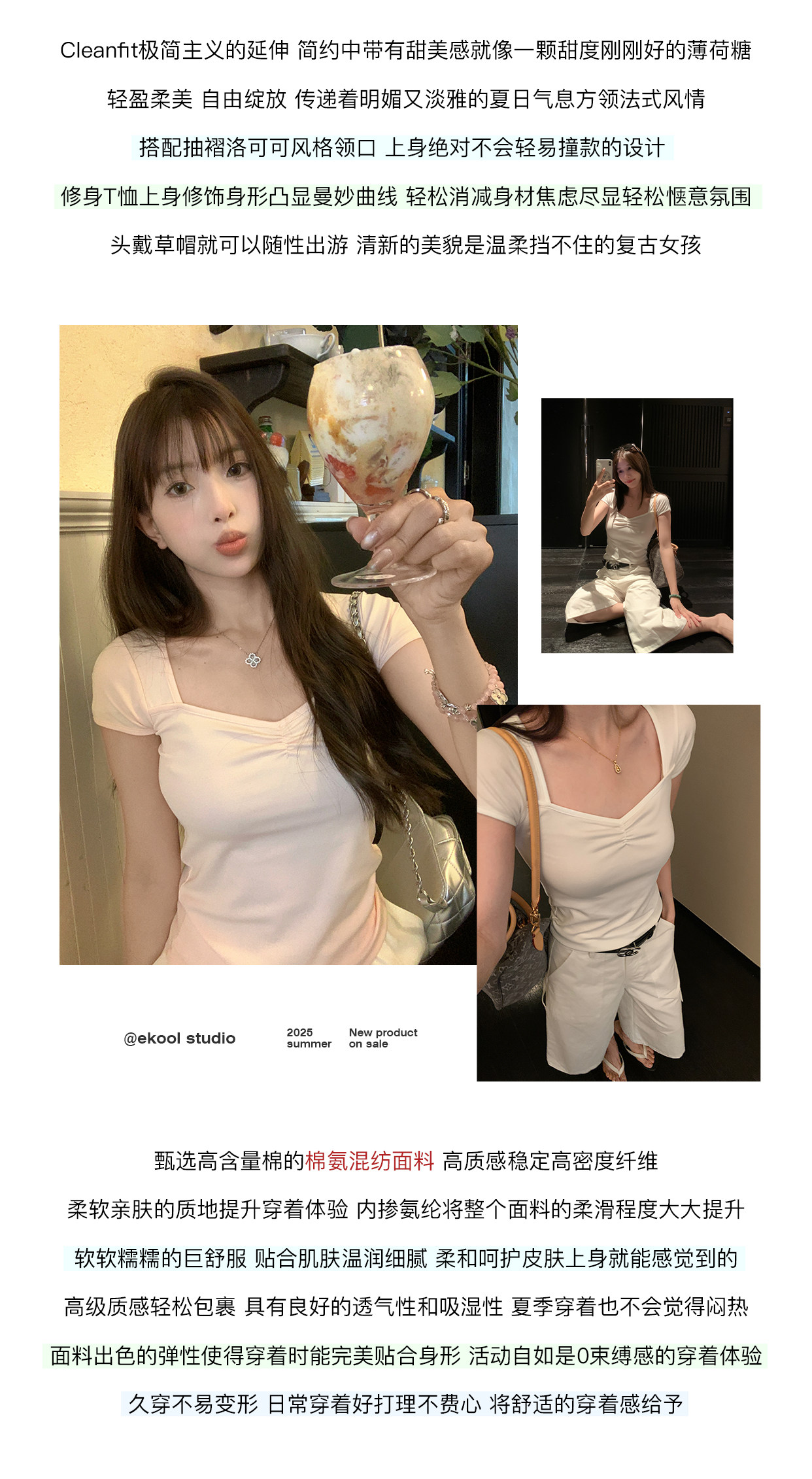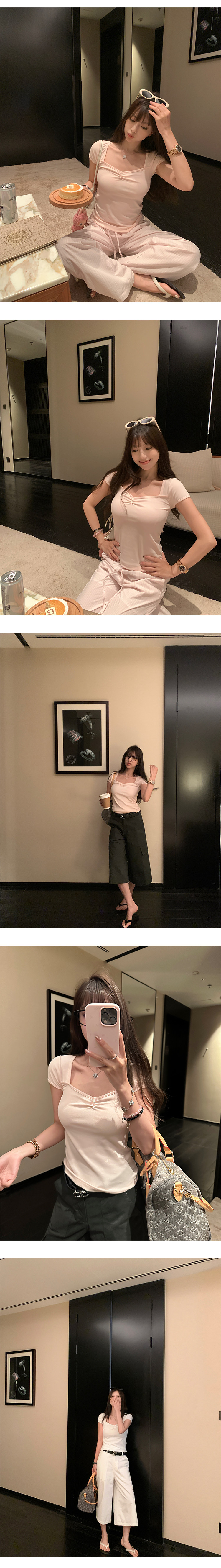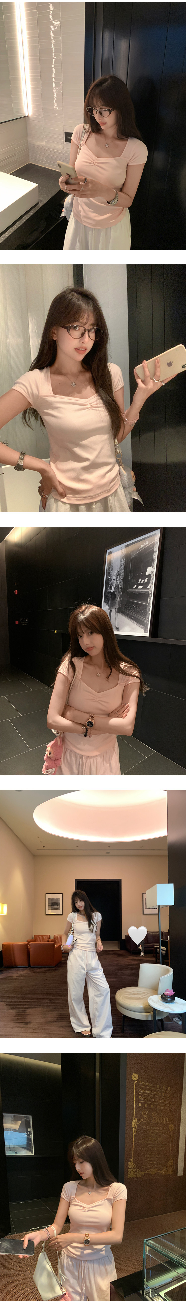 EKOOL衣库 方领短袖T恤女夏季2025新款抽褶设计百搭显瘦休闲上衣