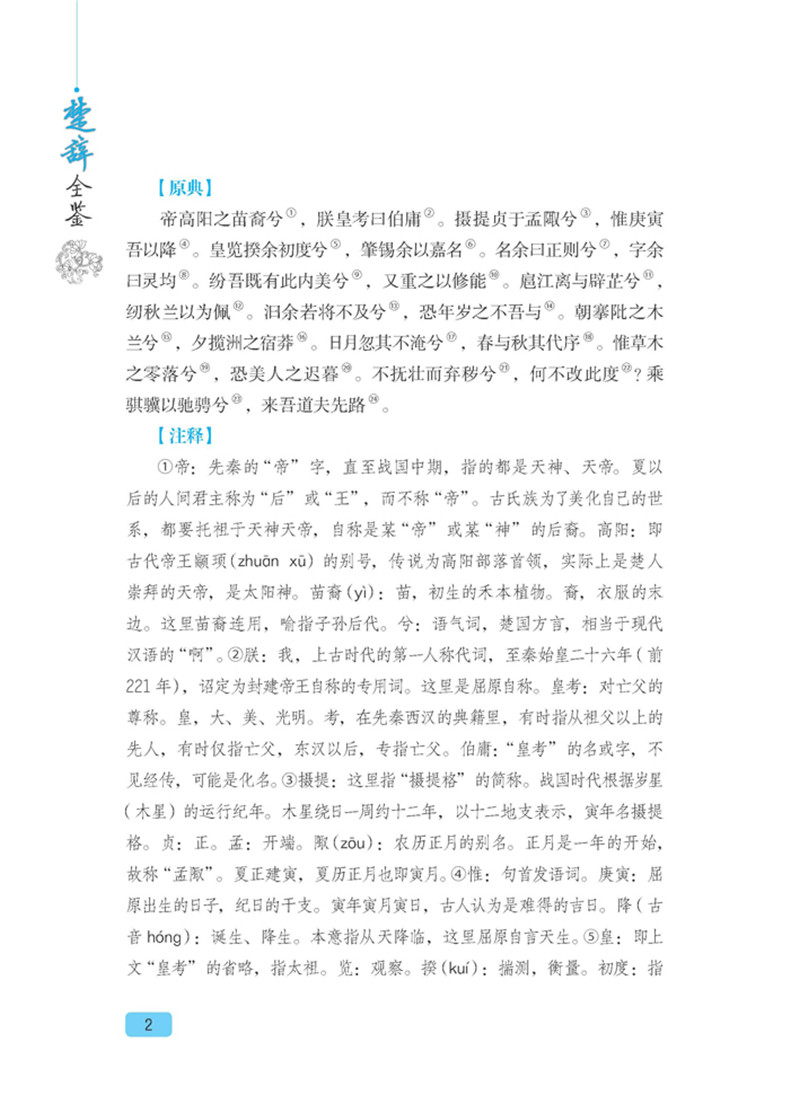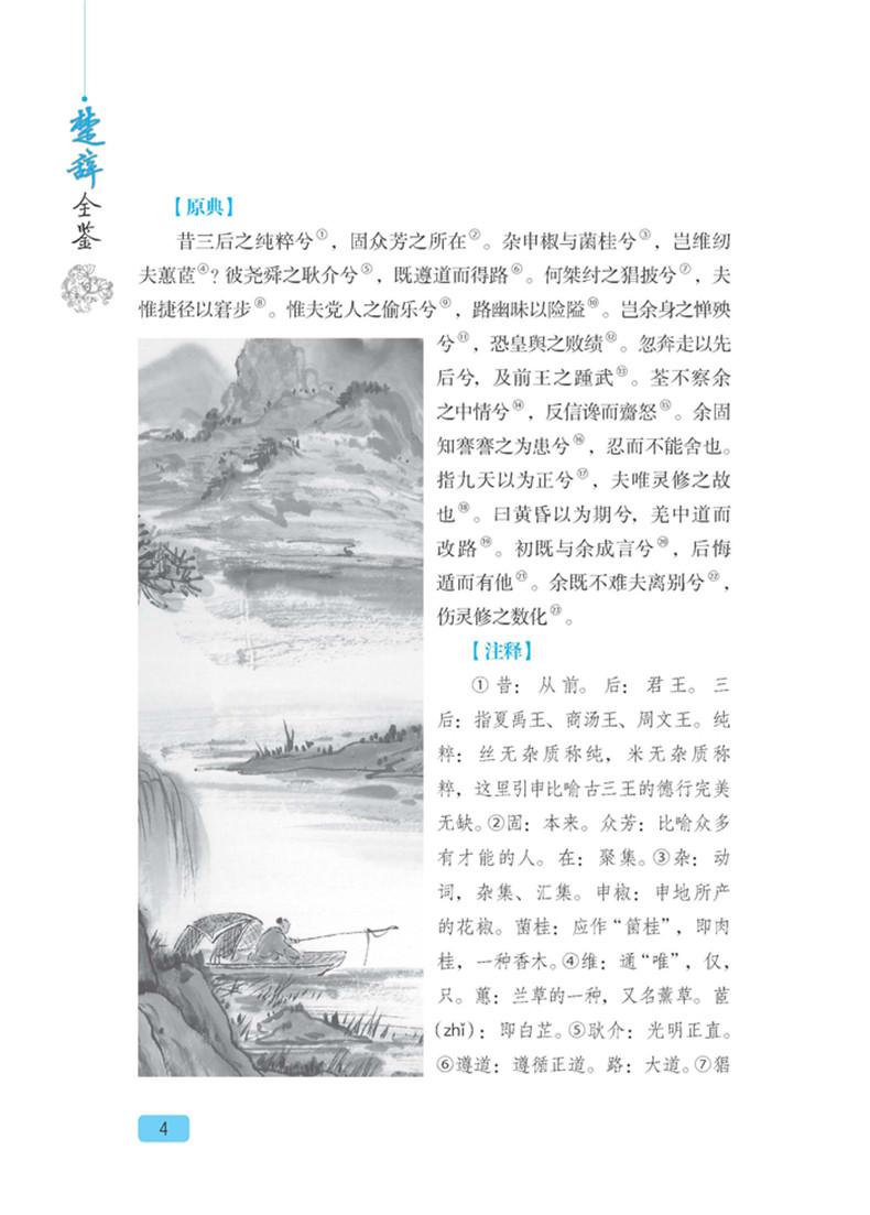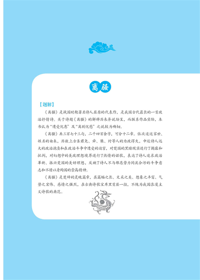 《楚辞》是我国第一部浪漫主义诗歌和骚体类文章总集。《楚辞全鉴》以屈原作品为主,其余各篇也是承袭屈赋的形式。其运用楚地的文学样式、方言声韵和风土物称等,具有浓厚的地方色彩,故名《楚辞》。《楚辞》开创了中国浪漫主义文学诗篇之先河,是继《诗经》之后,对中国文学最具深远影响的一部诗歌总集。