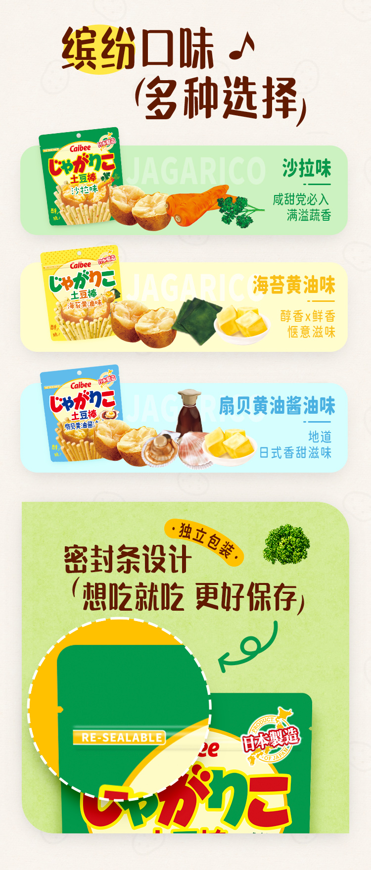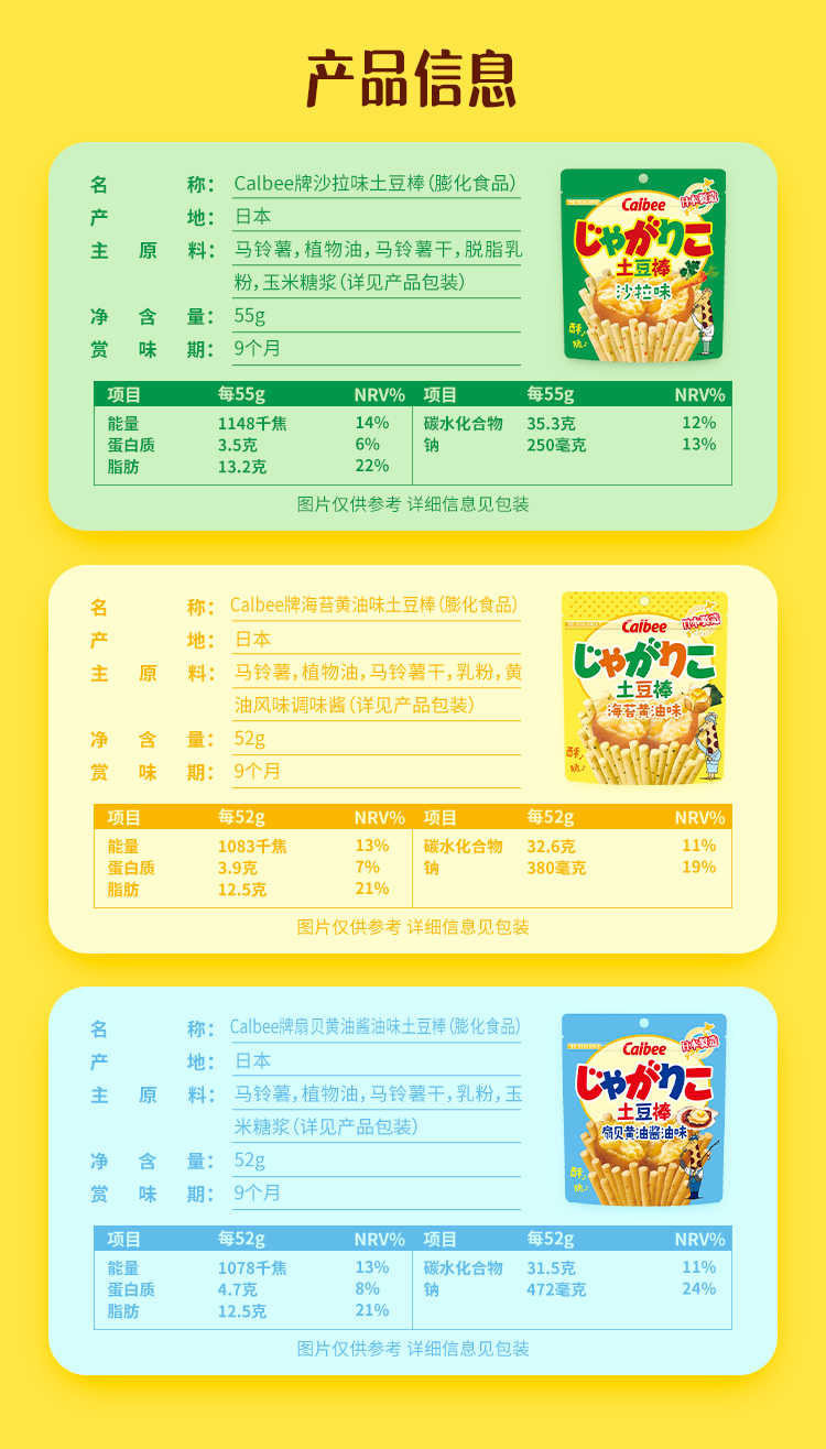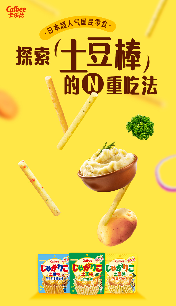 Calbee牌色拉味土豆棒55g/黄油味土豆棒52g/扇贝黄油酱油味土豆棒52g 口感酥脆越嚼越有味 152228/152229/152230