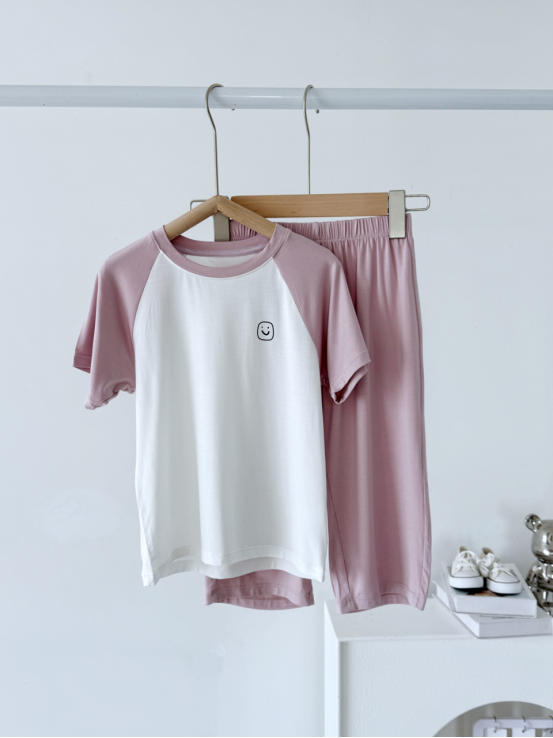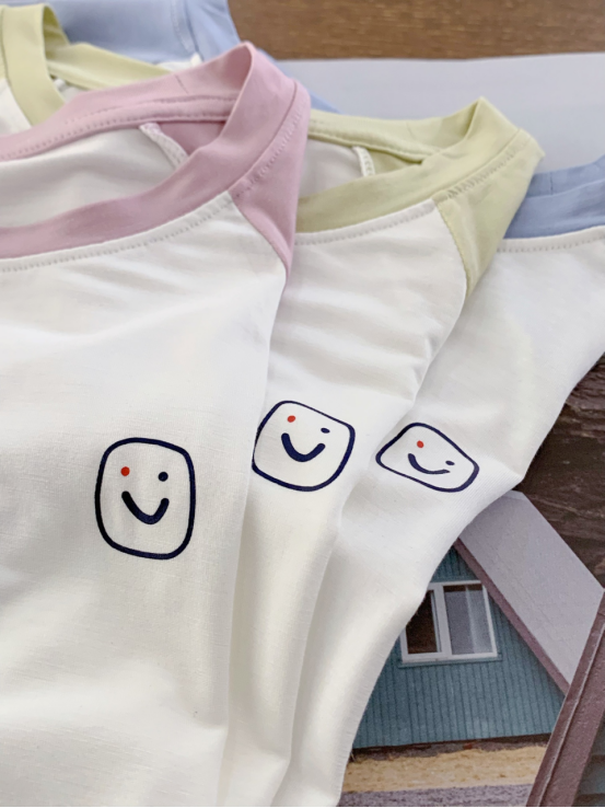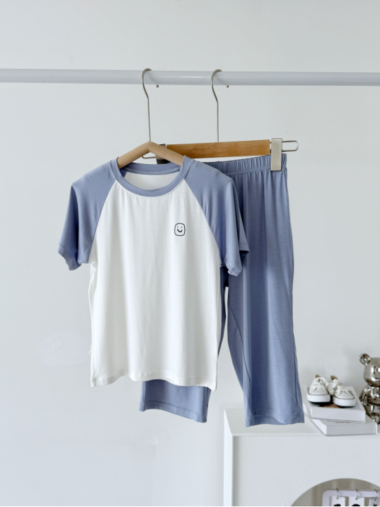 第1款 :笑脸短袖套装 四针工艺套装 无骨缝合 七分裤的设计保护宝宝的膝盖不受伤害 ✔️无骨缝制工艺,贴身穿舒适,亲肤好眠 ✔️面料冰感透气,柔软亲肤有弹性,透气不闷 ✔️ 远超婴幼儿标准,环保无负担,无荧光剂、无甲醛.