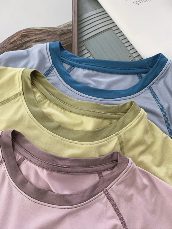 笑脸款上衣细节!撞色插肩袖/领口设计,更加吸睛, 活动空间更加充足,不拘束!后领同色面料包边条, 舒适度拉满~ 袖口下摆,走线清晰细密,不易开线~