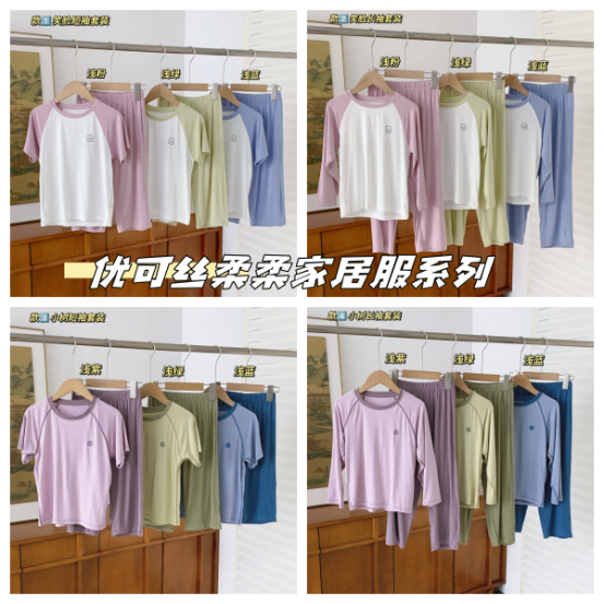 优可丝®是一种纯天然的面料! 100%优质木源原料中提取优质纤维素纤维,安全性和舒适性更高,而且特别环保可完全降解♻️循环再生 🔅具有不易褪色、不起球等优点。 柔软肤感/自由呼吸/不怕静电 一款让你无限回购的家居服套装! 优可丝 超柔柔柔柔柔~ 四个冰淇淋🍦色系拼袖 太奶呼呼了 奶油般触感 丝滑 所有宝贝都必须拥有!