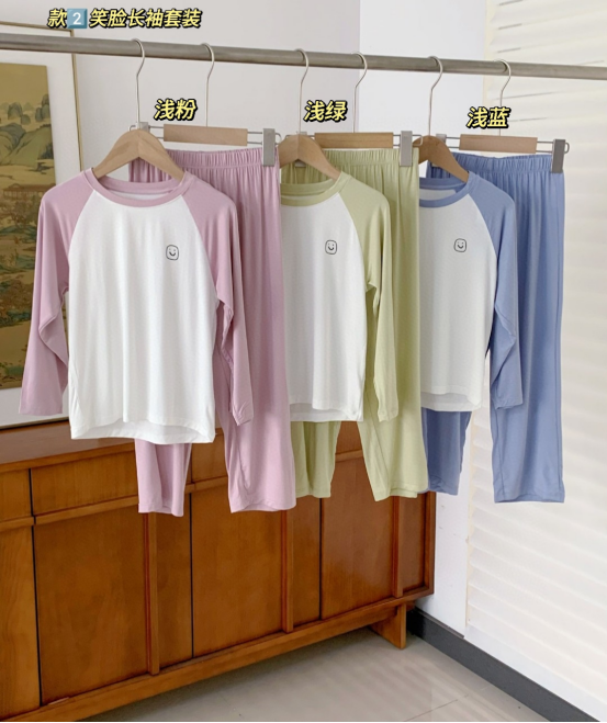 一共四款 有长袖长裤 短袖短裤 颜色也是各种各样 一年四季 有这个套装就够啦 ① 笑脸短袖套装 ② 笑脸长袖套装 ③ 小树短袖套装 ④ 小数长袖套装