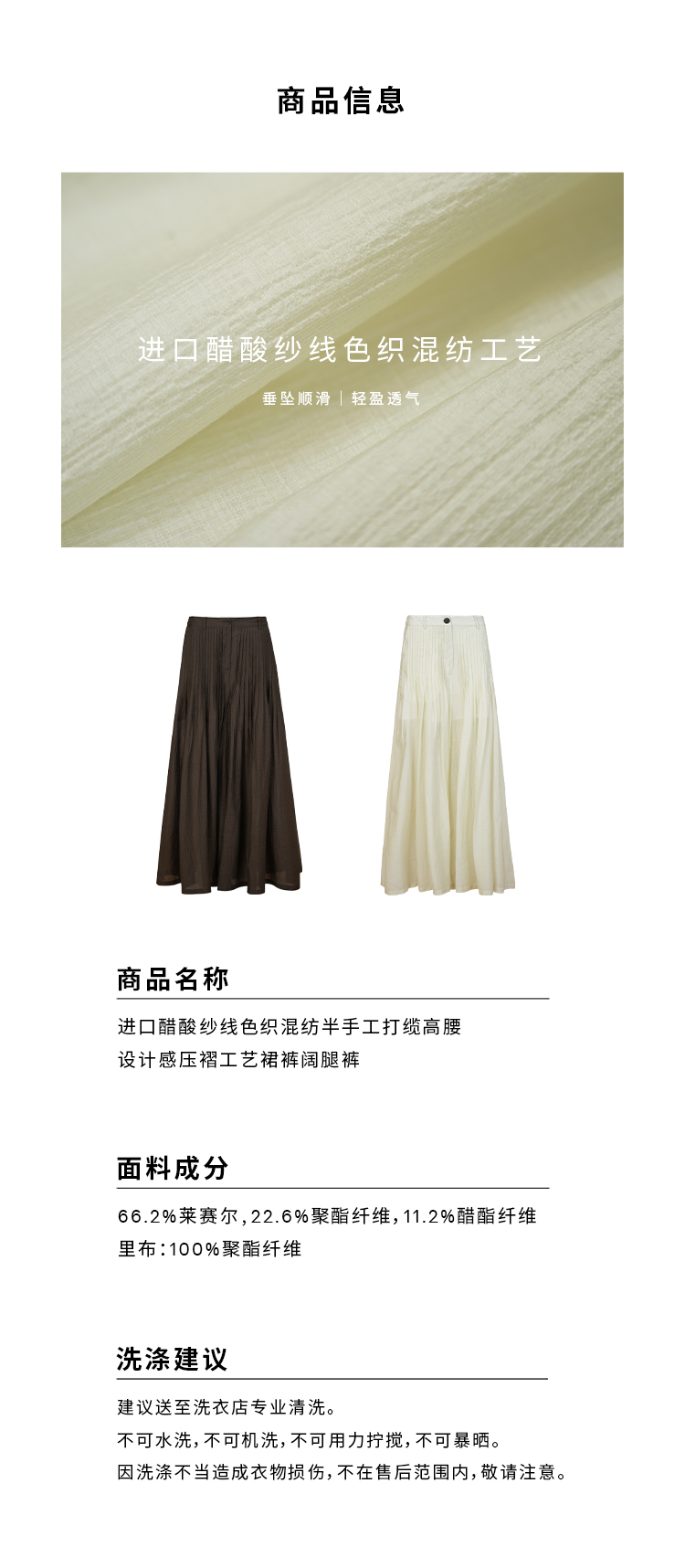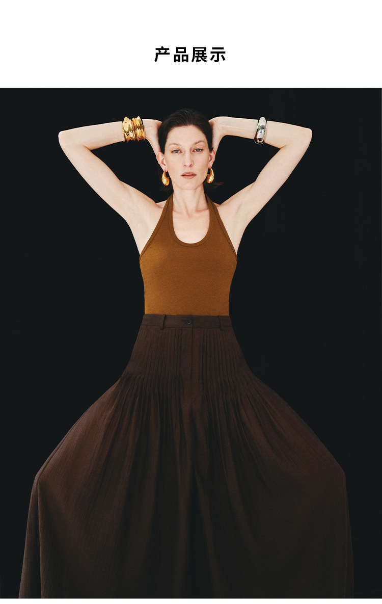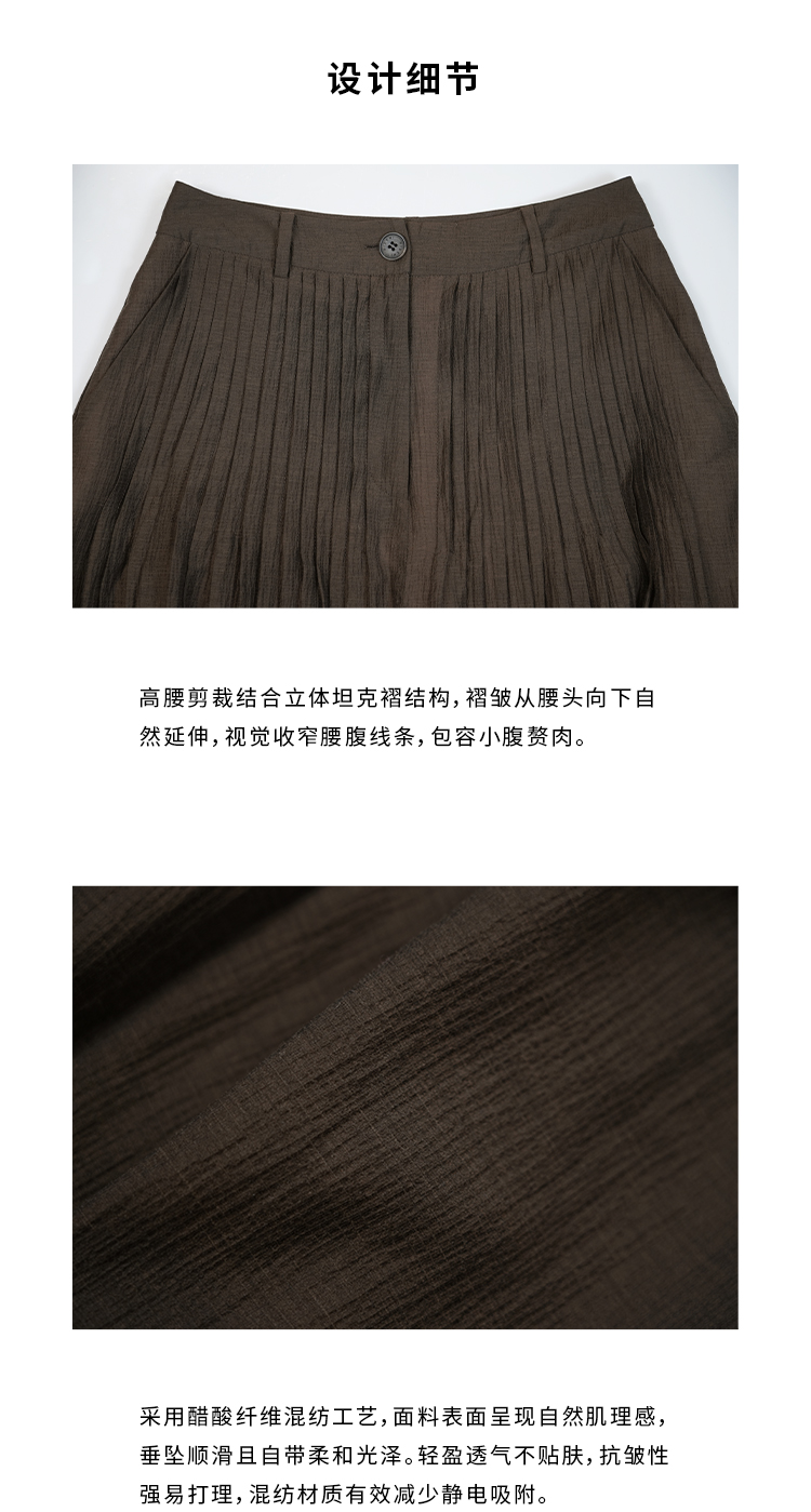 HIDEMI进口醋酸纱线色织混纺半手工打缆高腰设计感压褶工艺裙裤阔腿裤 乌木棕/杏仁绿