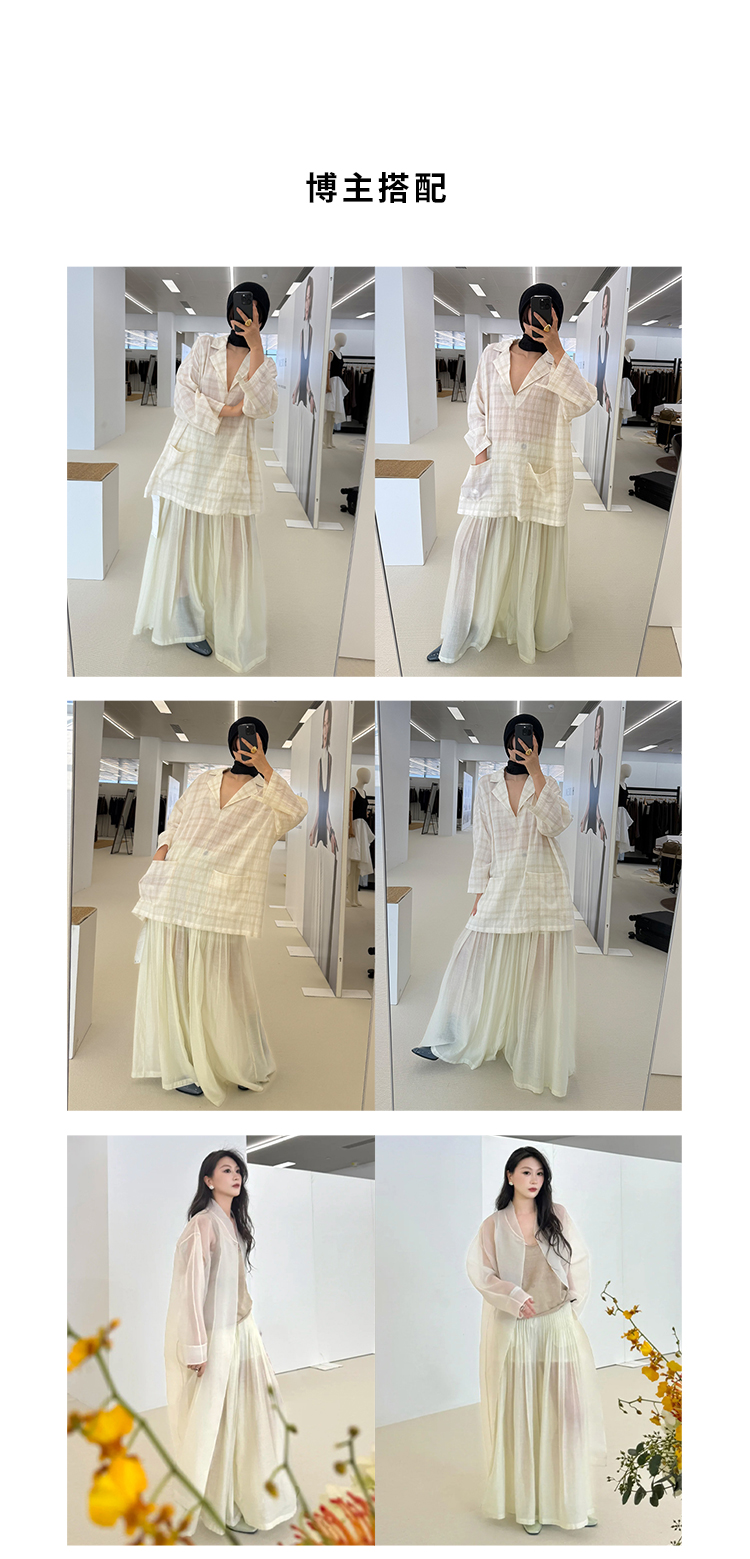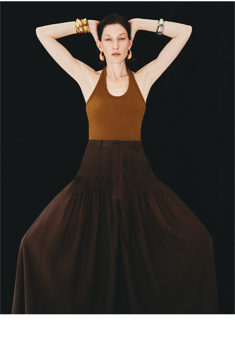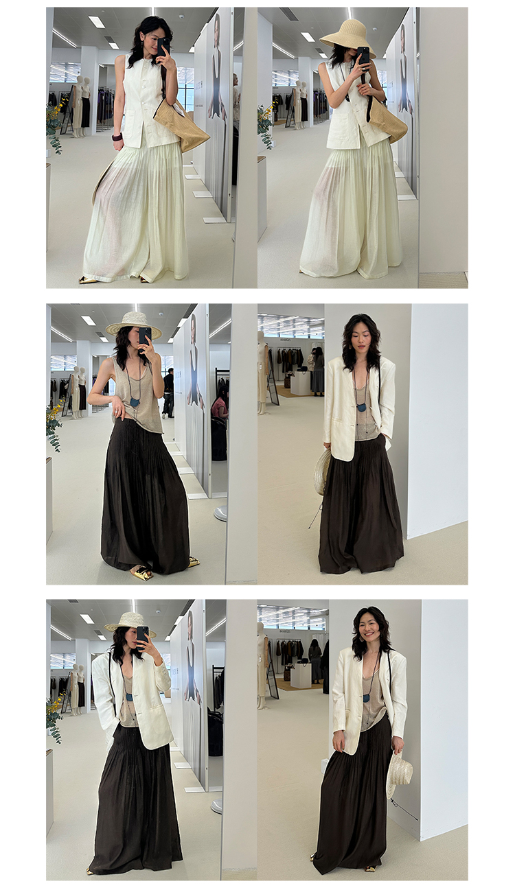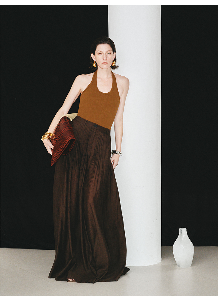 HIDEMI进口醋酸纱线色织混纺半手工打缆高腰设计感压褶工艺裙裤阔腿裤 乌木棕/杏仁绿