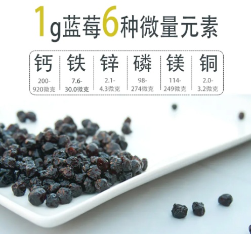 1g蓝莓就含有6种微量元素,钙,铁,锌,磷,镁,铜,是很多果干所不能做到的,除此之外,100g蓝莓干所含的花青素等于2400g猕猴桃或3200g梨所含有的花青素含量,爱美爱白的女孩子一定不能错过它