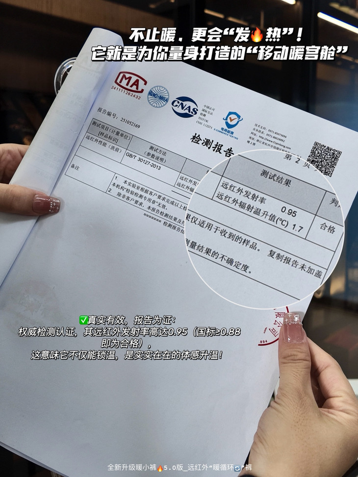 🎬✅真实有效,报告为证 权威检测认证,其远红外发射率高达0.95(国标≥0.88即为合格) 这意味它不仅能锁温,更搭载远红外「主动🔥发热」的黑科技,是实实在在的体感升温!
